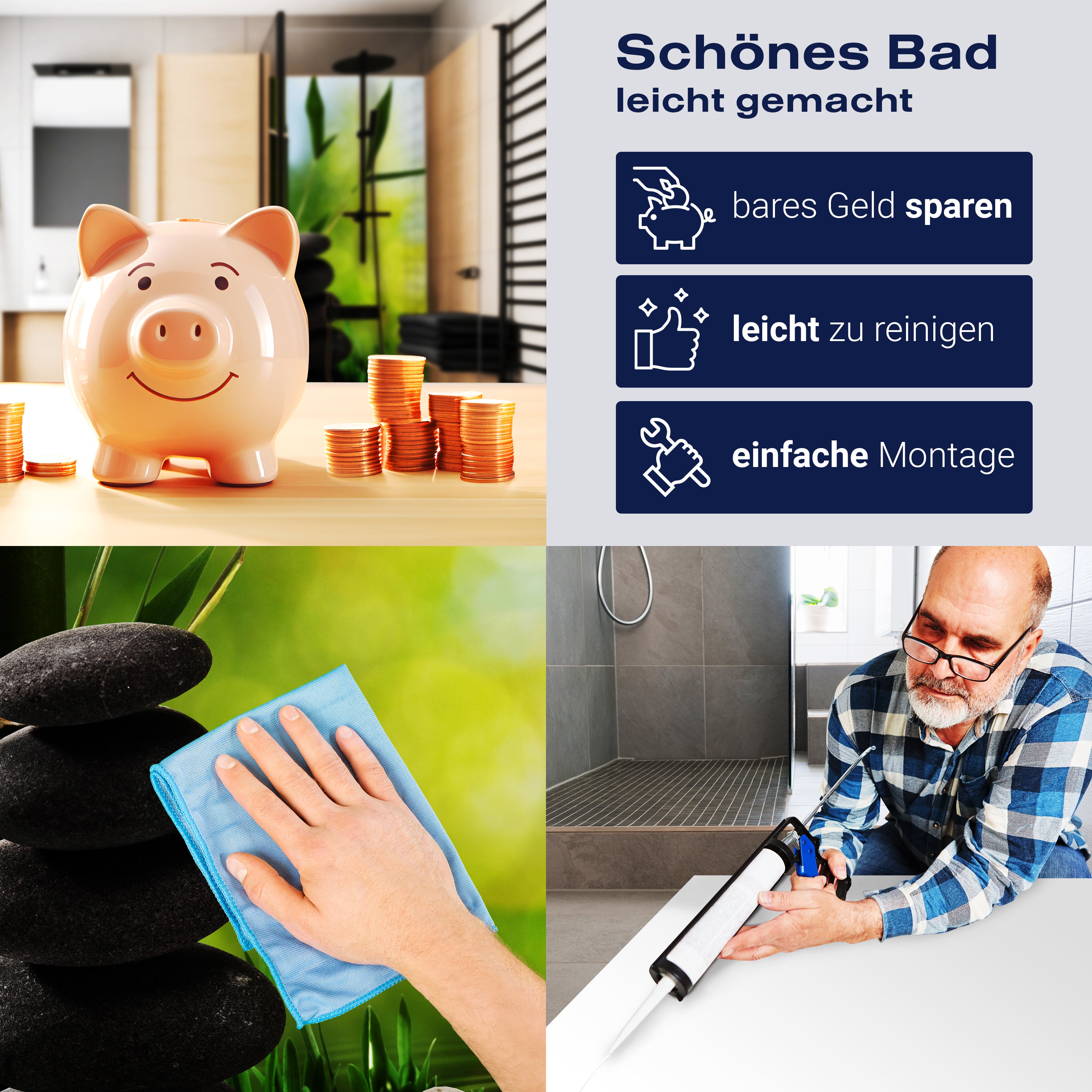 Diese Materialien bieten im Vergleich zu traditionellen Fliesen mehrere Vorteile. Sie haben eine fugenlose Oberfläche, was bedeutet, dass sie weniger anfällig für Schimmelbildung und leichter zu reinigen sind, da sich Schmutz und Kalk nicht in Fugen festsetzen können. Darüber hinaus ermöglichen sie eine schnelle und einfache Renovierung, da sie direkt über bestehenden Fliesen montiert werden können, was Zeit und Kosten spart