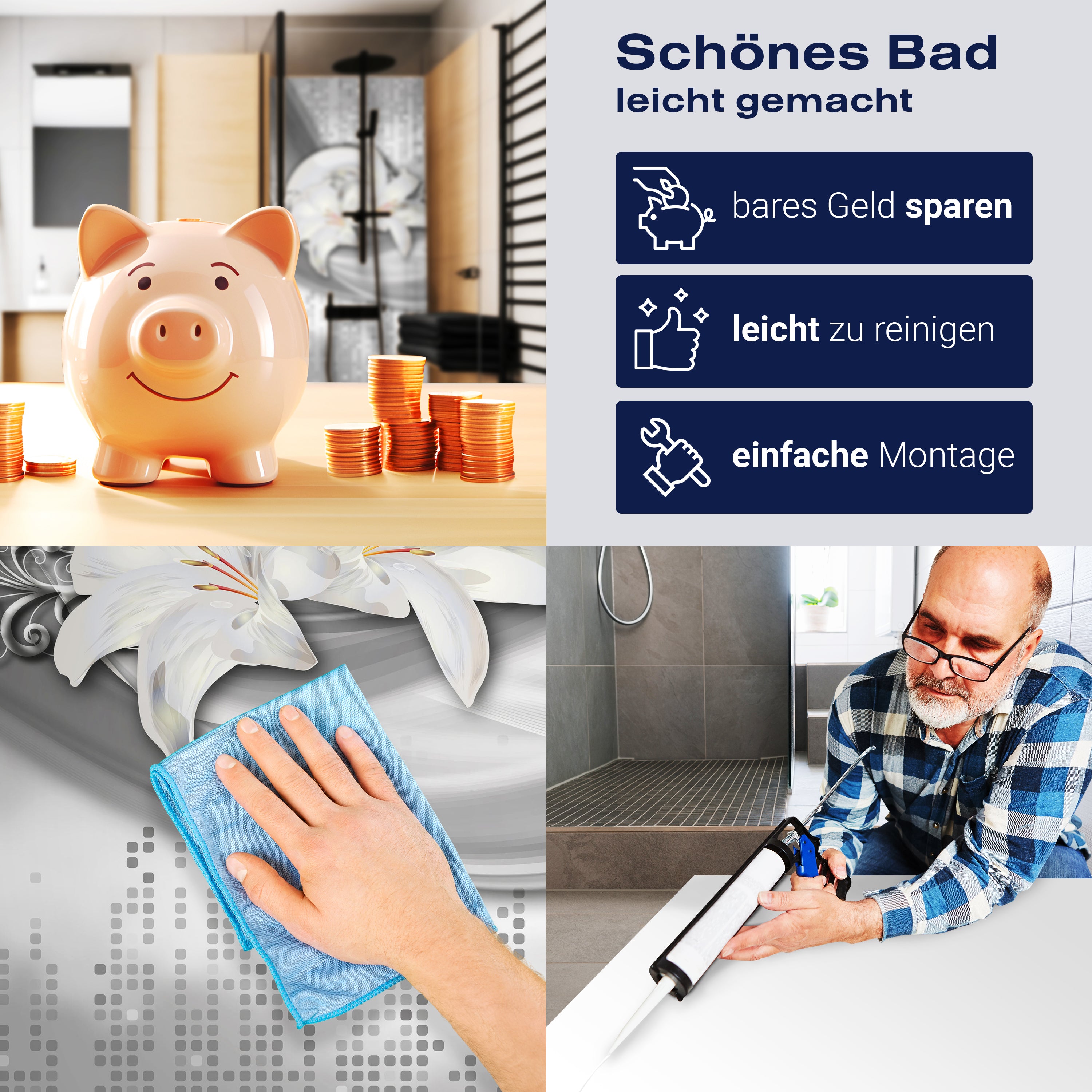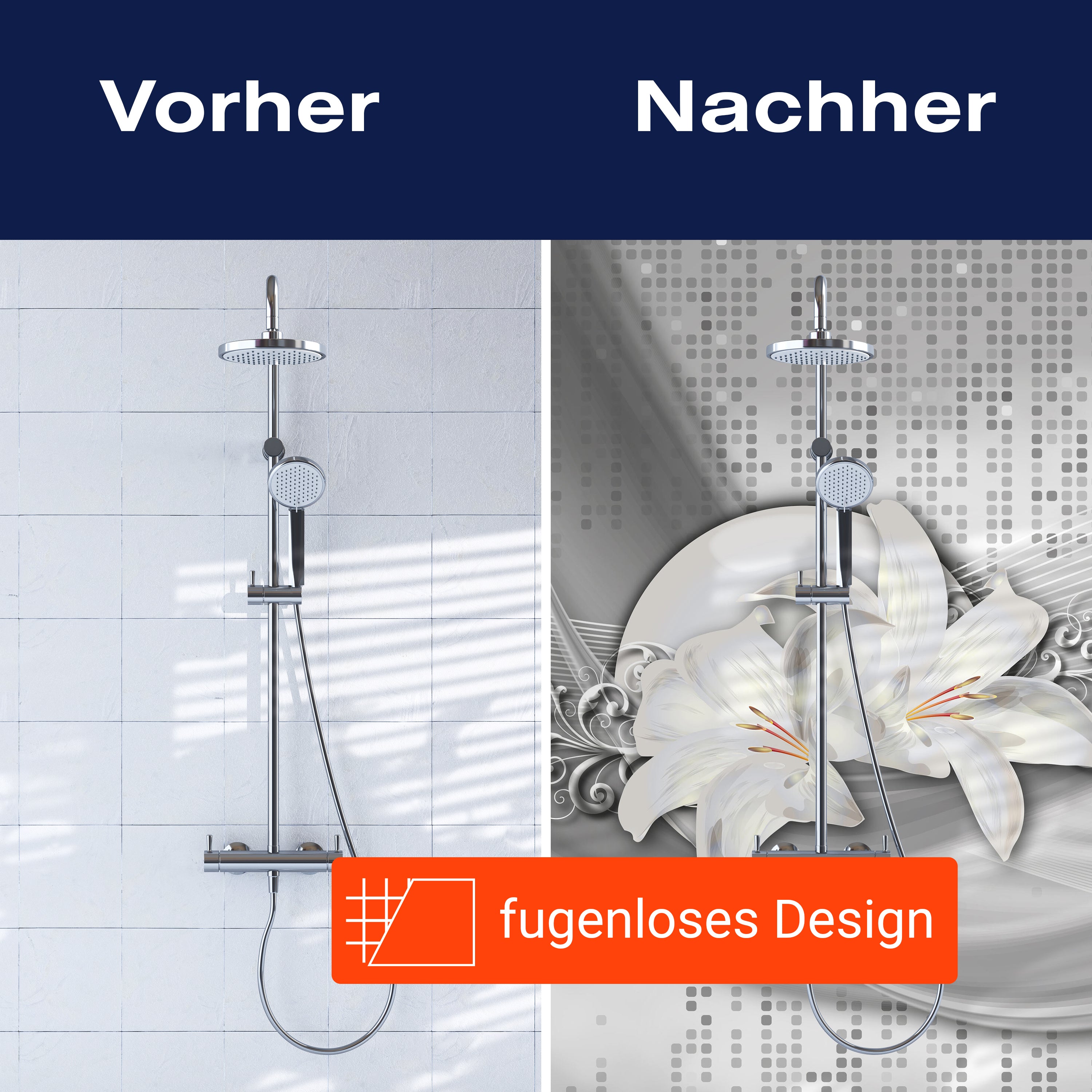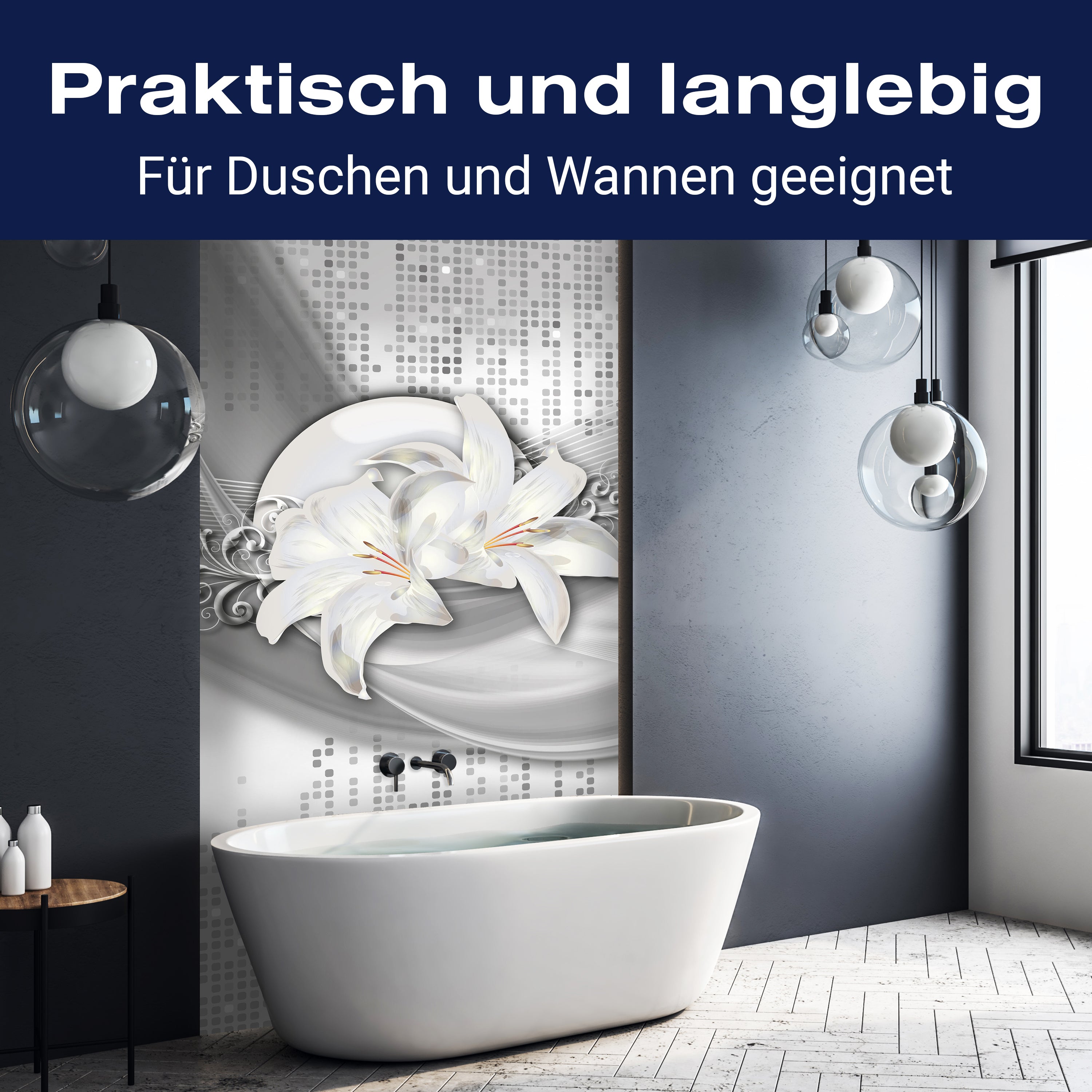 Bist du es leid, auf die langweiligen, schwer zu reinigende Fliesen in deiner Dusche zu schauen? Stell dir vor, wie dein Bad mit einer stilvollen, modernen Rückwand zum Leben erwacht! Unsere Duschwand 'abstrakte Lilien grau silber' ist nicht nur ein optisches Highlight, sondern auch praktisch und pflegeleicht.