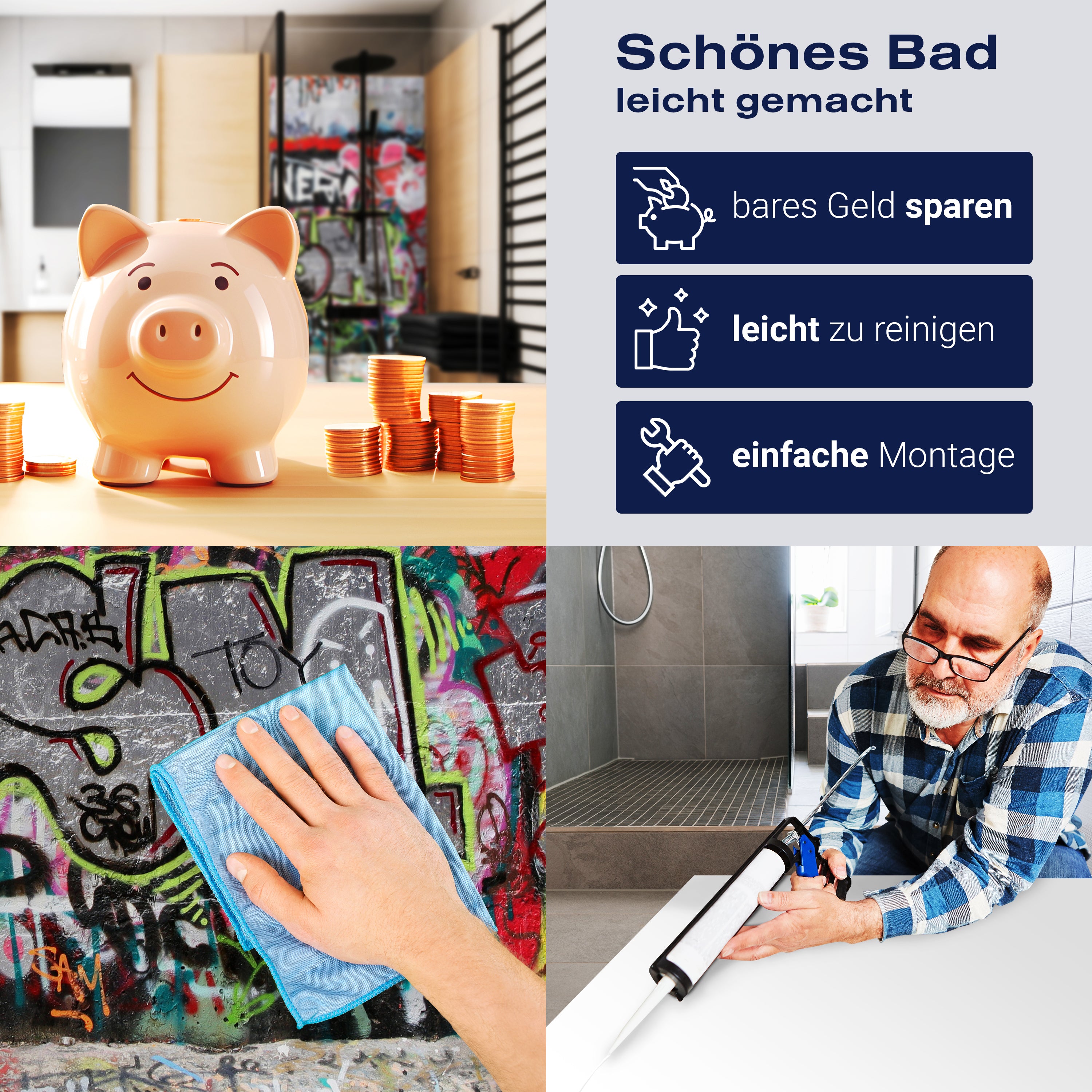Diese Materialien bieten im Vergleich zu traditionellen Fliesen mehrere Vorteile. Sie haben eine fugenlose Oberfläche, was bedeutet, dass sie weniger anfällig für Schimmelbildung und leichter zu reinigen sind, da sich Schmutz und Kalk nicht in Fugen festsetzen können. Darüber hinaus ermöglichen sie eine schnelle und einfache Renovierung, da sie direkt über bestehenden Fliesen montiert werden können, was Zeit und Kosten spart