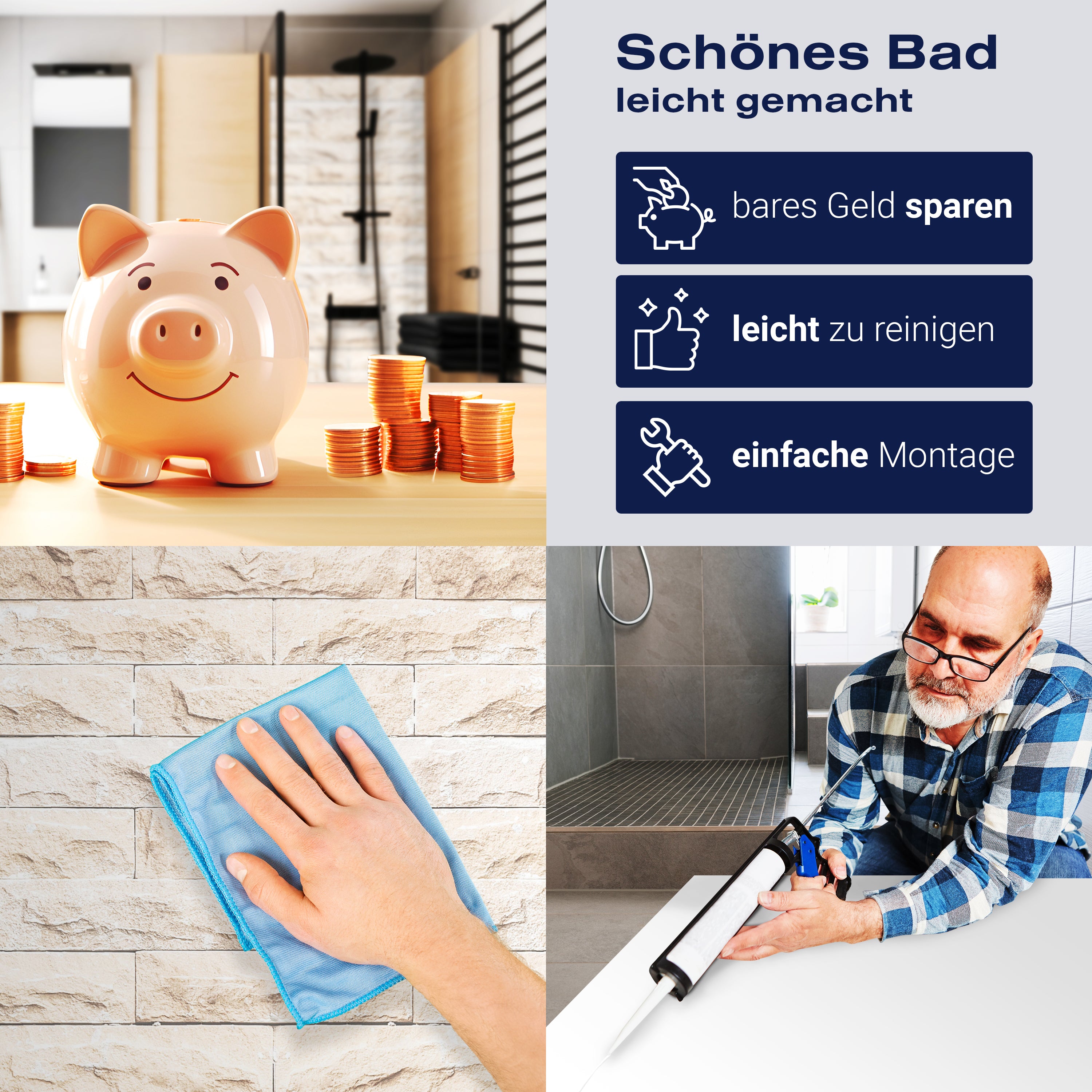 Die Reinigung Deiner Duschwand war noch nie so einfach. In einer Welt, in der Zeit ein kostbares Gut ist, verstehen wir, wie wichtig es ist, Reinigungsprozesse so effizient und mühelos wie möglich zu gestalten. Unsere Duschwände sind speziell dafür entworfen, Dein Leben leichter zu machen. Dank der glatten Oberfläche und der widerstandsfähigen Beschichtung lassen sich Spritzer und Flecken ohne großen Aufwand entfernen – ein schneller Wisch mit einem handelsüblichen Lappen, Spül- oder Wischtuch, und Deine Rückwand sieht aus wie neu.