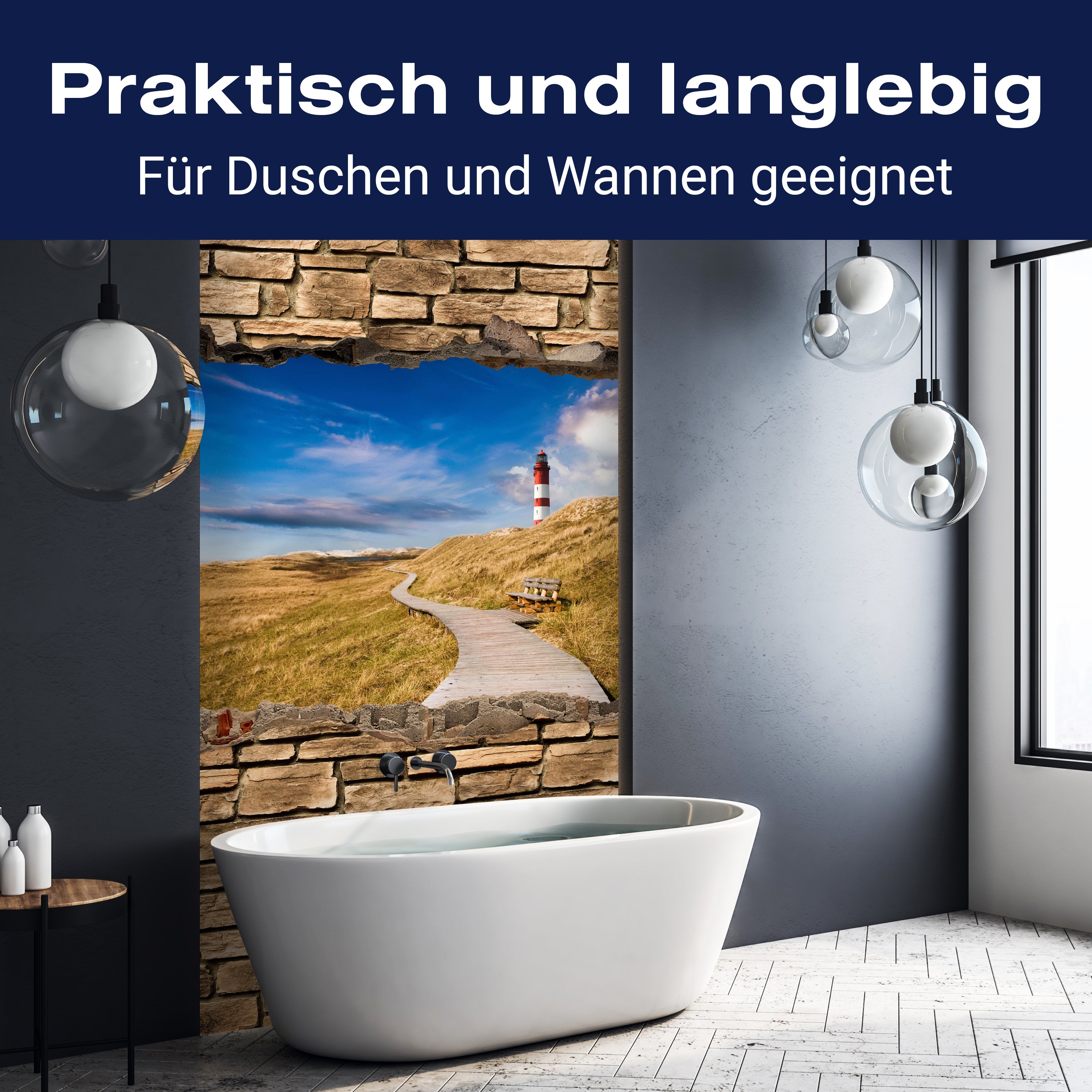 Bist du es leid, auf die langweiligen, schwer zu reinigende Fliesen in deiner Dusche zu schauen? Stell dir vor, wie dein Bad mit einer stilvollen, modernen Rückwand zum Leben erwacht! Unsere Duschwand '3D Leuchtturm mit Holzweg - Steinmauer' ist nicht nur ein optisches Highlight, sondern auch praktisch und pflegeleicht.