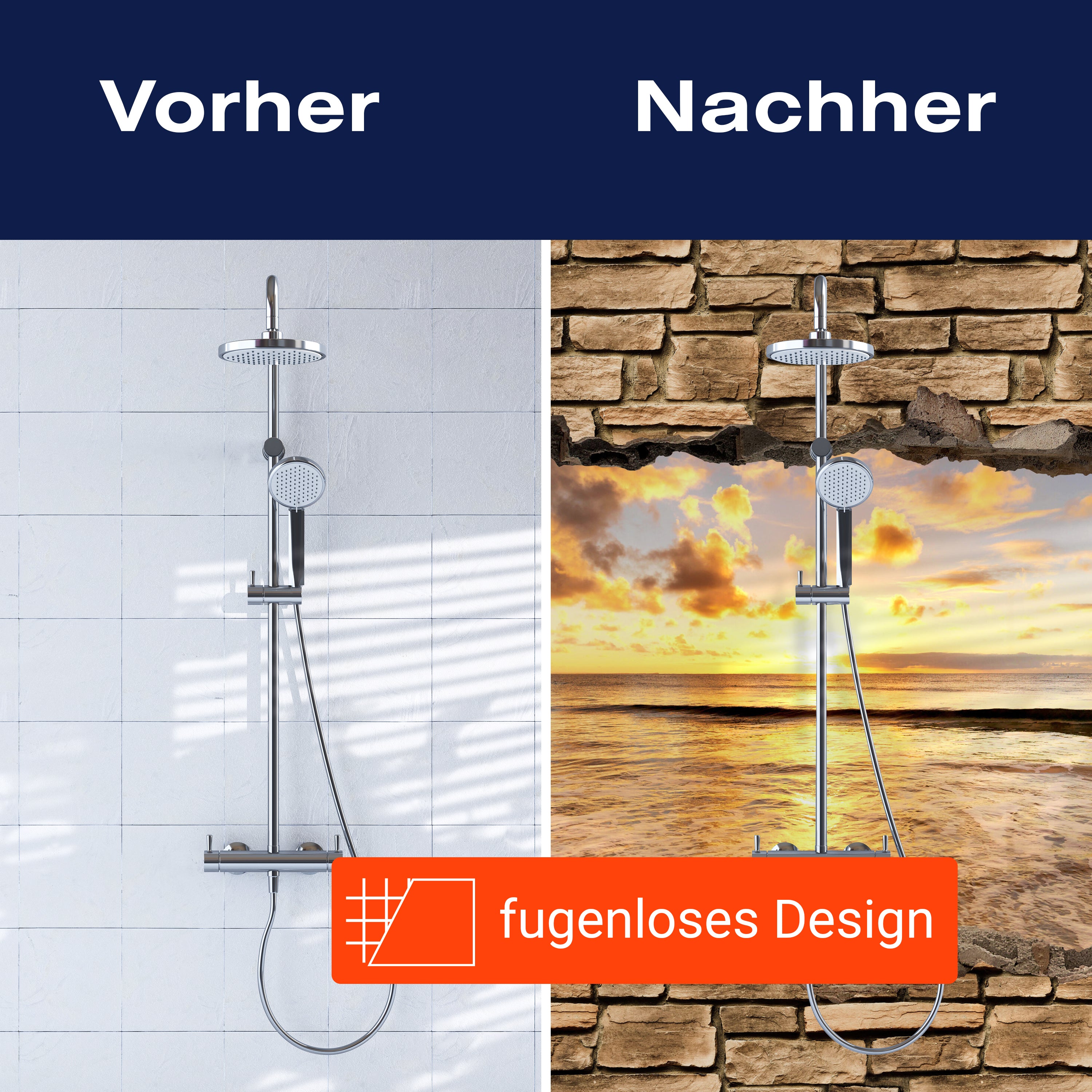 Bist du es leid, auf die langweiligen, schwer zu reinigende Fliesen in deiner Dusche zu schauen? Stell dir vor, wie dein Bad mit einer stilvollen, modernen Rückwand zum Leben erwacht! Unsere Duschwand '3D Sonnenuntergang am Meer - Steinmauer' ist nicht nur ein optisches Highlight, sondern auch praktisch und pflegeleicht.