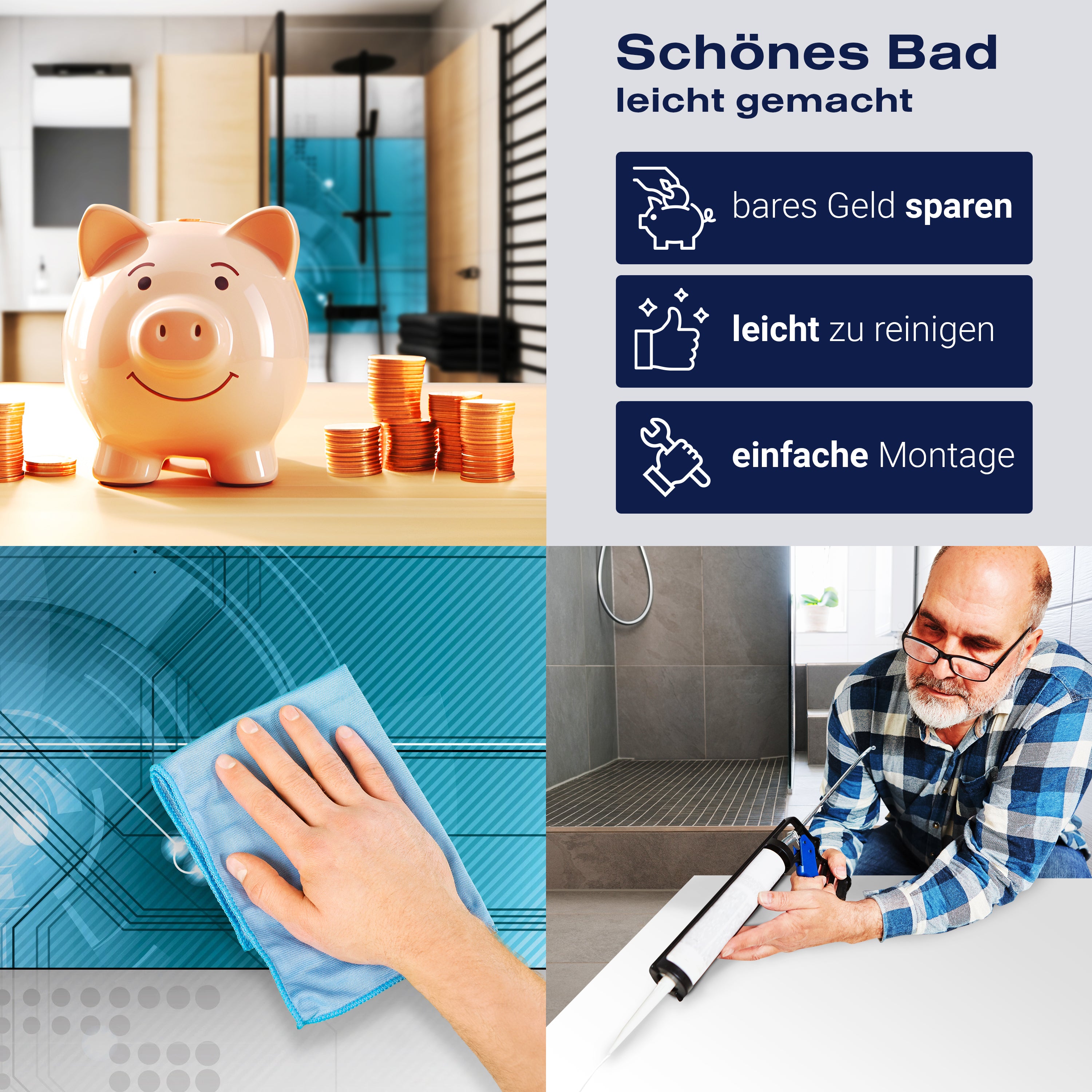 Die Reinigung Deiner Duschwand war noch nie so einfach. In einer Welt, in der Zeit ein kostbares Gut ist, verstehen wir, wie wichtig es ist, Reinigungsprozesse so effizient und mühelos wie möglich zu gestalten. Unsere Duschwände sind speziell dafür entworfen, Dein Leben leichter zu machen. Dank der glatten Oberfläche und der widerstandsfähigen Beschichtung lassen sich Spritzer und Flecken ohne großen Aufwand entfernen – ein schneller Wisch mit einem handelsüblichen Lappen, Spül- oder Wischtuch, und Deine Rückwand sieht aus wie neu.