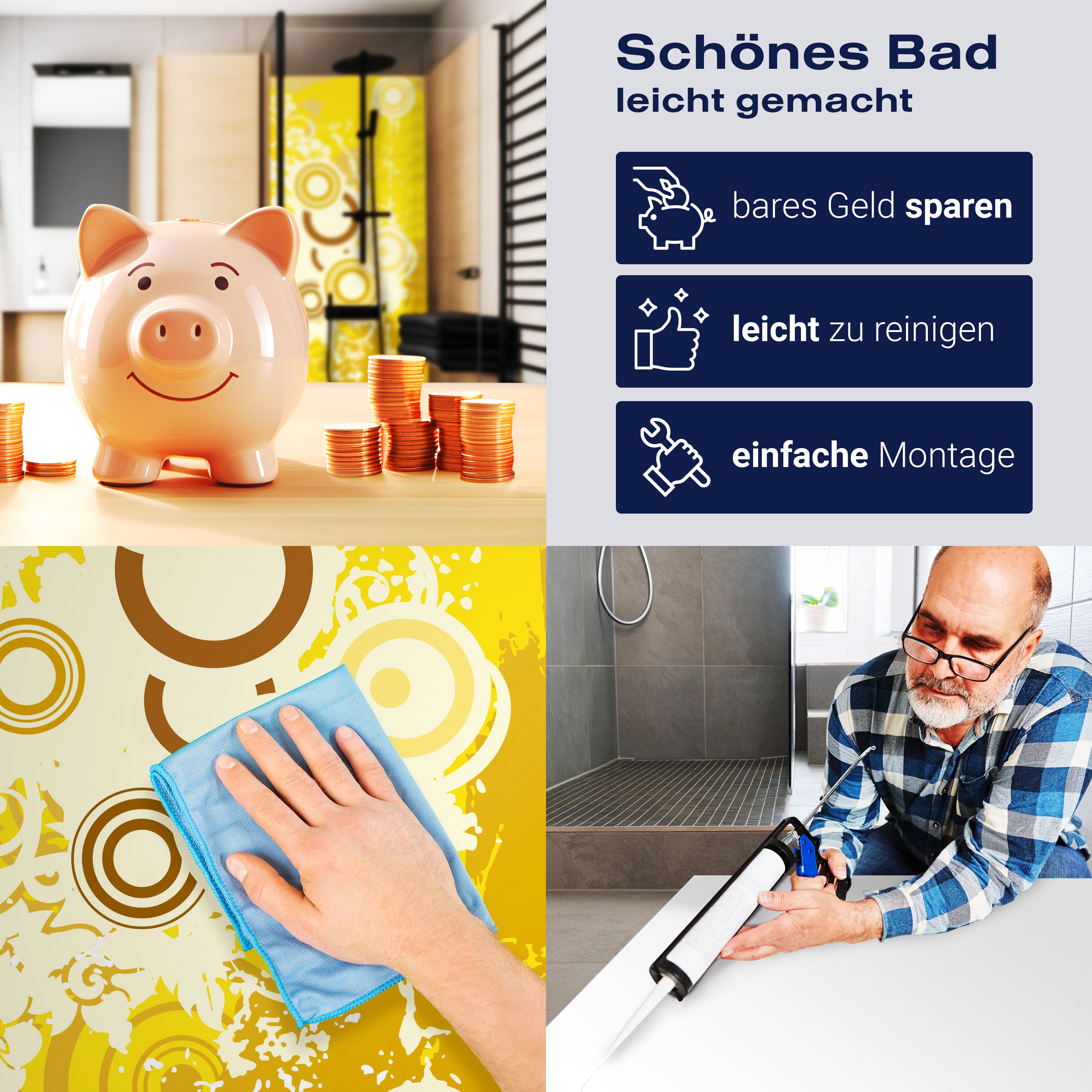 Die Reinigung Deiner Duschwand war noch nie so einfach. In einer Welt, in der Zeit ein kostbares Gut ist, verstehen wir, wie wichtig es ist, Reinigungsprozesse so effizient und mühelos wie möglich zu gestalten. Unsere Duschwände sind speziell dafür entworfen, Dein Leben leichter zu machen. Dank der glatten Oberfläche und der widerstandsfähigen Beschichtung lassen sich Spritzer und Flecken ohne großen Aufwand entfernen – ein schneller Wisch mit einem handelsüblichen Lappen, Spül- oder Wischtuch, und Deine Rückwand sieht aus wie neu.
