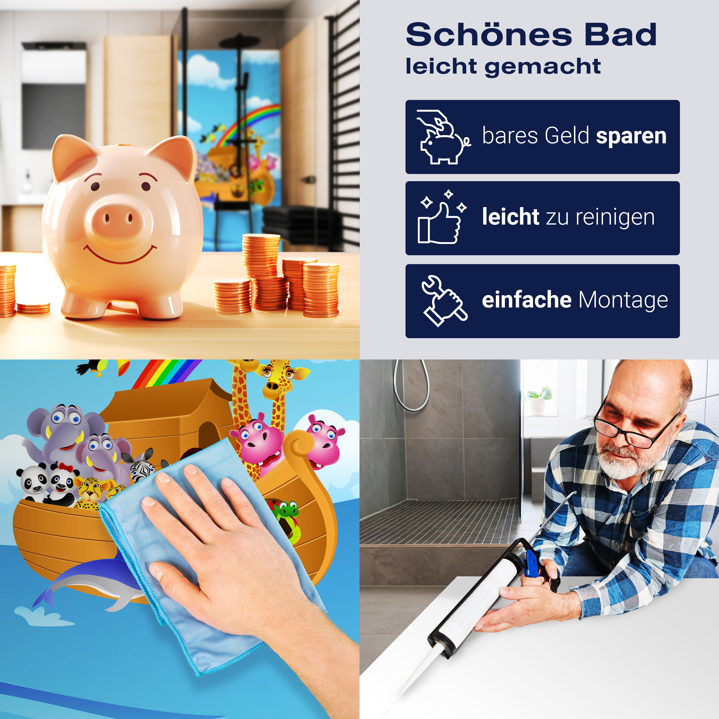 Bist du es leid, auf die langweiligen, schwer zu reinigende Fliesen in deiner Dusche zu schauen? Stell dir vor, wie dein Bad mit einer stilvollen, modernen Rückwand zum Leben erwacht! Unsere Duschwand 'Arche Noah' ist nicht nur ein optisches Highlight, sondern auch praktisch und pflegeleicht.