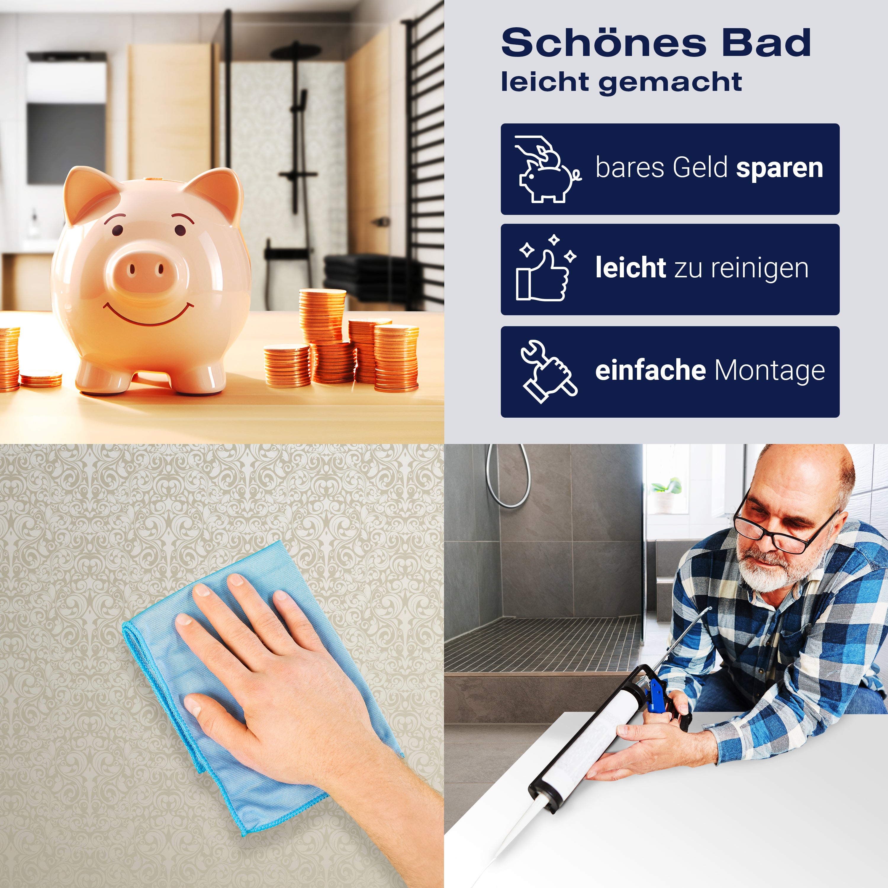 Die Reinigung Deiner Duschwand war noch nie so einfach. In einer Welt, in der Zeit ein kostbares Gut ist, verstehen wir, wie wichtig es ist, Reinigungsprozesse so effizient und mühelos wie möglich zu gestalten. Unsere Duschwände sind speziell dafür entworfen, Dein Leben leichter zu machen. Dank der glatten Oberfläche und der widerstandsfähigen Beschichtung lassen sich Spritzer und Flecken ohne großen Aufwand entfernen – ein schneller Wisch mit einem handelsüblichen Lappen, Spül- oder Wischtuch, und Deine Rückwand sieht aus wie neu.