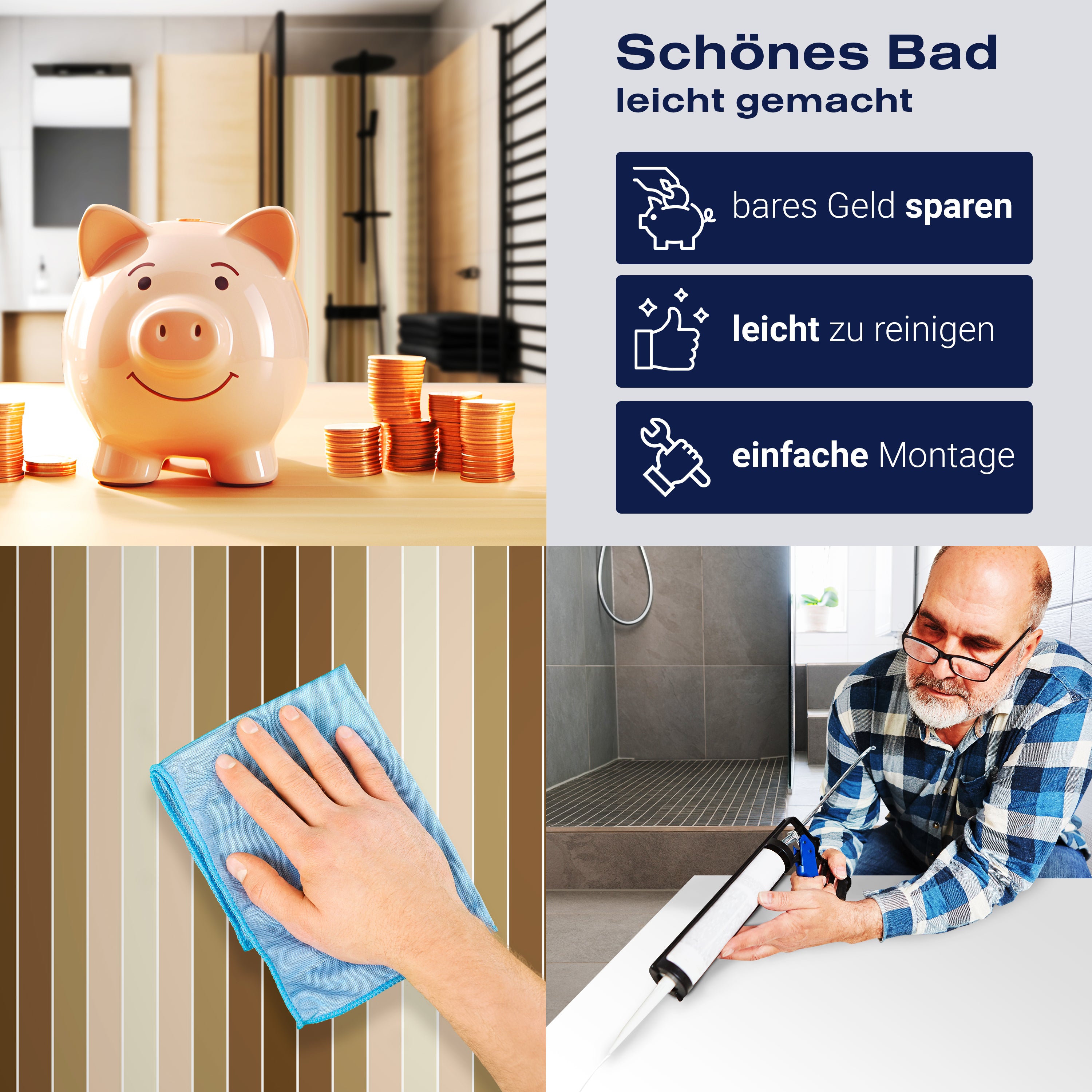 Diese Materialien bieten im Vergleich zu traditionellen Fliesen mehrere Vorteile. Sie haben eine fugenlose Oberfläche, was bedeutet, dass sie weniger anfällig für Schimmelbildung und leichter zu reinigen sind, da sich Schmutz und Kalk nicht in Fugen festsetzen können. Darüber hinaus ermöglichen sie eine schnelle und einfache Renovierung, da sie direkt über bestehenden Fliesen montiert werden können, was Zeit und Kosten spart