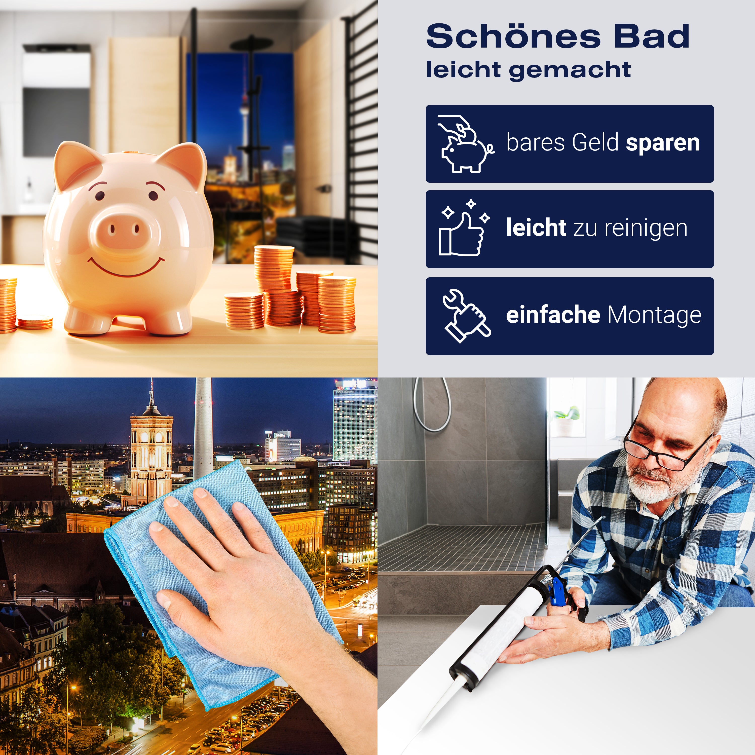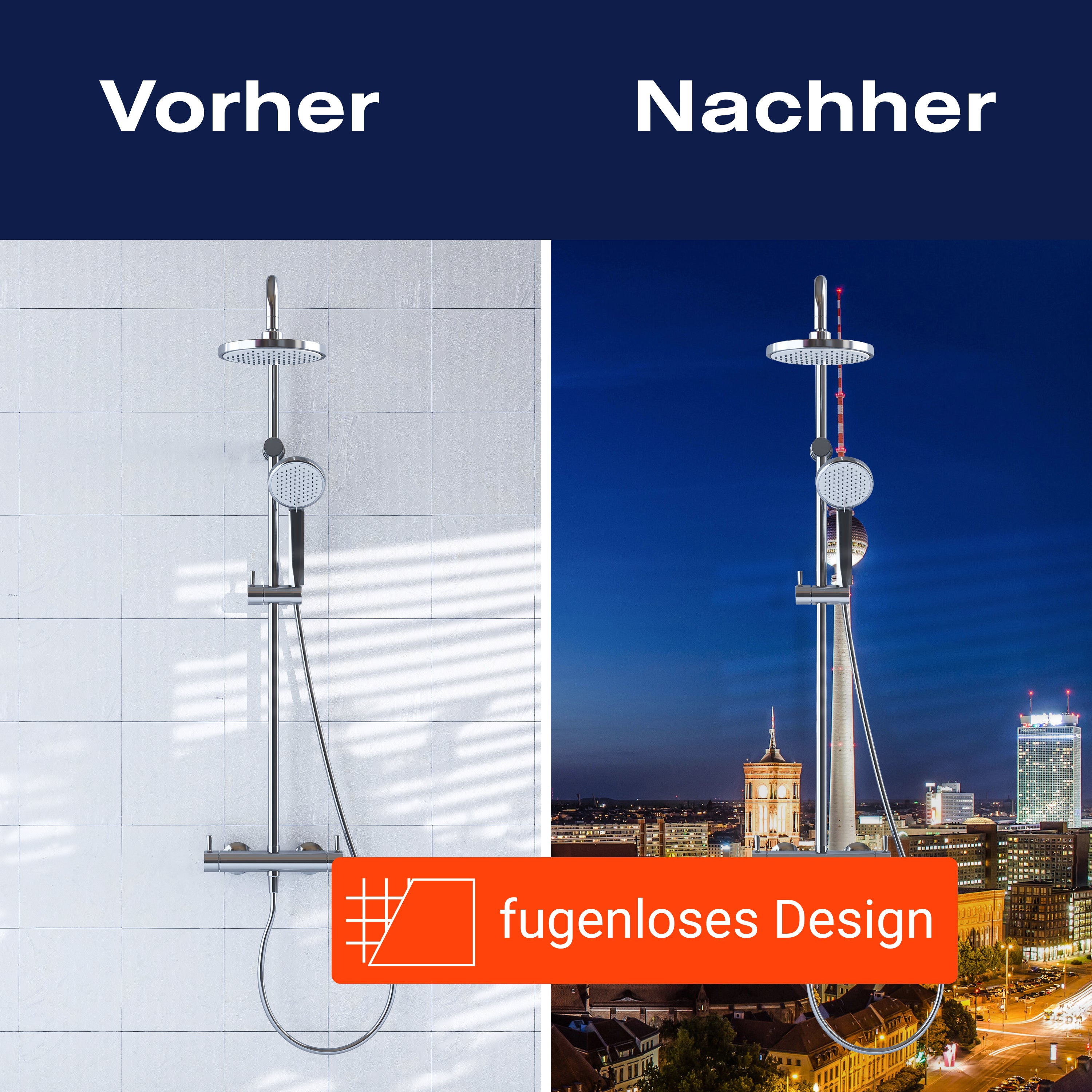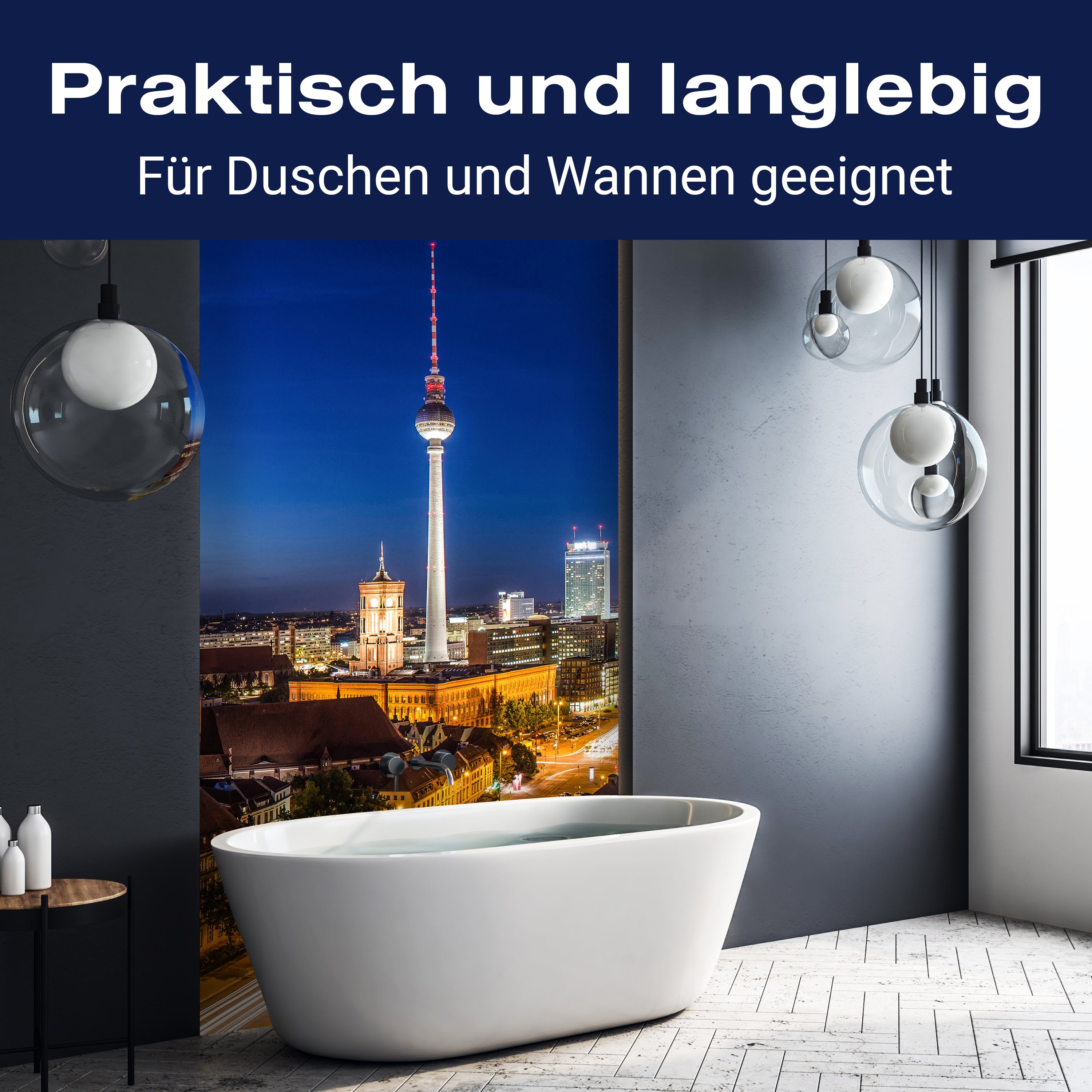 Bist du es leid, auf die langweiligen, schwer zu reinigende Fliesen in deiner Dusche zu schauen? Stell dir vor, wie dein Bad mit einer stilvollen, modernen Rückwand zum Leben erwacht! Unsere Duschwand 'Berlin bei Nacht' ist nicht nur ein optisches Highlight, sondern auch praktisch und pflegeleicht.