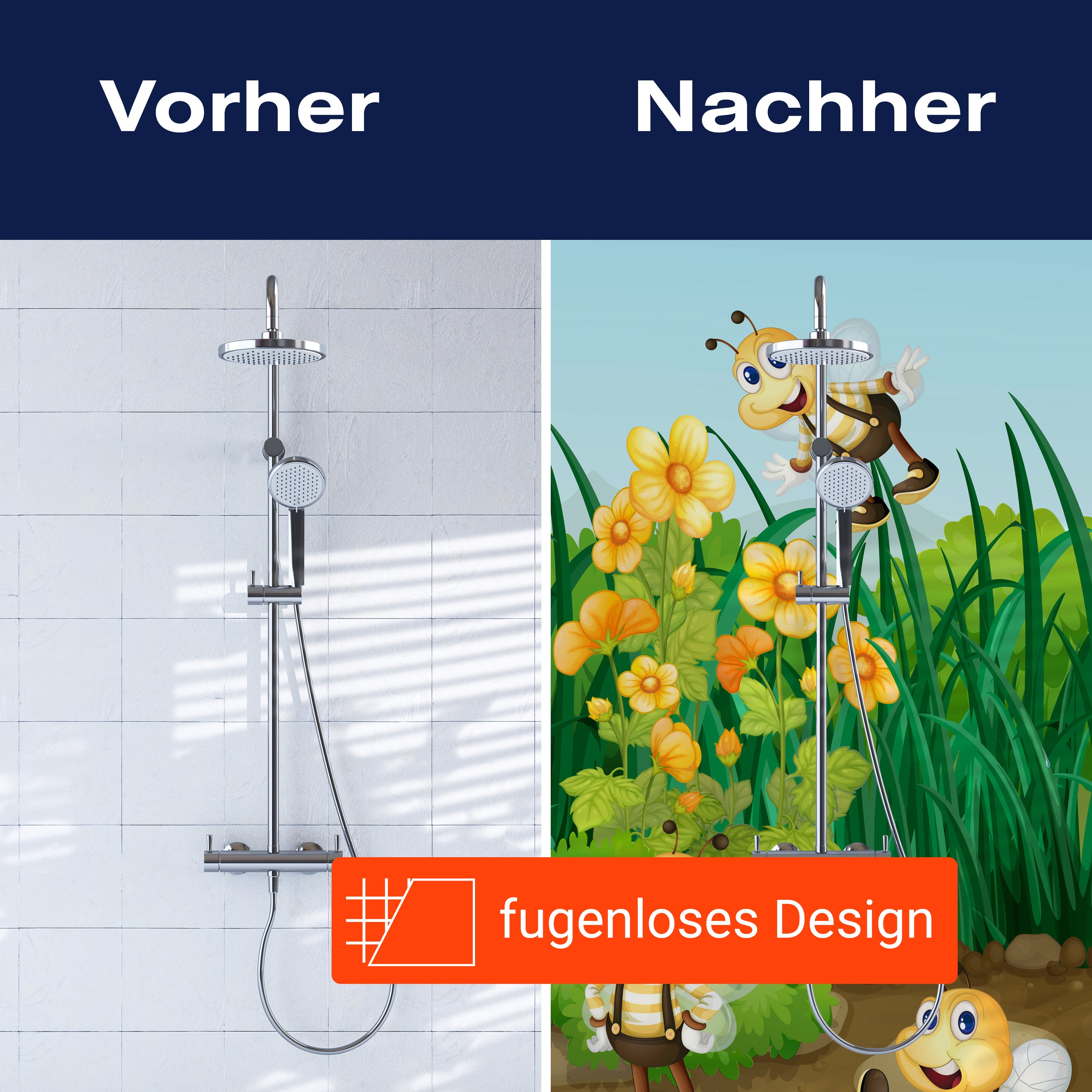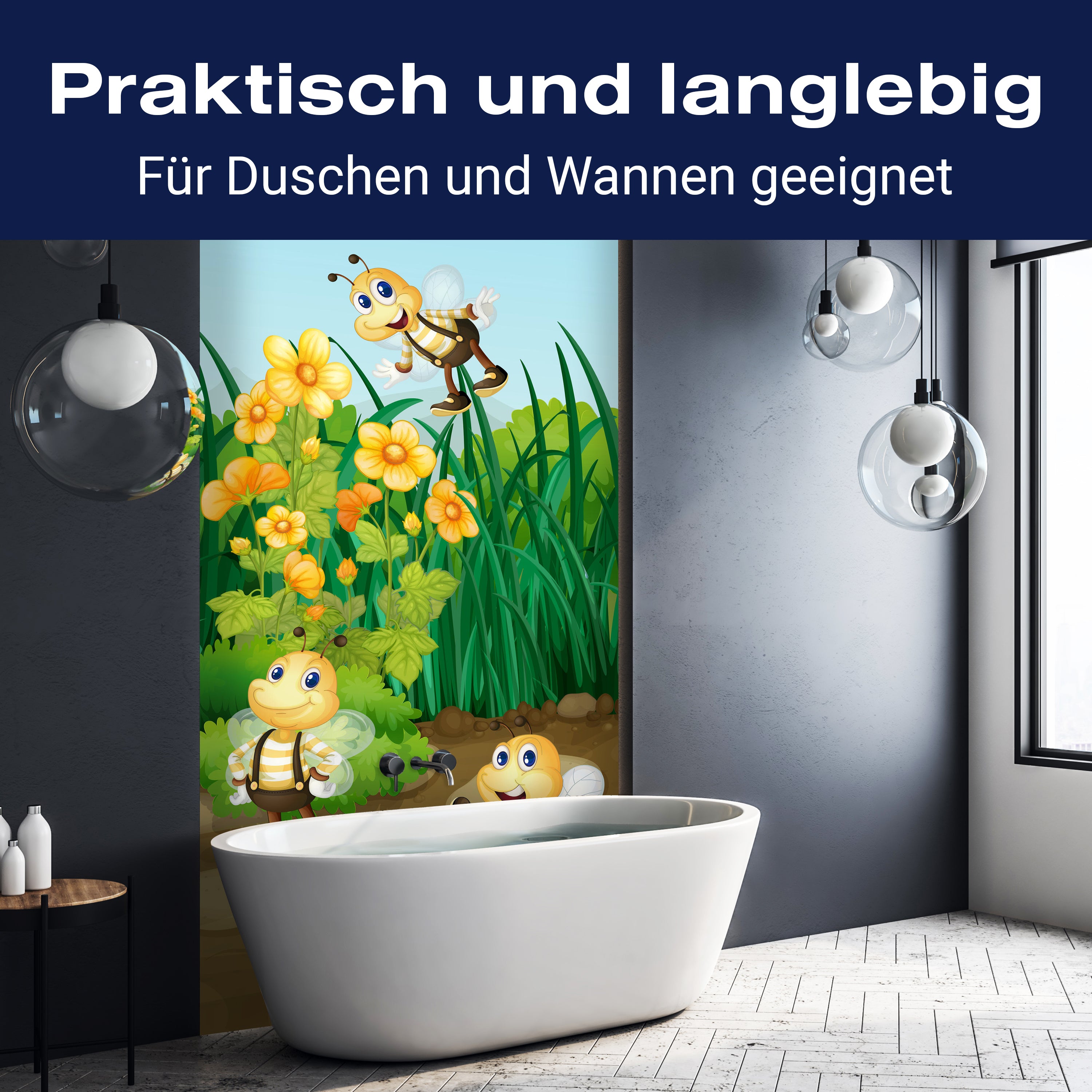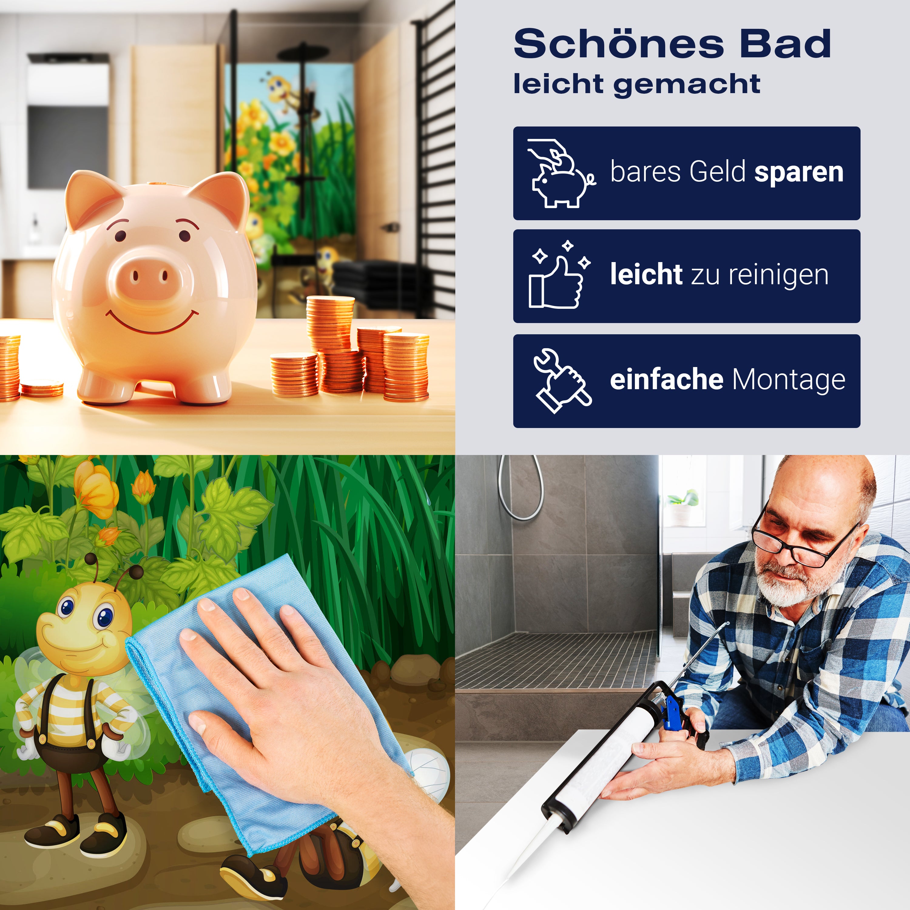 Bist du es leid, auf die langweiligen, schwer zu reinigende Fliesen in deiner Dusche zu schauen? Stell dir vor, wie dein Bad mit einer stilvollen, modernen Rückwand zum Leben erwacht! Unsere Duschwand 'Bienen im Garten' ist nicht nur ein optisches Highlight, sondern auch praktisch und pflegeleicht.