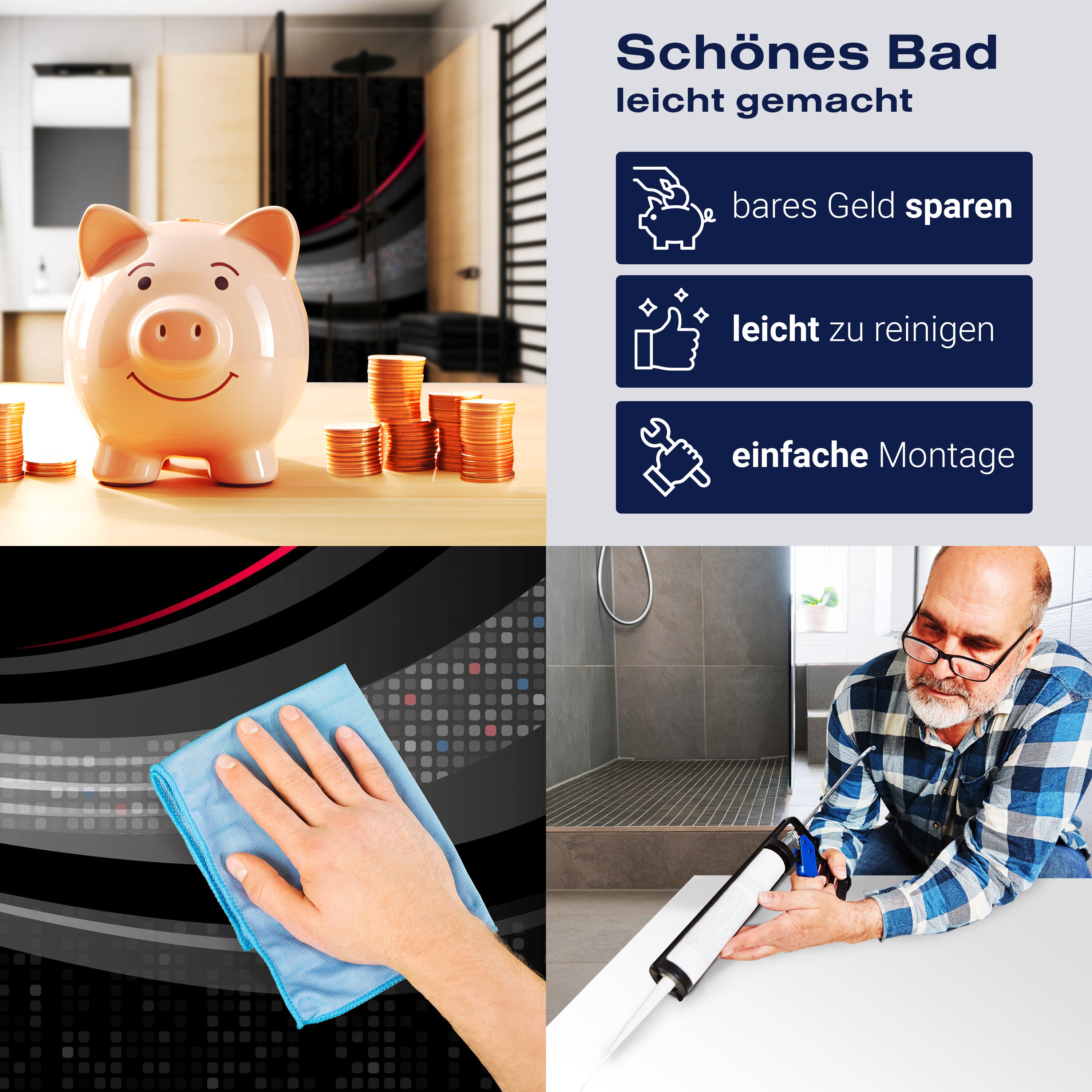 Die Reinigung Deiner Duschwand war noch nie so einfach. In einer Welt, in der Zeit ein kostbares Gut ist, verstehen wir, wie wichtig es ist, Reinigungsprozesse so effizient und mühelos wie möglich zu gestalten. Unsere Duschwände sind speziell dafür entworfen, Dein Leben leichter zu machen. Dank der glatten Oberfläche und der widerstandsfähigen Beschichtung lassen sich Spritzer und Flecken ohne großen Aufwand entfernen – ein schneller Wisch mit einem handelsüblichen Lappen, Spül- oder Wischtuch, und Deine Rückwand sieht aus wie neu.