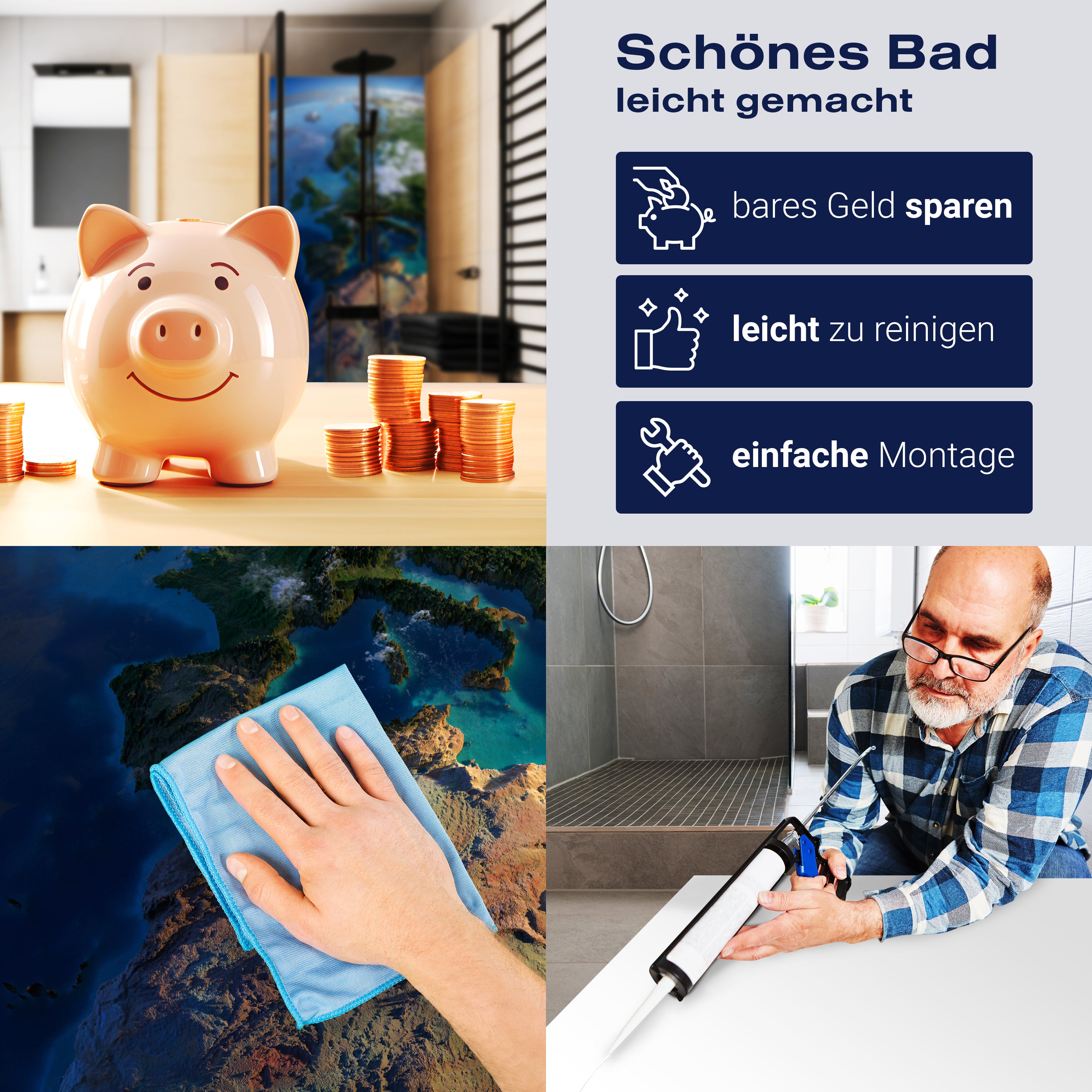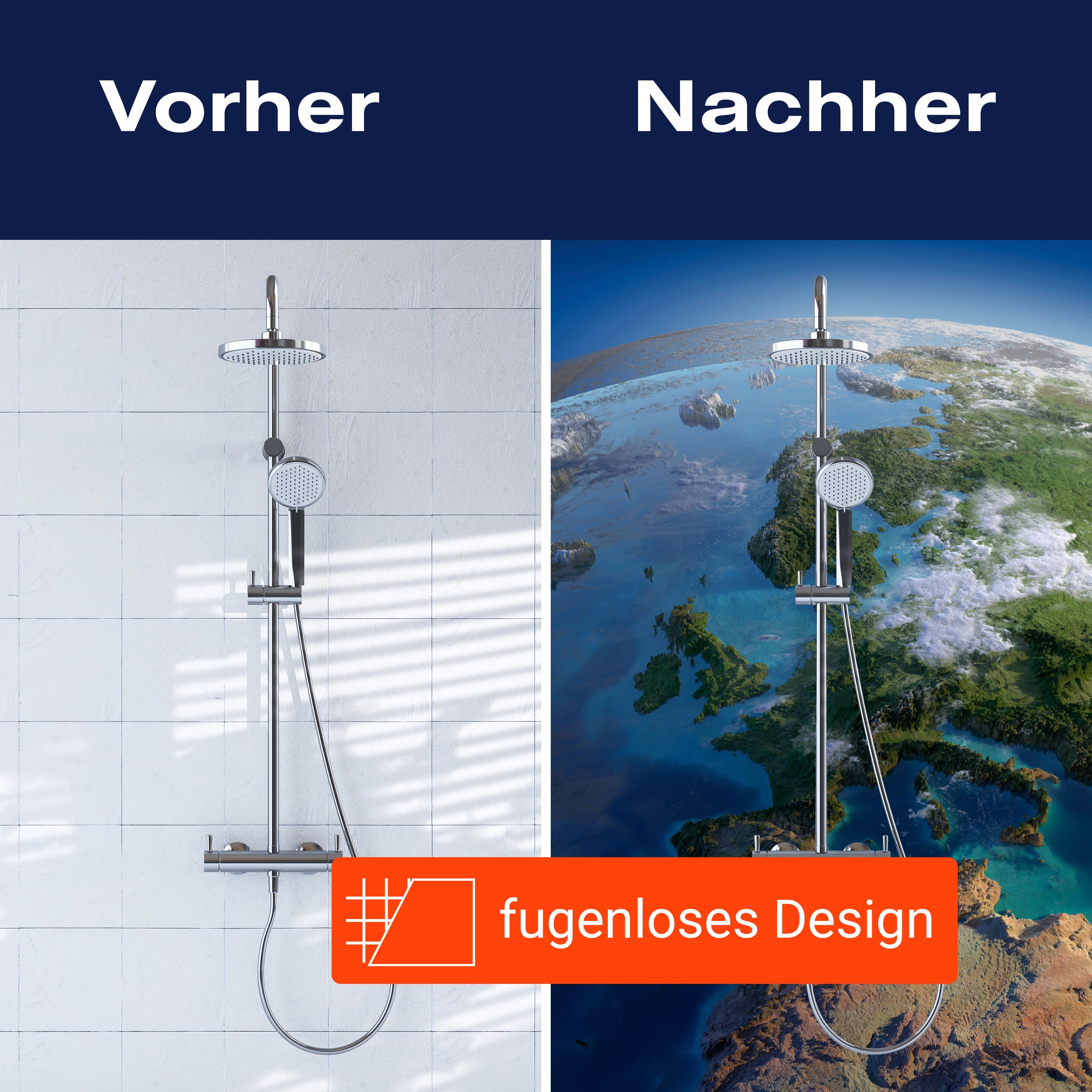 Bist du es leid, auf die langweiligen, schwer zu reinigende Fliesen in deiner Dusche zu schauen? Stell dir vor, wie dein Bad mit einer stilvollen, modernen Rückwand zum Leben erwacht! Unsere Duschwand 'Blauer Planet' ist nicht nur ein optisches Highlight, sondern auch praktisch und pflegeleicht.