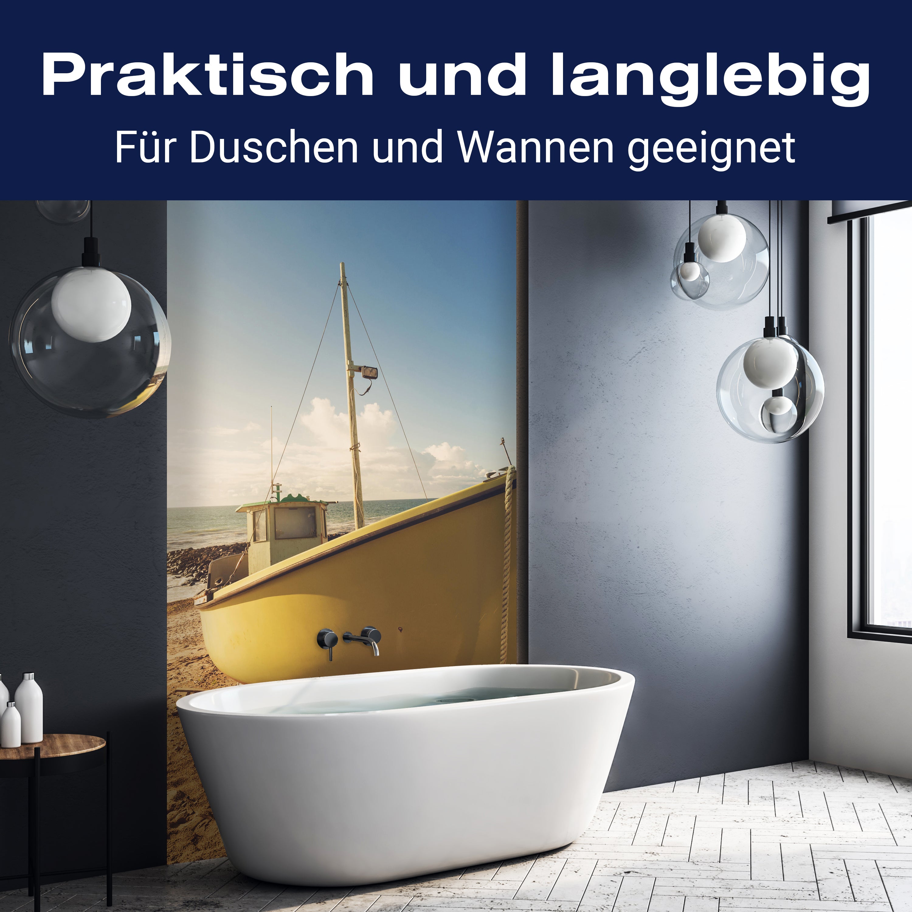 Bist du es leid, auf die langweiligen, schwer zu reinigende Fliesen in deiner Dusche zu schauen? Stell dir vor, wie dein Bad mit einer stilvollen, modernen Rückwand zum Leben erwacht! Unsere Duschwand 'Boote Am Strand' ist nicht nur ein optisches Highlight, sondern auch praktisch und pflegeleicht.