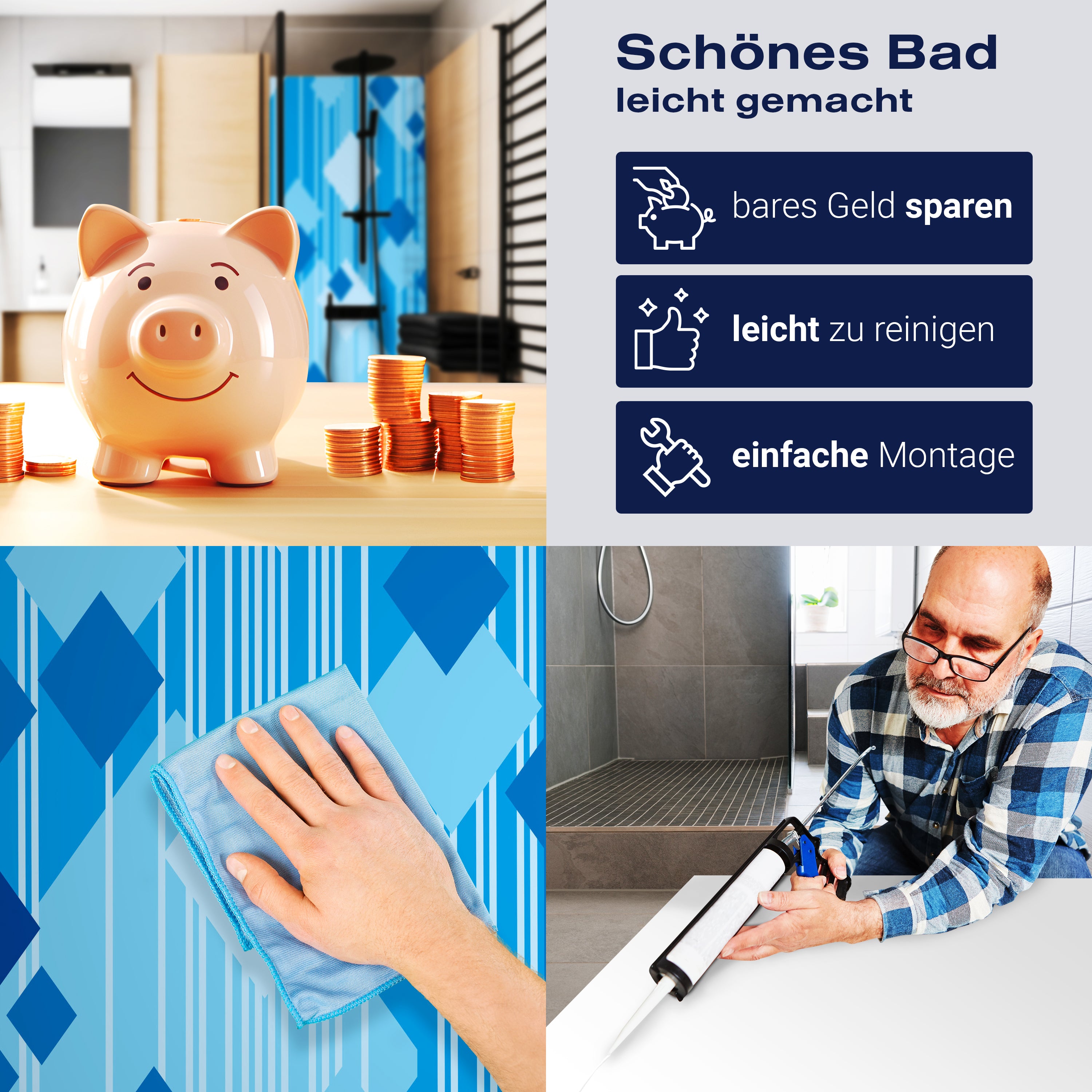 Die Reinigung Deiner Duschwand war noch nie so einfach. In einer Welt, in der Zeit ein kostbares Gut ist, verstehen wir, wie wichtig es ist, Reinigungsprozesse so effizient und mühelos wie möglich zu gestalten. Unsere Duschwände sind speziell dafür entworfen, Dein Leben leichter zu machen. Dank der glatten Oberfläche und der widerstandsfähigen Beschichtung lassen sich Spritzer und Flecken ohne großen Aufwand entfernen – ein schneller Wisch mit einem handelsüblichen Lappen, Spül- oder Wischtuch, und Deine Rückwand sieht aus wie neu.