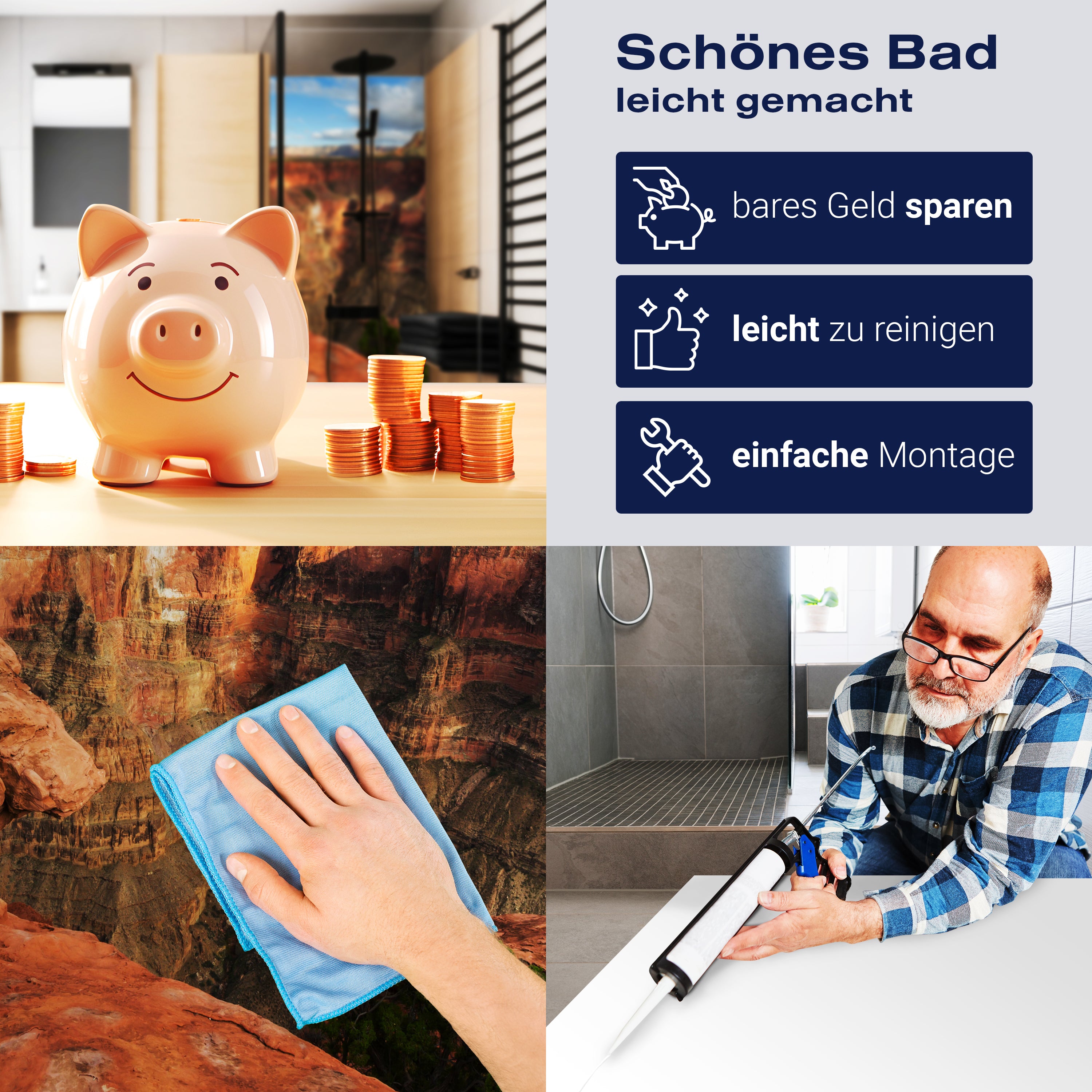 Bist du es leid, auf die langweiligen, schwer zu reinigende Fliesen in deiner Dusche zu schauen? Stell dir vor, wie dein Bad mit einer stilvollen, modernen Rückwand zum Leben erwacht! Unsere Duschwand 'Der Grand Canyon' ist nicht nur ein optisches Highlight, sondern auch praktisch und pflegeleicht.