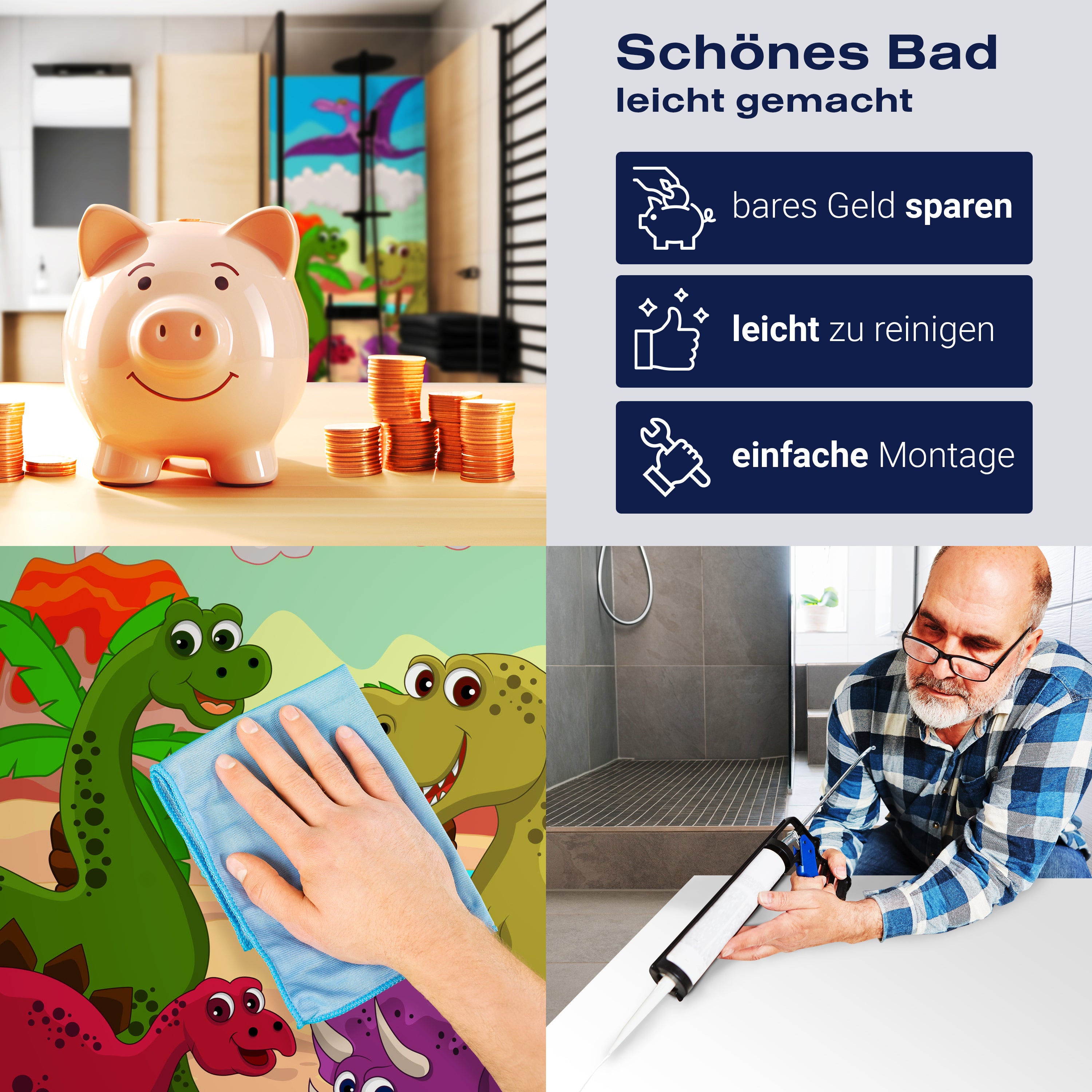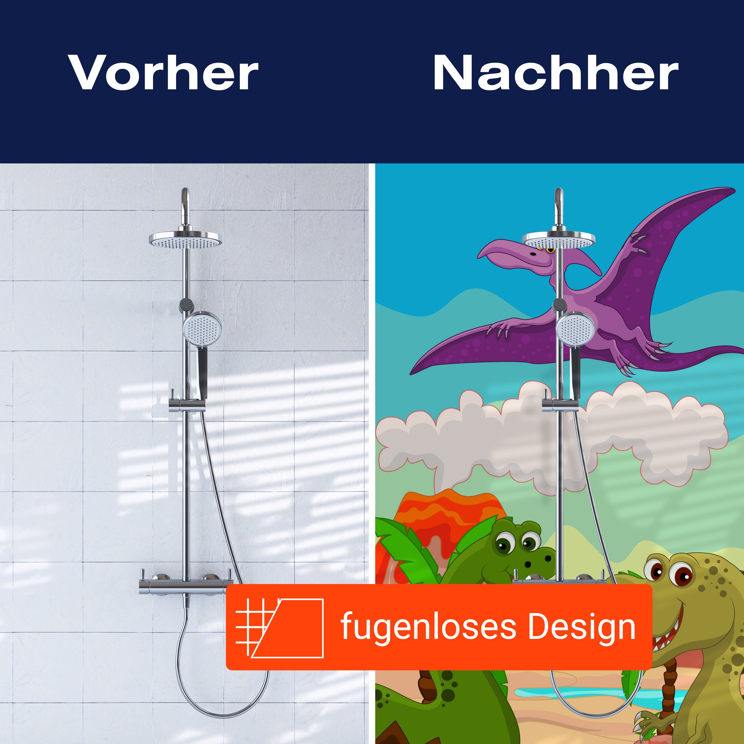 Bist du es leid, auf die langweiligen, schwer zu reinigende Fliesen in deiner Dusche zu schauen? Stell dir vor, wie dein Bad mit einer stilvollen, modernen Rückwand zum Leben erwacht! Unsere Duschwand 'Dinosaurier' ist nicht nur ein optisches Highlight, sondern auch praktisch und pflegeleicht.