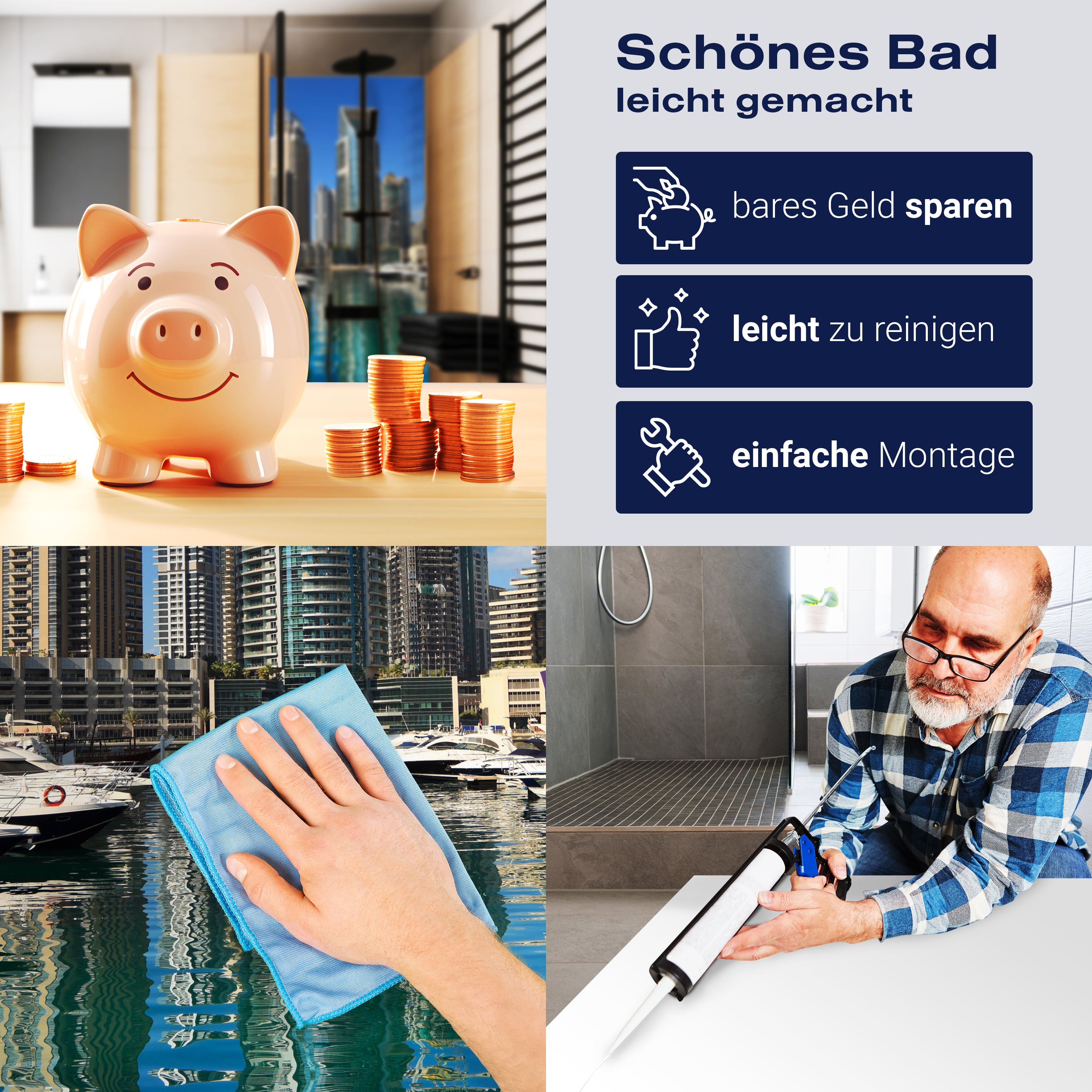 Bist du es leid, auf die langweiligen, schwer zu reinigende Fliesen in deiner Dusche zu schauen? Stell dir vor, wie dein Bad mit einer stilvollen, modernen Rückwand zum Leben erwacht! Unsere Duschwand 'Dubai Skyline' ist nicht nur ein optisches Highlight, sondern auch praktisch und pflegeleicht.