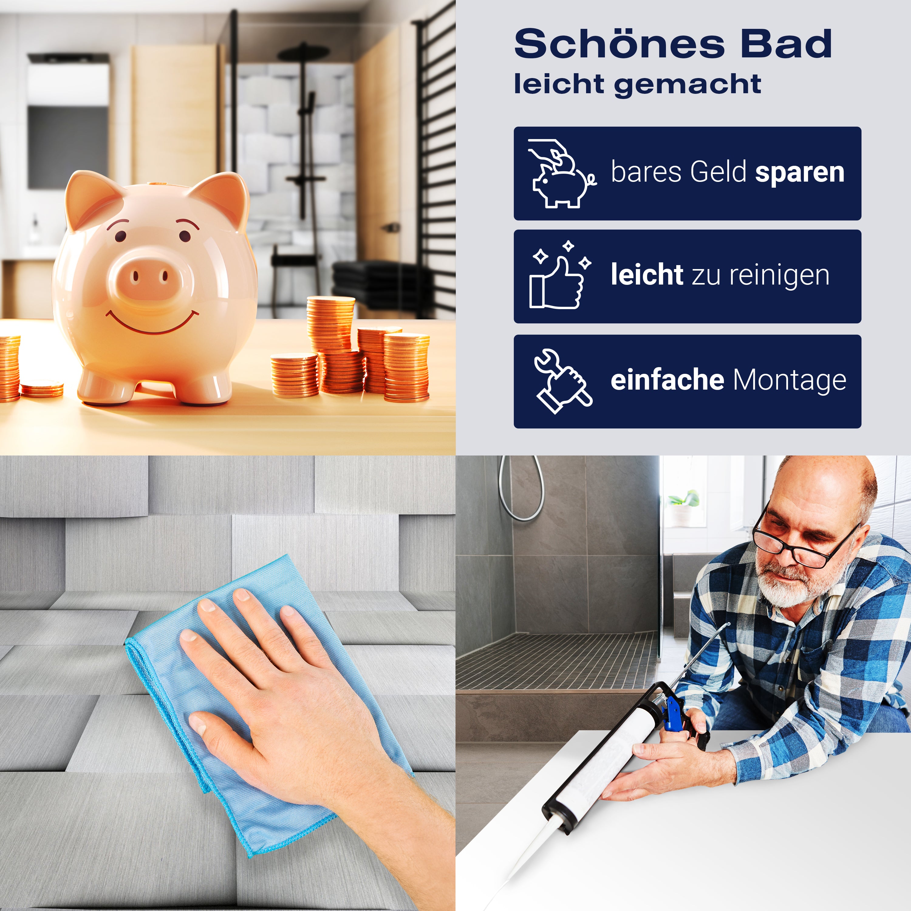 Die Reinigung Deiner Duschwand war noch nie so einfach. In einer Welt, in der Zeit ein kostbares Gut ist, verstehen wir, wie wichtig es ist, Reinigungsprozesse so effizient und mühelos wie möglich zu gestalten. Unsere Duschwände sind speziell dafür entworfen, Dein Leben leichter zu machen. Dank der glatten Oberfläche und der widerstandsfähigen Beschichtung lassen sich Spritzer und Flecken ohne großen Aufwand entfernen – ein schneller Wisch mit einem handelsüblichen Lappen, Spül- oder Wischtuch, und Deine Rückwand sieht aus wie neu.
