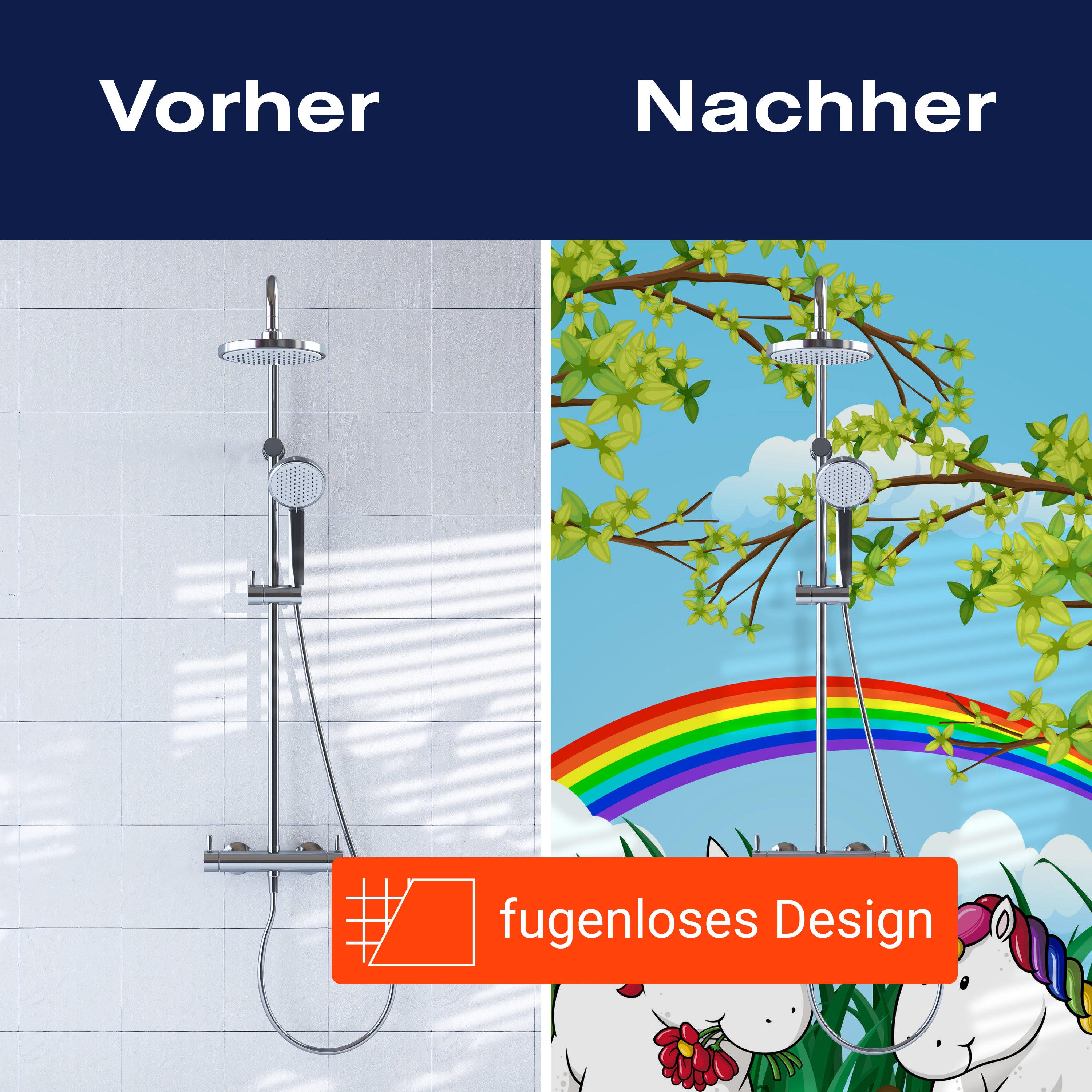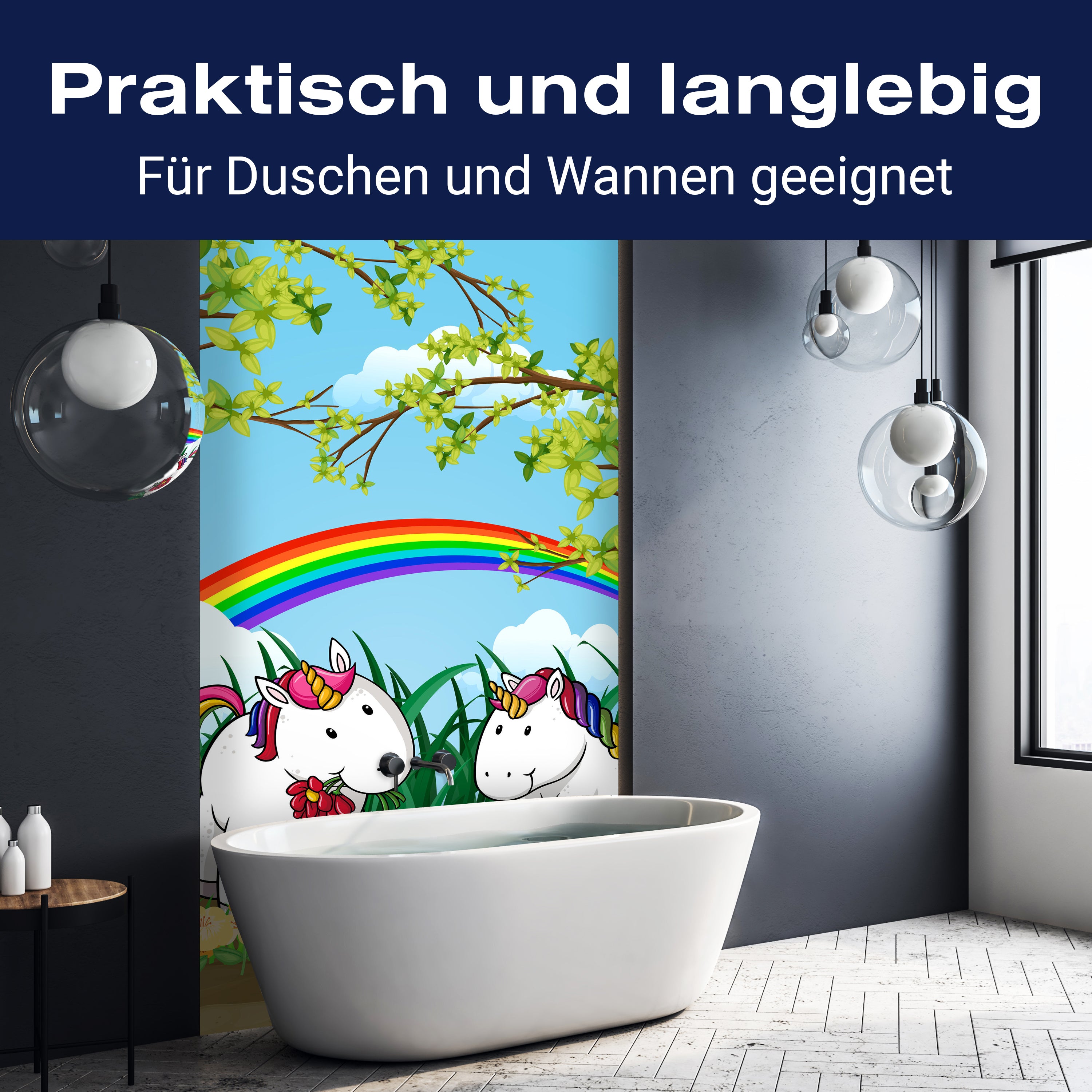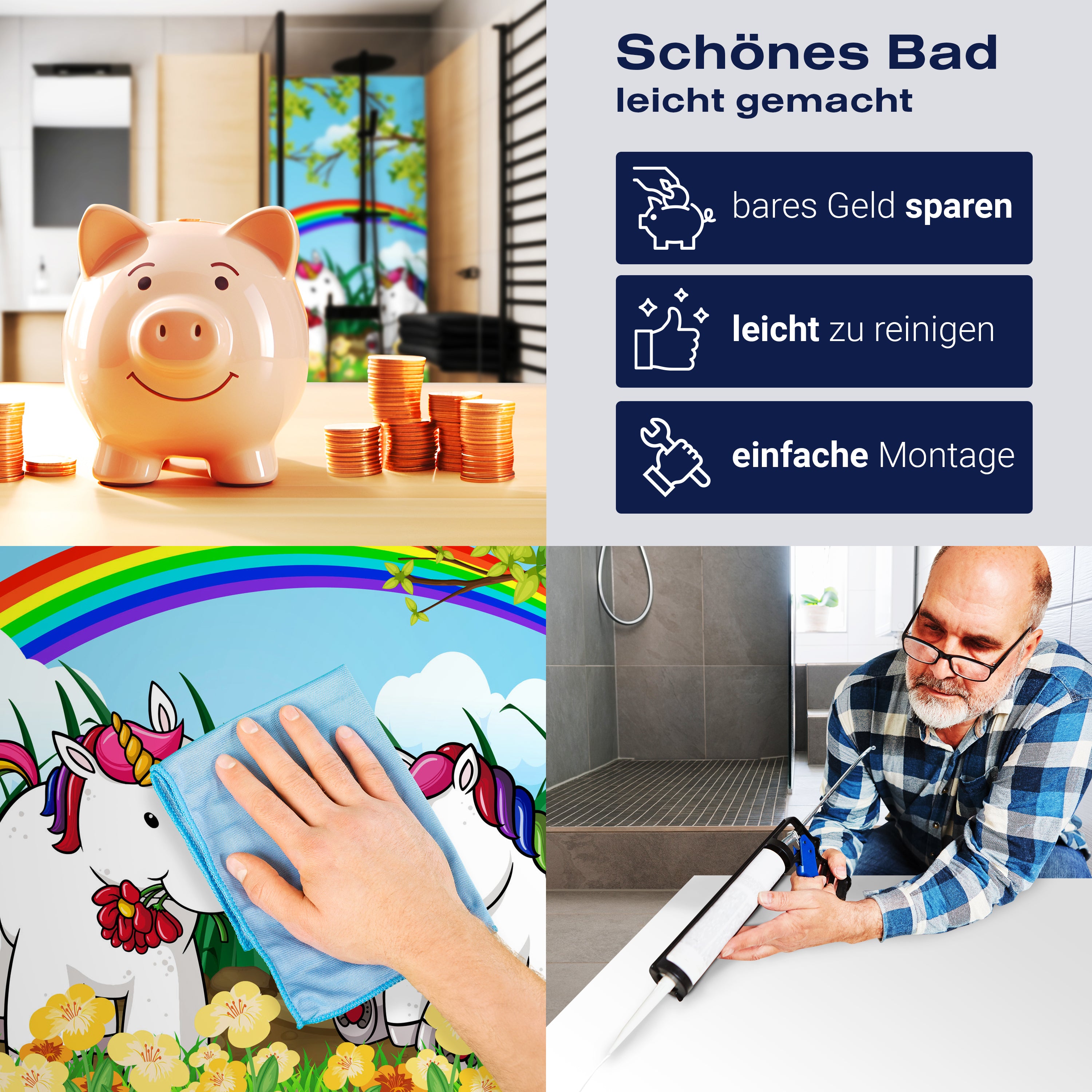 Bist du es leid, auf die langweiligen, schwer zu reinigende Fliesen in deiner Dusche zu schauen? Stell dir vor, wie dein Bad mit einer stilvollen, modernen Rückwand zum Leben erwacht! Unsere Duschwand 'Einhörner' ist nicht nur ein optisches Highlight, sondern auch praktisch und pflegeleicht.