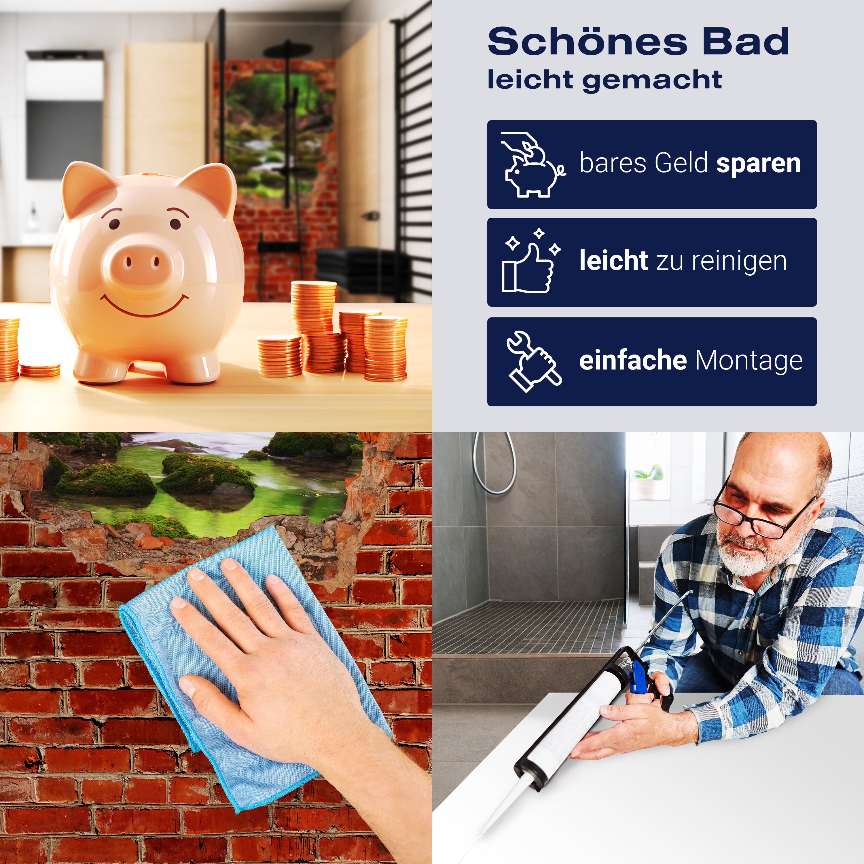 Vergiss die Tage, an denen Spritzer und Flecken deine Dusche ruiniert haben. Mit der Duschrückwand 'Fluss im Wald - Roter Backstein' gehören solche Sorgen der Vergangenheit an. Das hochwertige Material sorgt dafür, dass deine Dusche gegen Wasser und andere alltägliche Missgeschicke resistent ist. Ein einfacher Wisch, und sie sieht aus wie neu – ohne den Einsatz von aggressiven Reinigungsmitteln.