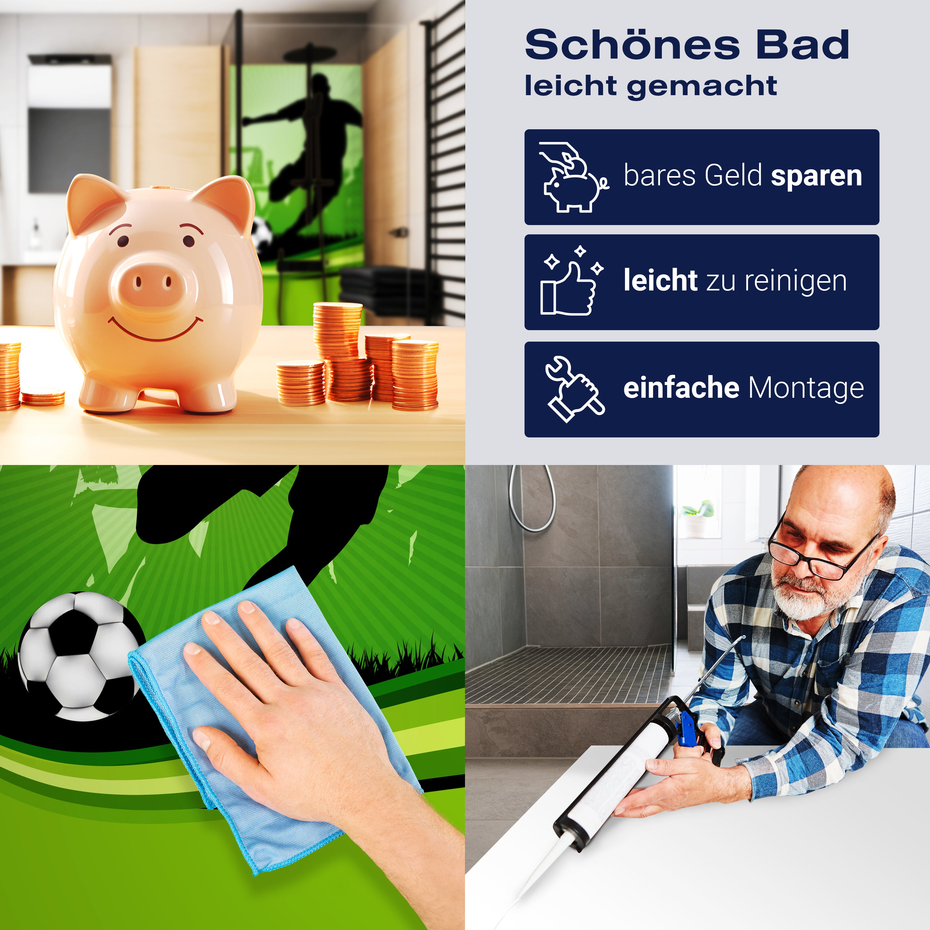 Bist du es leid, auf die langweiligen, schwer zu reinigende Fliesen in deiner Dusche zu schauen? Stell dir vor, wie dein Bad mit einer stilvollen, modernen Rückwand zum Leben erwacht! Unsere Duschwand 'Fussball' ist nicht nur ein optisches Highlight, sondern auch praktisch und pflegeleicht.