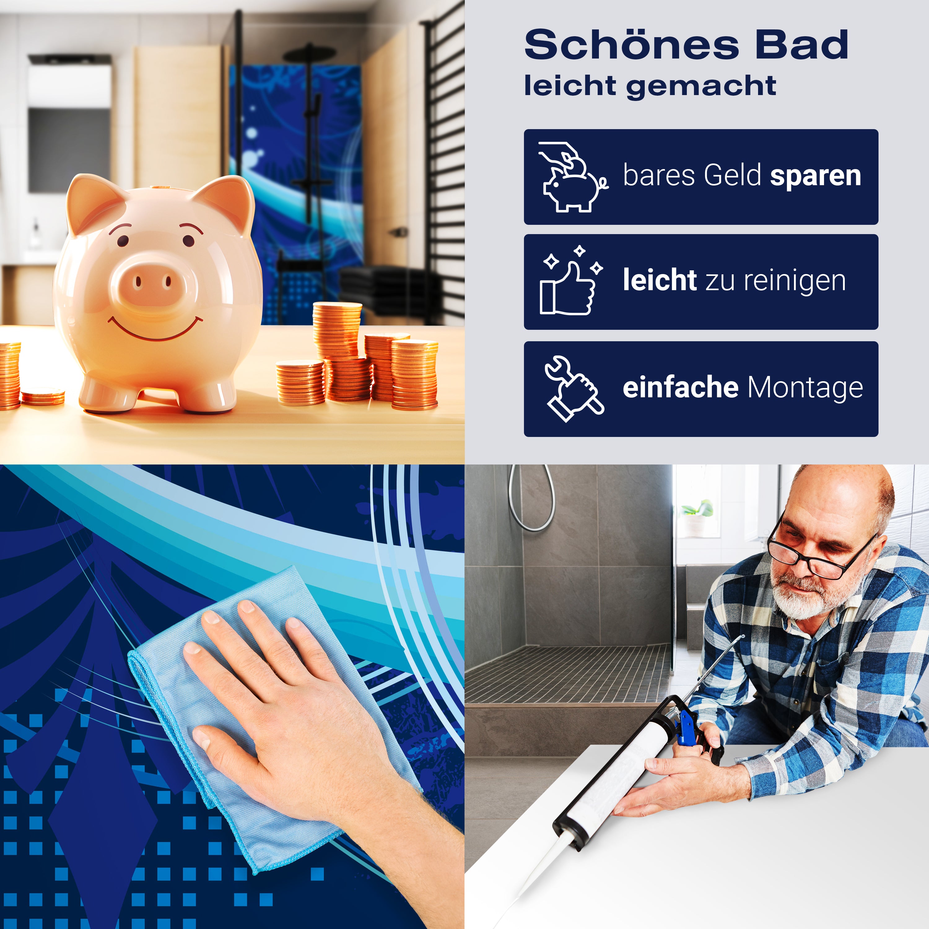 Die Reinigung Deiner Duschwand war noch nie so einfach. In einer Welt, in der Zeit ein kostbares Gut ist, verstehen wir, wie wichtig es ist, Reinigungsprozesse so effizient und mühelos wie möglich zu gestalten. Unsere Duschwände sind speziell dafür entworfen, Dein Leben leichter zu machen. Dank der glatten Oberfläche und der widerstandsfähigen Beschichtung lassen sich Spritzer und Flecken ohne großen Aufwand entfernen – ein schneller Wisch mit einem handelsüblichen Lappen, Spül- oder Wischtuch, und Deine Rückwand sieht aus wie neu.