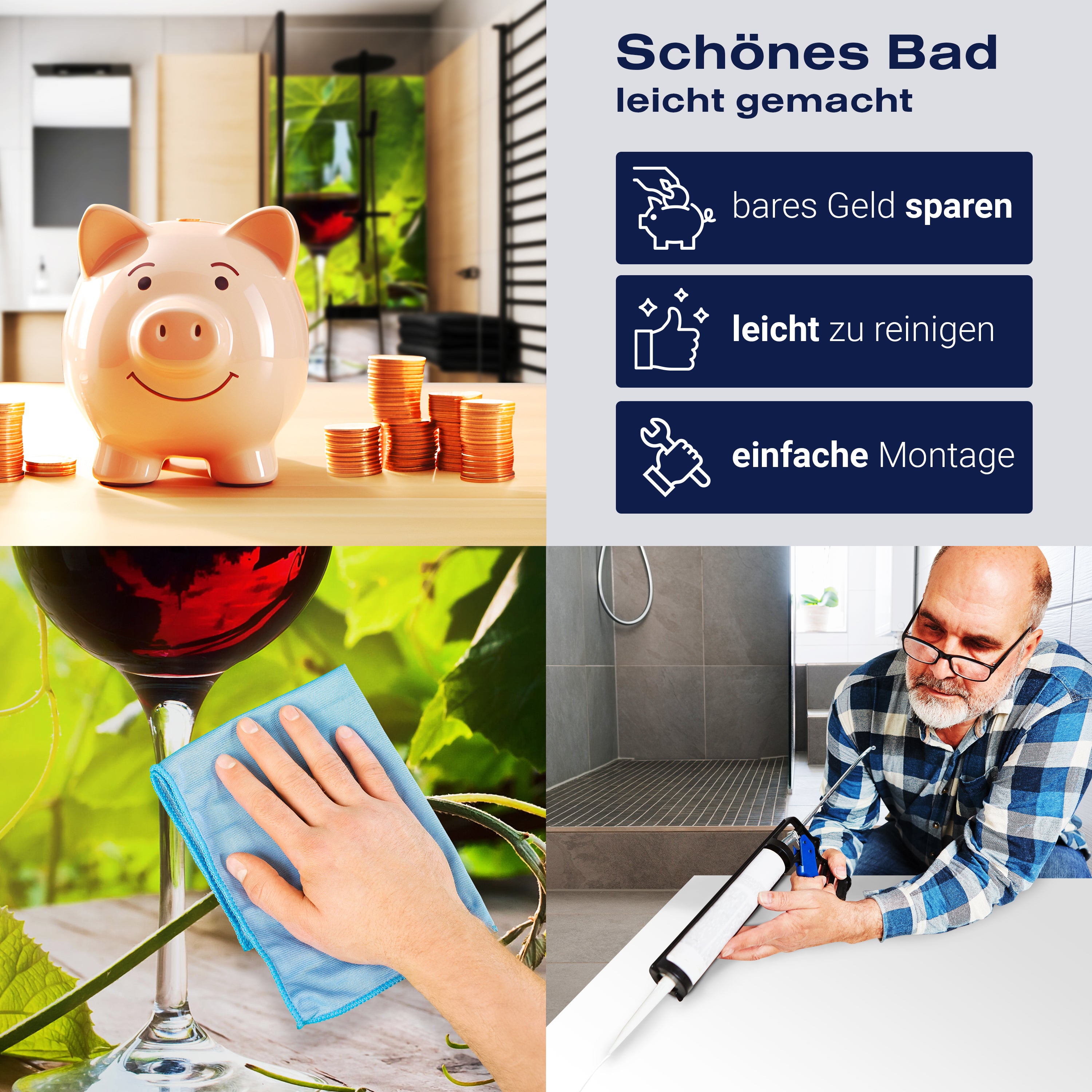 Die Reinigung Deiner Duschwand war noch nie so einfach. In einer Welt, in der Zeit ein kostbares Gut ist, verstehen wir, wie wichtig es ist, Reinigungsprozesse so effizient und mühelos wie möglich zu gestalten. Unsere Duschwände sind speziell dafür entworfen, Dein Leben leichter zu machen. Dank der glatten Oberfläche und der widerstandsfähigen Beschichtung lassen sich Spritzer und Flecken ohne großen Aufwand entfernen – ein schneller Wisch mit einem handelsüblichen Lappen, Spül- oder Wischtuch, und Deine Rückwand sieht aus wie neu.