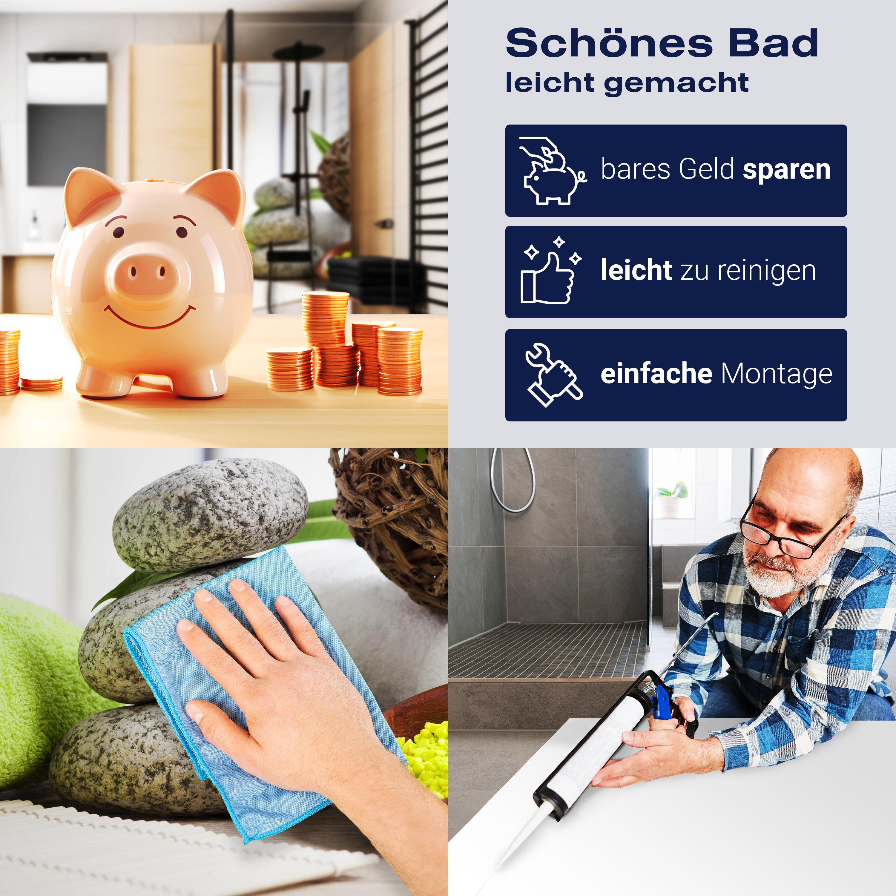 Die Reinigung Deiner Duschwand war noch nie so einfach. In einer Welt, in der Zeit ein kostbares Gut ist, verstehen wir, wie wichtig es ist, Reinigungsprozesse so effizient und mühelos wie möglich zu gestalten. Unsere Duschwände sind speziell dafür entworfen, Dein Leben leichter zu machen. Dank der glatten Oberfläche und der widerstandsfähigen Beschichtung lassen sich Spritzer und Flecken ohne großen Aufwand entfernen – ein schneller Wisch mit einem handelsüblichen Lappen, Spül- oder Wischtuch, und Deine Rückwand sieht aus wie neu.