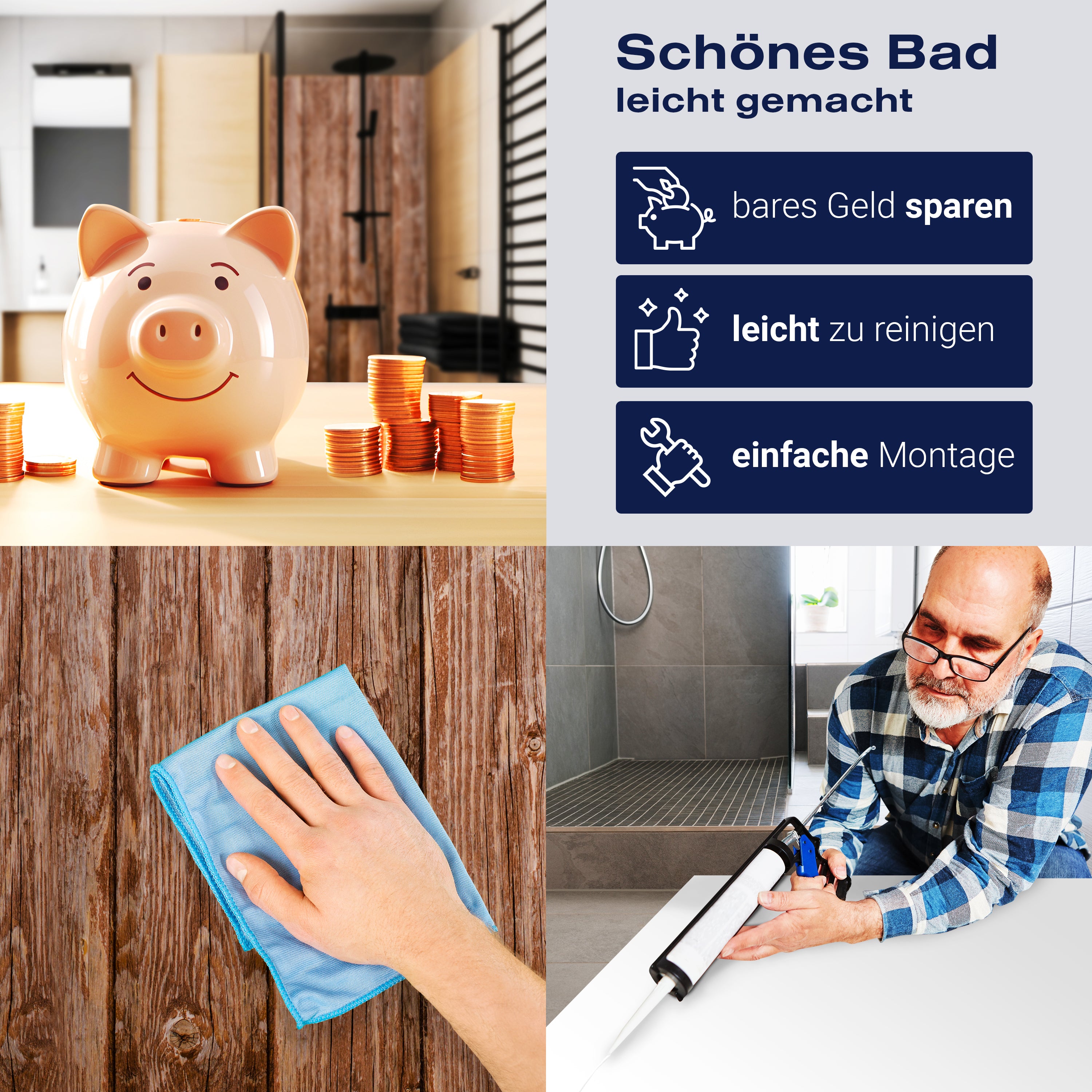 Die Reinigung Deiner Duschwand war noch nie so einfach. In einer Welt, in der Zeit ein kostbares Gut ist, verstehen wir, wie wichtig es ist, Reinigungsprozesse so effizient und mühelos wie möglich zu gestalten. Unsere Duschwände sind speziell dafür entworfen, Dein Leben leichter zu machen. Dank der glatten Oberfläche und der widerstandsfähigen Beschichtung lassen sich Spritzer und Flecken ohne großen Aufwand entfernen – ein schneller Wisch mit einem handelsüblichen Lappen, Spül- oder Wischtuch, und Deine Rückwand sieht aus wie neu.