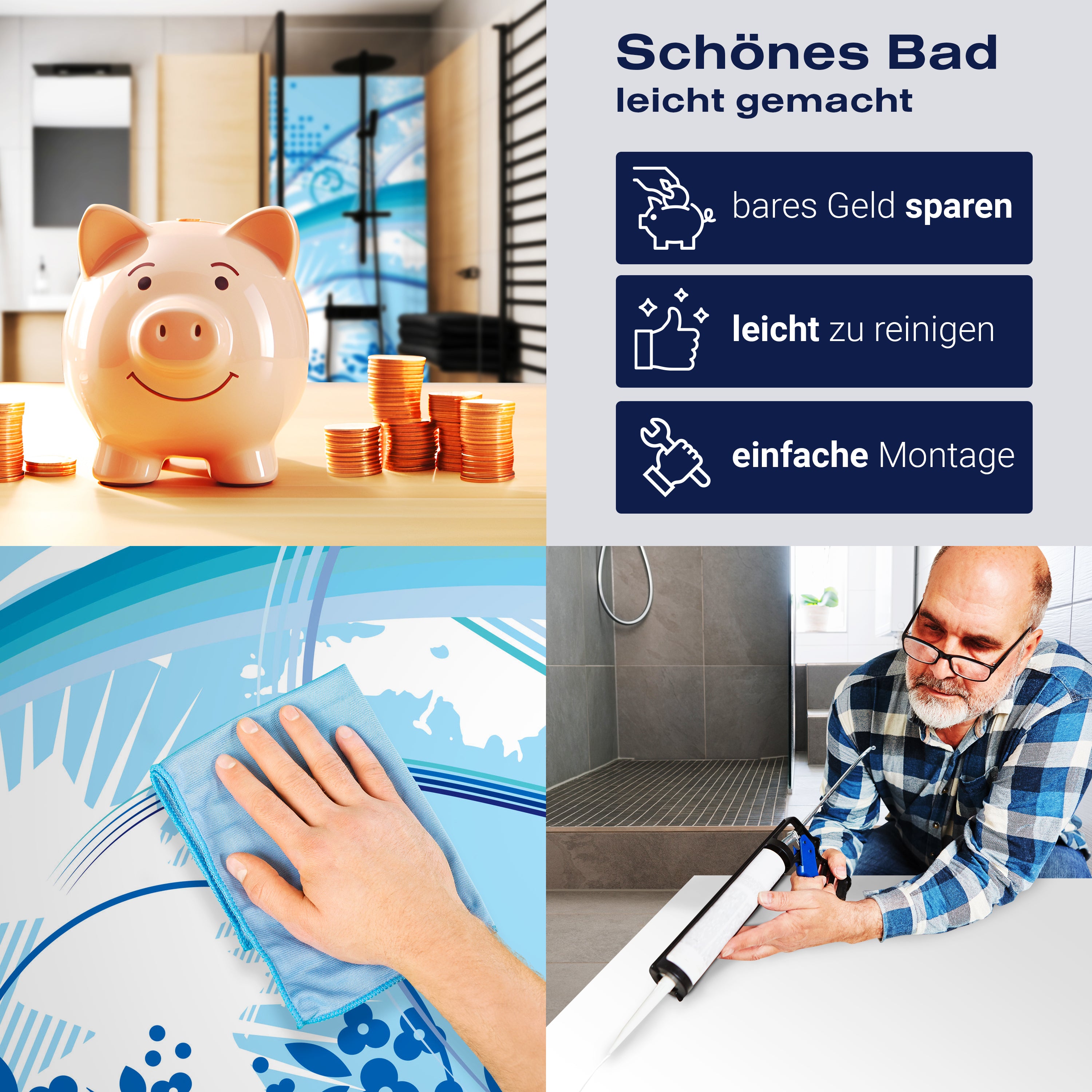 Die Reinigung Deiner Duschwand war noch nie so einfach. In einer Welt, in der Zeit ein kostbares Gut ist, verstehen wir, wie wichtig es ist, Reinigungsprozesse so effizient und mühelos wie möglich zu gestalten. Unsere Duschwände sind speziell dafür entworfen, Dein Leben leichter zu machen. Dank der glatten Oberfläche und der widerstandsfähigen Beschichtung lassen sich Spritzer und Flecken ohne großen Aufwand entfernen – ein schneller Wisch mit einem handelsüblichen Lappen, Spül- oder Wischtuch, und Deine Rückwand sieht aus wie neu.