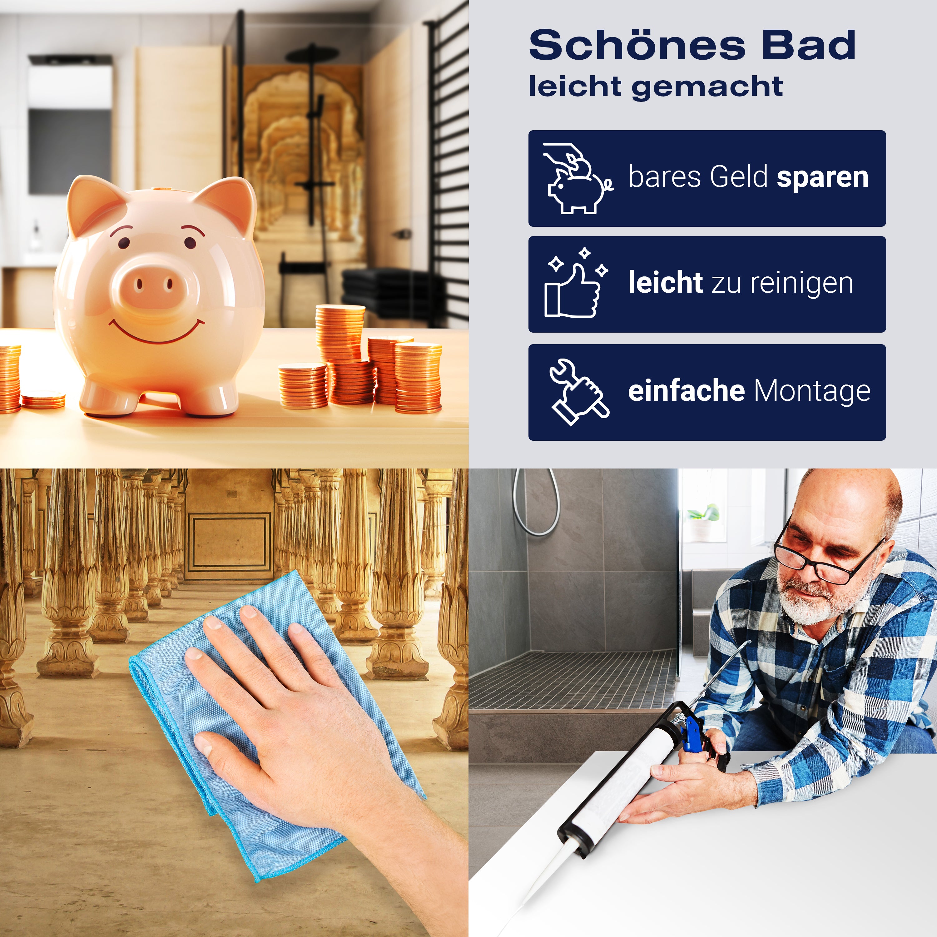 Die Reinigung Deiner Duschwand war noch nie so einfach. In einer Welt, in der Zeit ein kostbares Gut ist, verstehen wir, wie wichtig es ist, Reinigungsprozesse so effizient und mühelos wie möglich zu gestalten. Unsere Duschwände sind speziell dafür entworfen, Dein Leben leichter zu machen. Dank der glatten Oberfläche und der widerstandsfähigen Beschichtung lassen sich Spritzer und Flecken ohne großen Aufwand entfernen – ein schneller Wisch mit einem handelsüblichen Lappen, Spül- oder Wischtuch, und Deine Rückwand sieht aus wie neu.