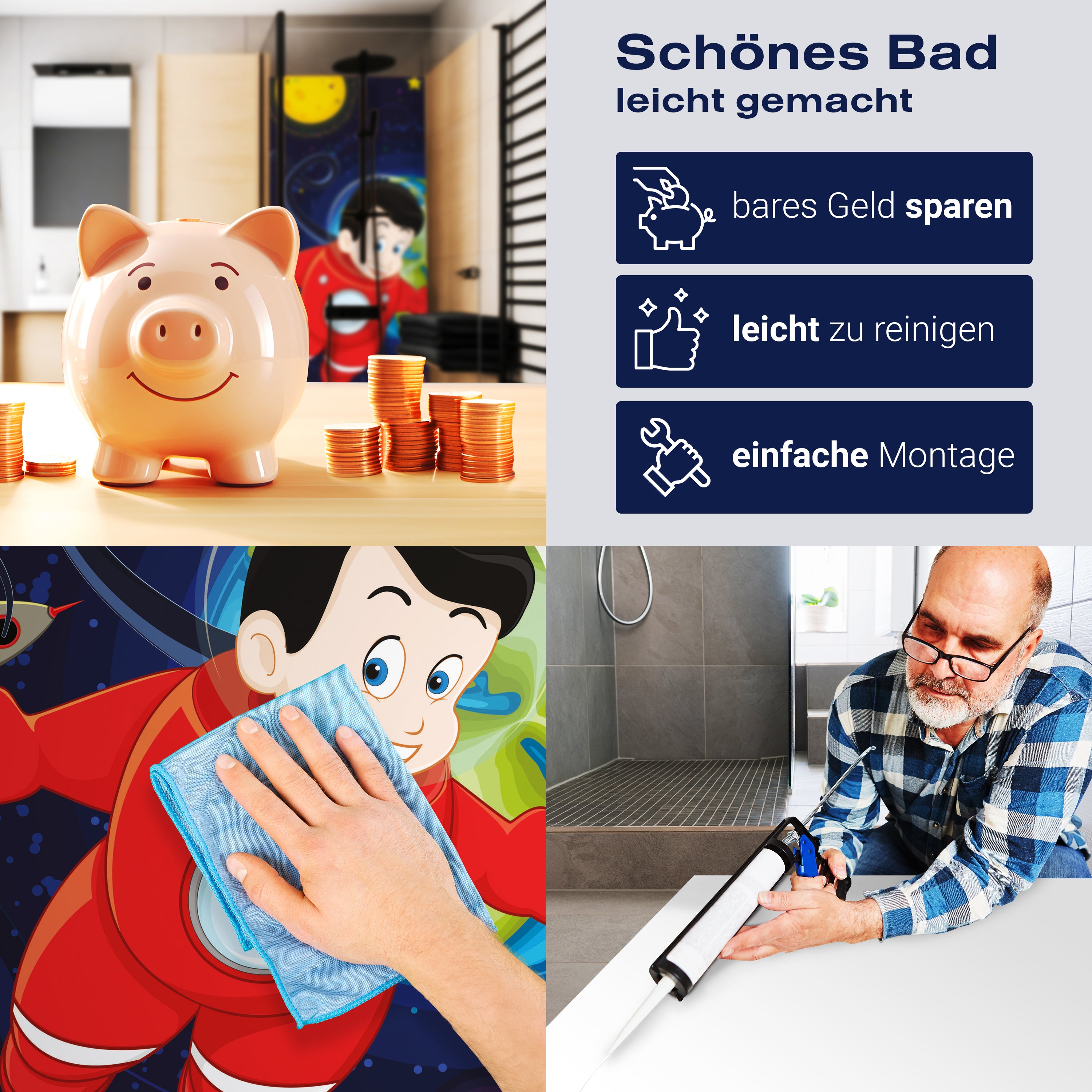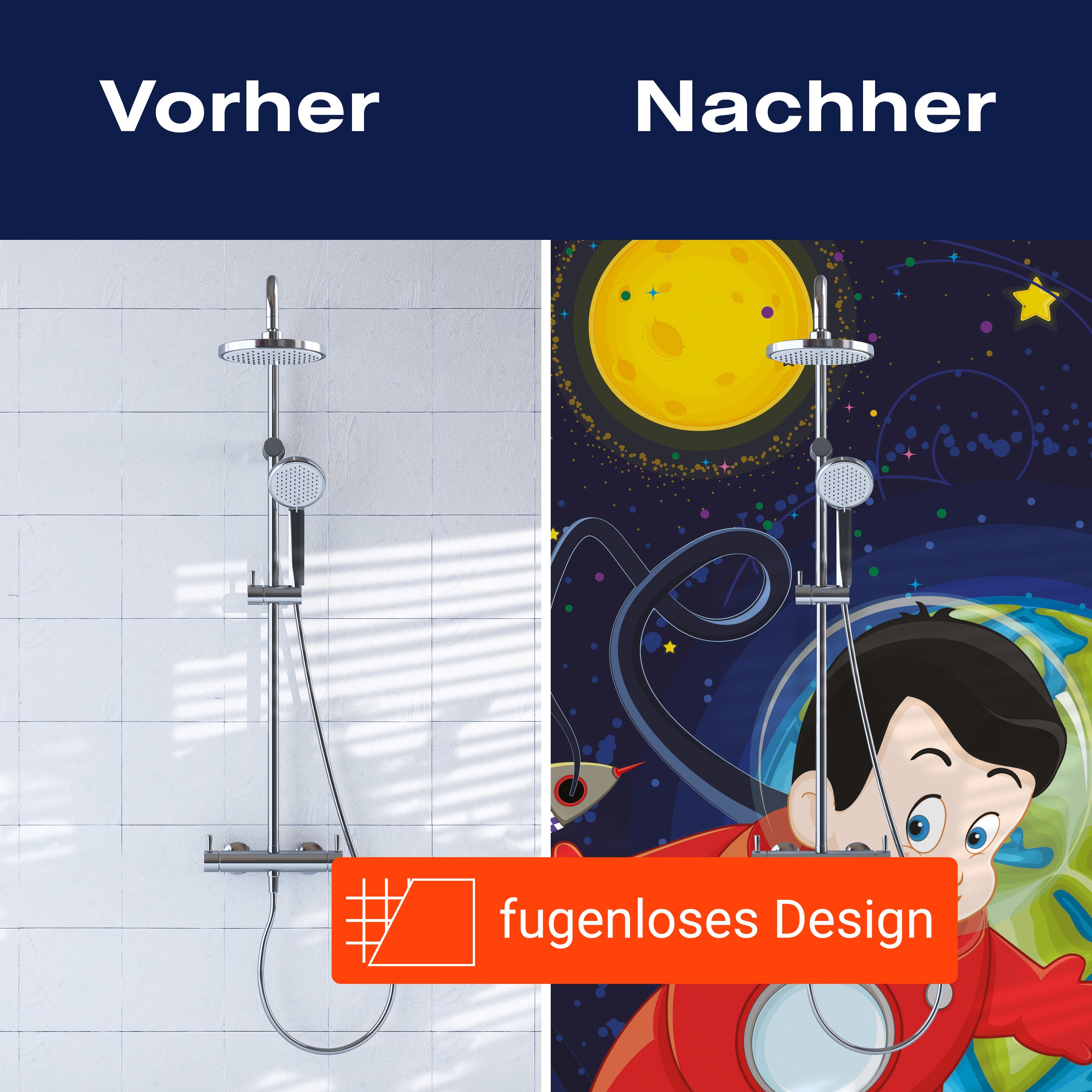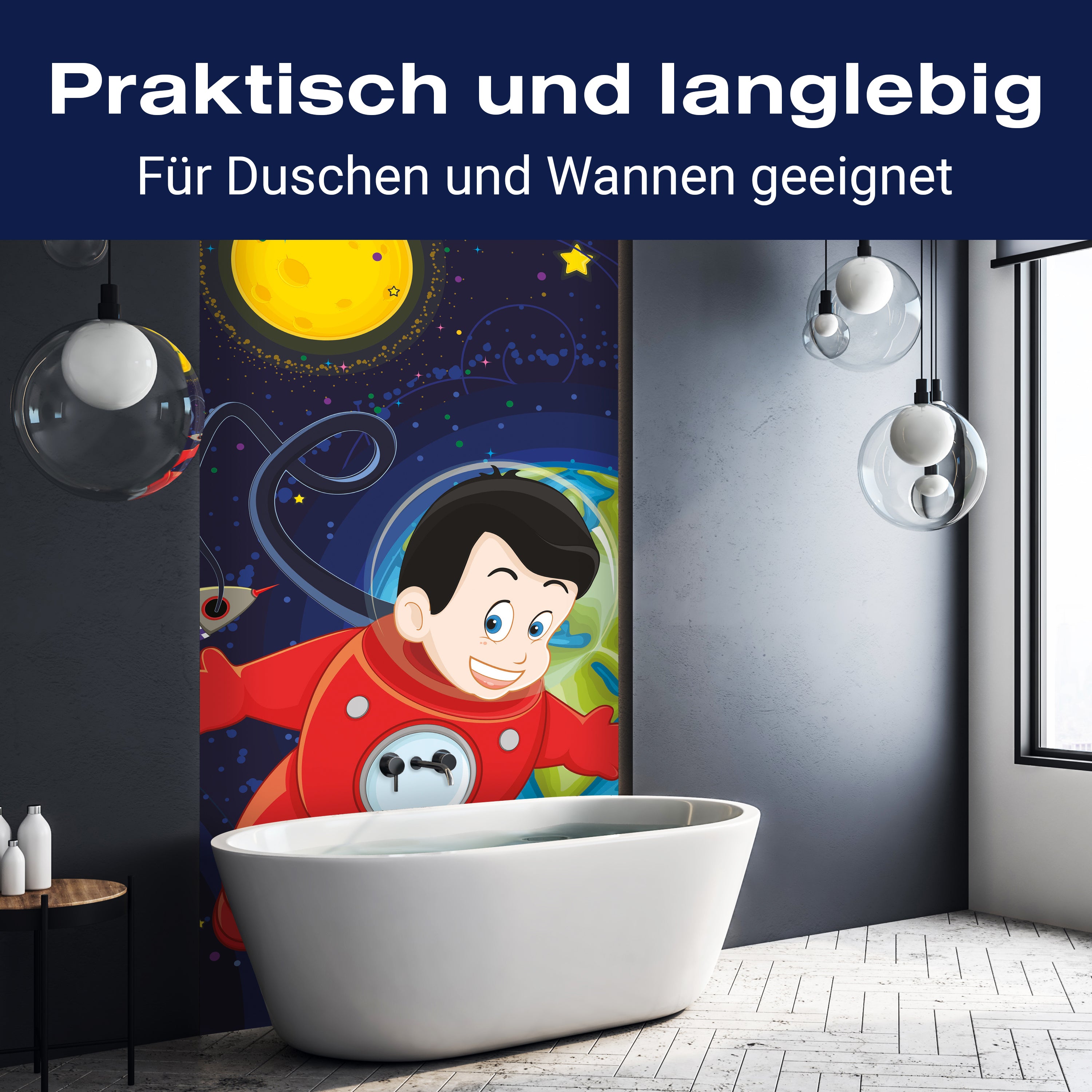 Bist du es leid, auf die langweiligen, schwer zu reinigende Fliesen in deiner Dusche zu schauen? Stell dir vor, wie dein Bad mit einer stilvollen, modernen Rückwand zum Leben erwacht! Unsere Duschwand 'Junge im Weltall' ist nicht nur ein optisches Highlight, sondern auch praktisch und pflegeleicht.