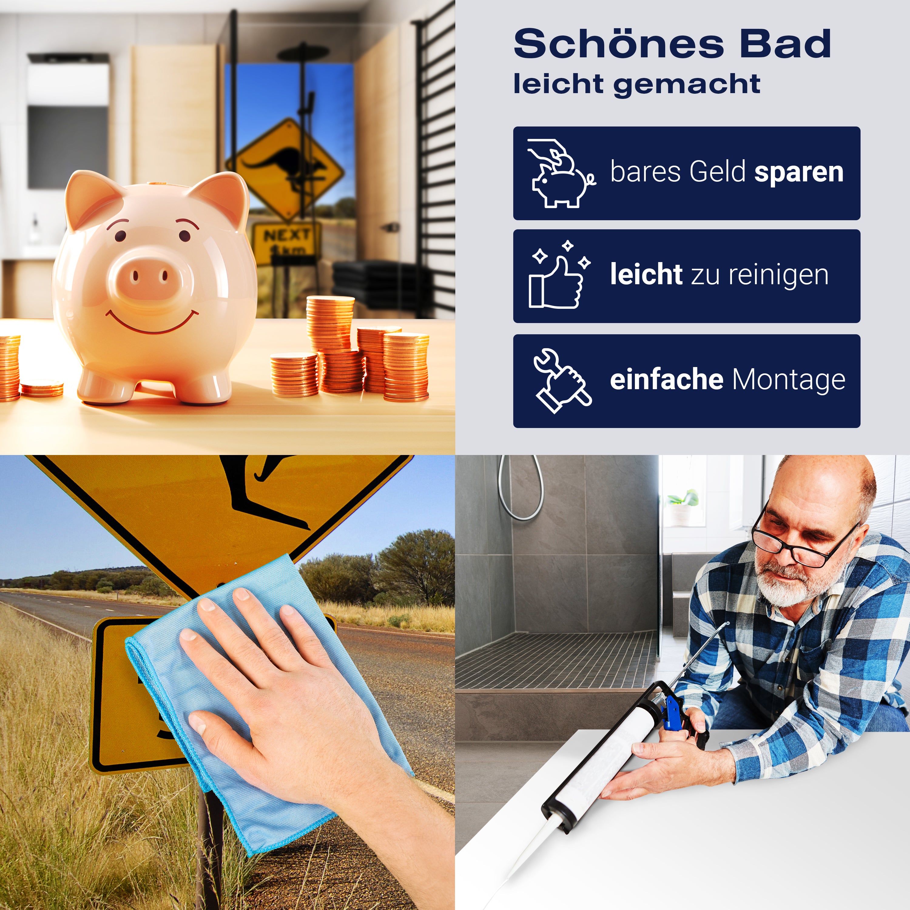 Bist du es leid, auf die langweiligen, schwer zu reinigende Fliesen in deiner Dusche zu schauen? Stell dir vor, wie dein Bad mit einer stilvollen, modernen Rückwand zum Leben erwacht! Unsere Duschwand 'Känguruschild' ist nicht nur ein optisches Highlight, sondern auch praktisch und pflegeleicht.