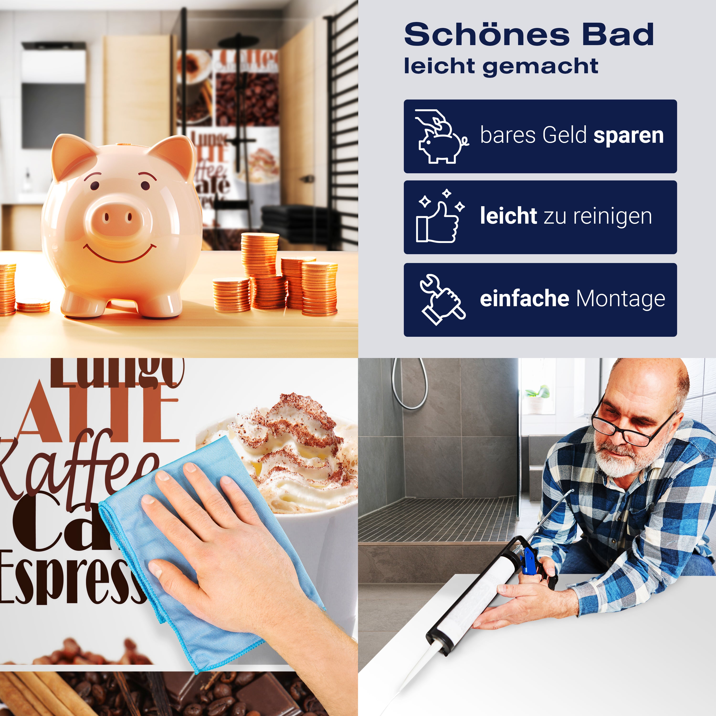 Bist du es leid, auf die langweiligen, schwer zu reinigende Fliesen in deiner Dusche zu schauen? Stell dir vor, wie dein Bad mit einer stilvollen, modernen Rückwand zum Leben erwacht! Unsere Duschwand 'Kaffee' ist nicht nur ein optisches Highlight, sondern auch praktisch und pflegeleicht.