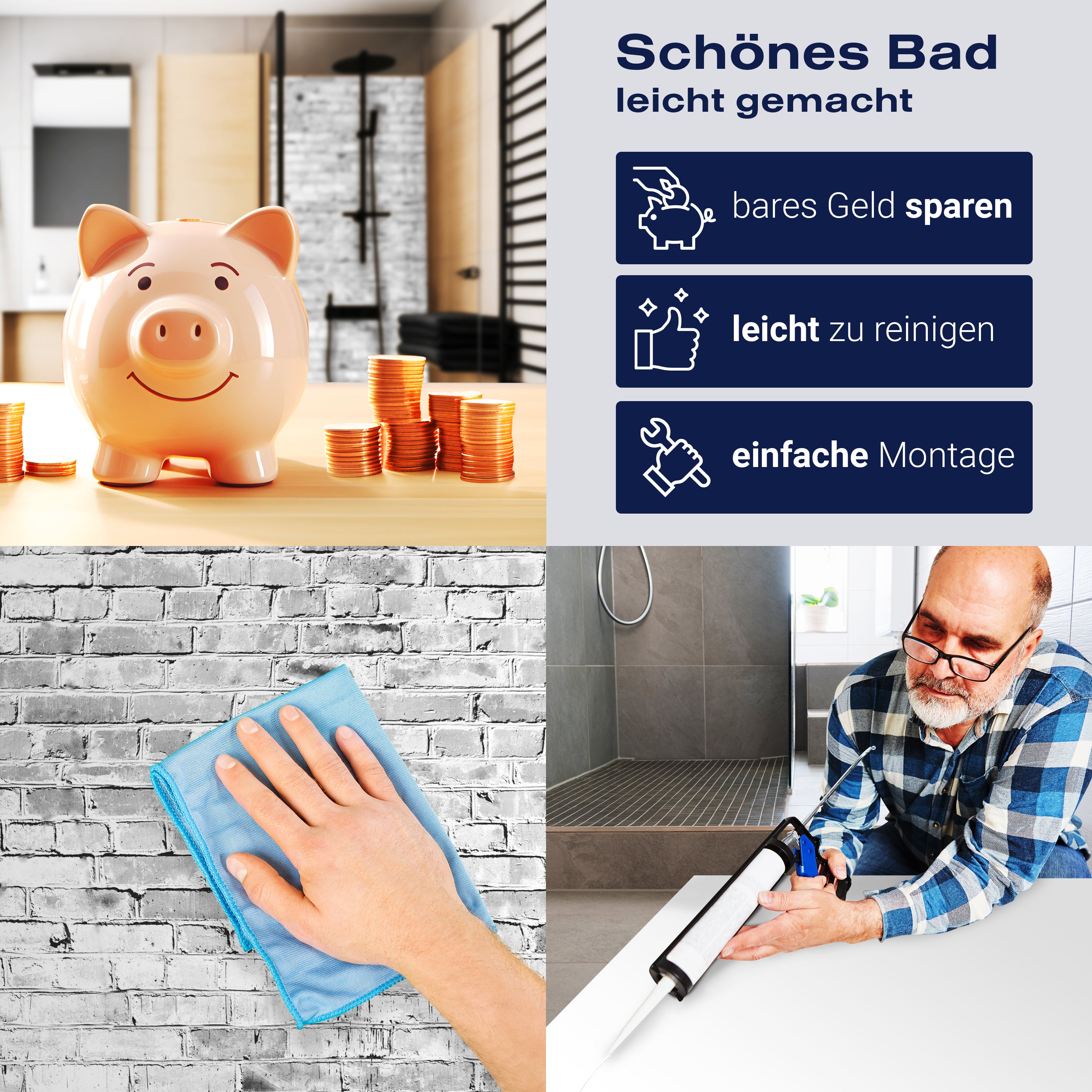 Die Reinigung Deiner Duschwand war noch nie so einfach. In einer Welt, in der Zeit ein kostbares Gut ist, verstehen wir, wie wichtig es ist, Reinigungsprozesse so effizient und mühelos wie möglich zu gestalten. Unsere Duschwände sind speziell dafür entworfen, Dein Leben leichter zu machen. Dank der glatten Oberfläche und der widerstandsfähigen Beschichtung lassen sich Spritzer und Flecken ohne großen Aufwand entfernen – ein schneller Wisch mit einem handelsüblichen Lappen, Spül- oder Wischtuch, und Deine Rückwand sieht aus wie neu.