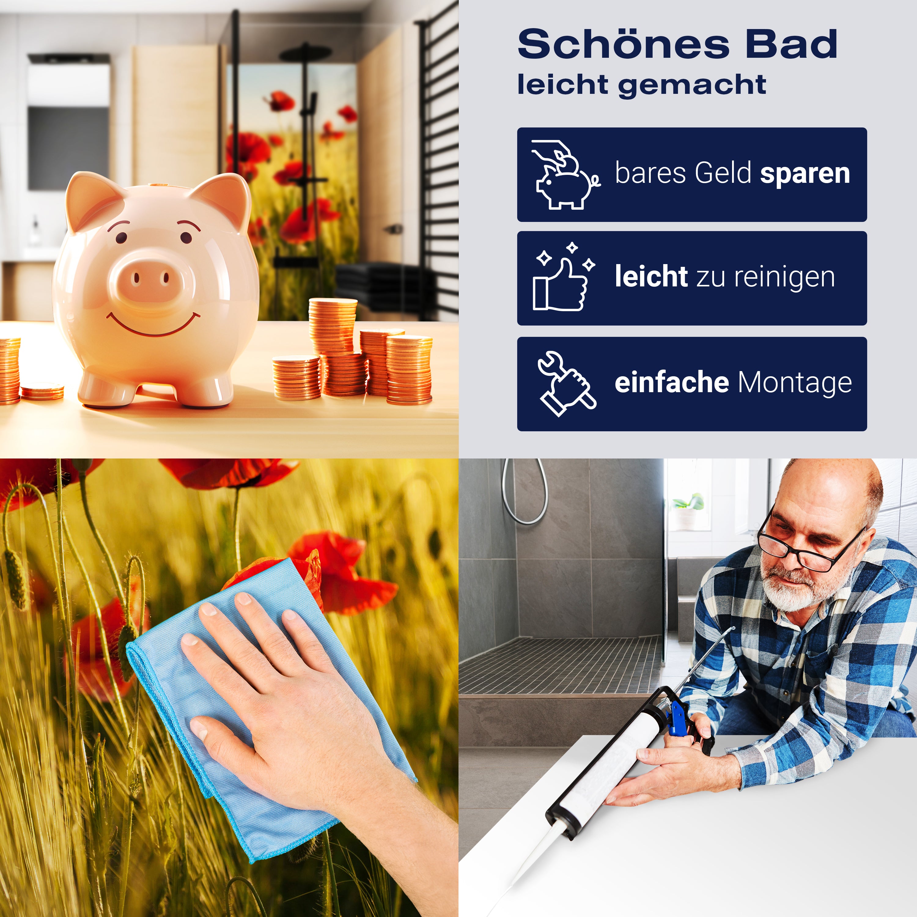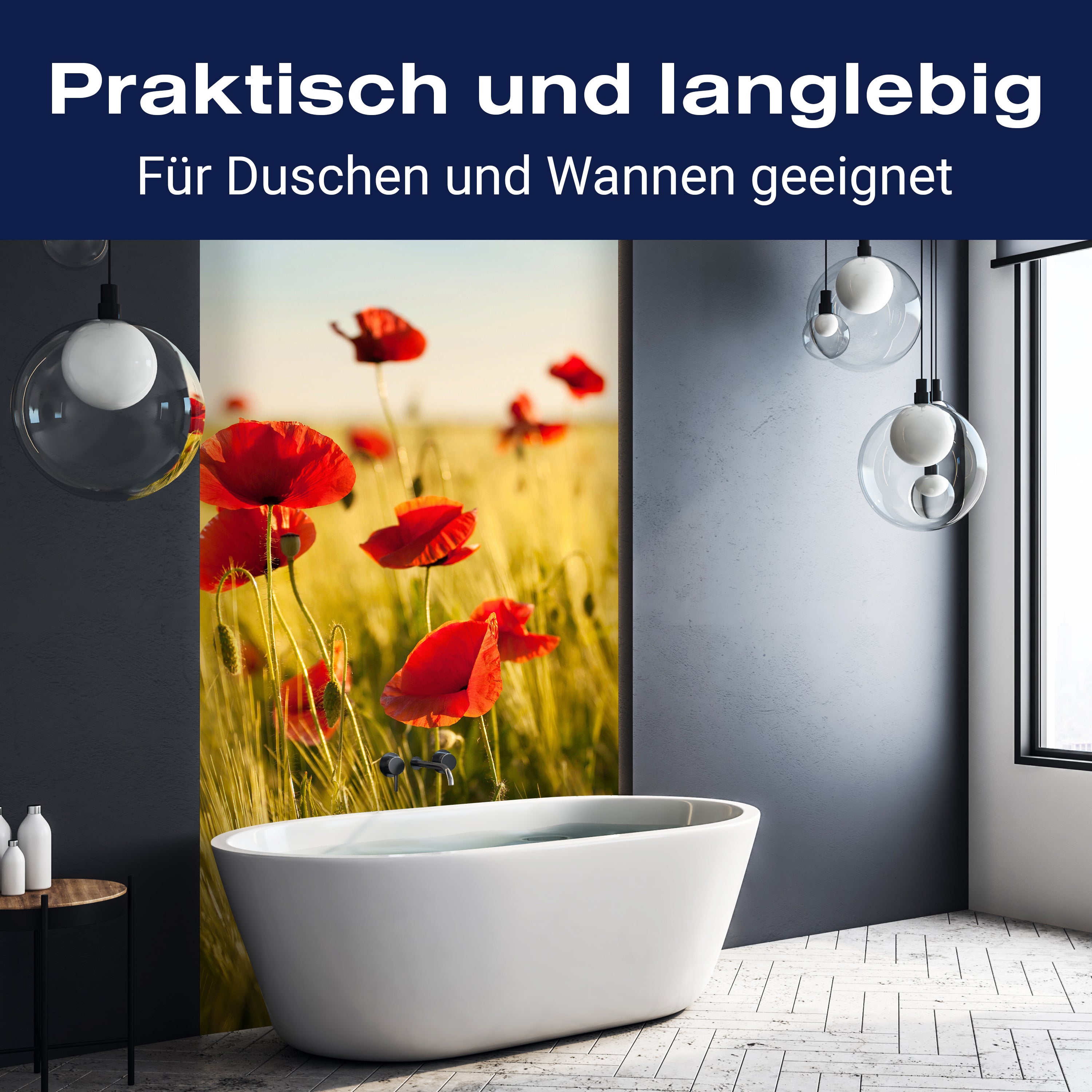 Bist du es leid, auf die langweiligen, schwer zu reinigende Fliesen in deiner Dusche zu schauen? Stell dir vor, wie dein Bad mit einer stilvollen, modernen Rückwand zum Leben erwacht! Unsere Duschwand 'Kornfeld mit Mohnblumen' ist nicht nur ein optisches Highlight, sondern auch praktisch und pflegeleicht.