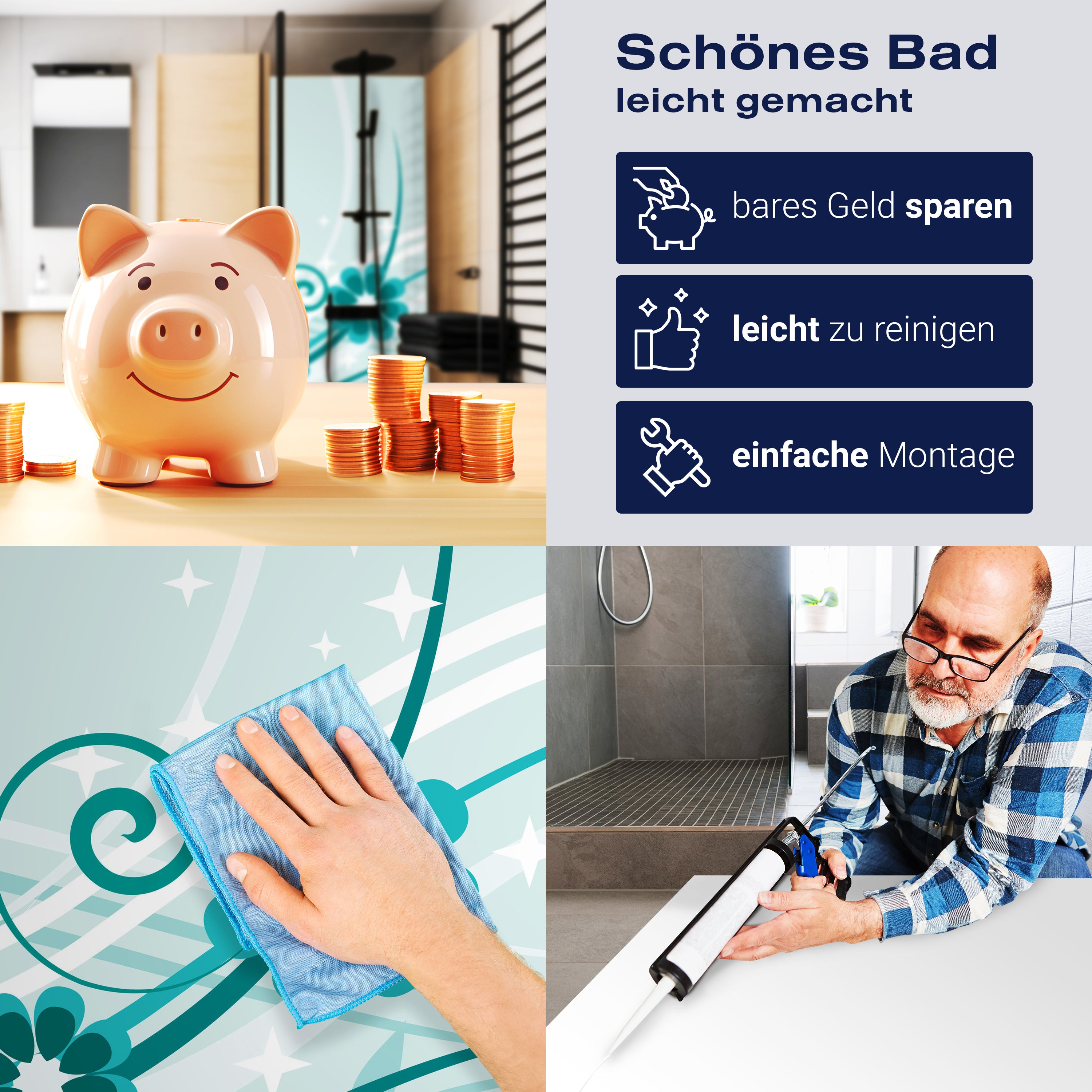 Die Reinigung Deiner Duschwand war noch nie so einfach. In einer Welt, in der Zeit ein kostbares Gut ist, verstehen wir, wie wichtig es ist, Reinigungsprozesse so effizient und mühelos wie möglich zu gestalten. Unsere Duschwände sind speziell dafür entworfen, Dein Leben leichter zu machen. Dank der glatten Oberfläche und der widerstandsfähigen Beschichtung lassen sich Spritzer und Flecken ohne großen Aufwand entfernen – ein schneller Wisch mit einem handelsüblichen Lappen, Spül- oder Wischtuch, und Deine Rückwand sieht aus wie neu.