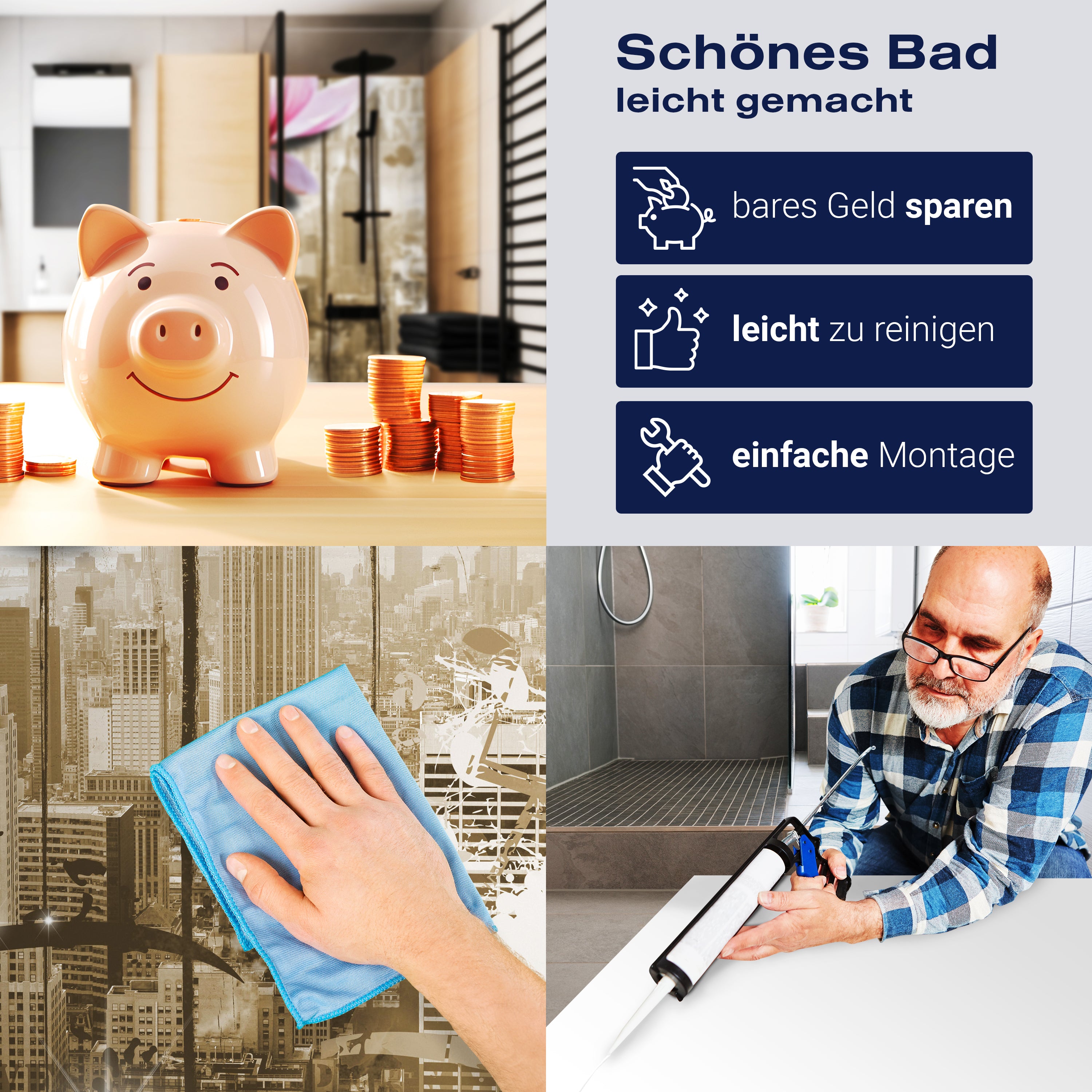 Die Reinigung Deiner Duschwand war noch nie so einfach. In einer Welt, in der Zeit ein kostbares Gut ist, verstehen wir, wie wichtig es ist, Reinigungsprozesse so effizient und mühelos wie möglich zu gestalten. Unsere Duschwände sind speziell dafür entworfen, Dein Leben leichter zu machen. Dank der glatten Oberfläche und der widerstandsfähigen Beschichtung lassen sich Spritzer und Flecken ohne großen Aufwand entfernen – ein schneller Wisch mit einem handelsüblichen Lappen, Spül- oder Wischtuch, und Deine Rückwand sieht aus wie neu.