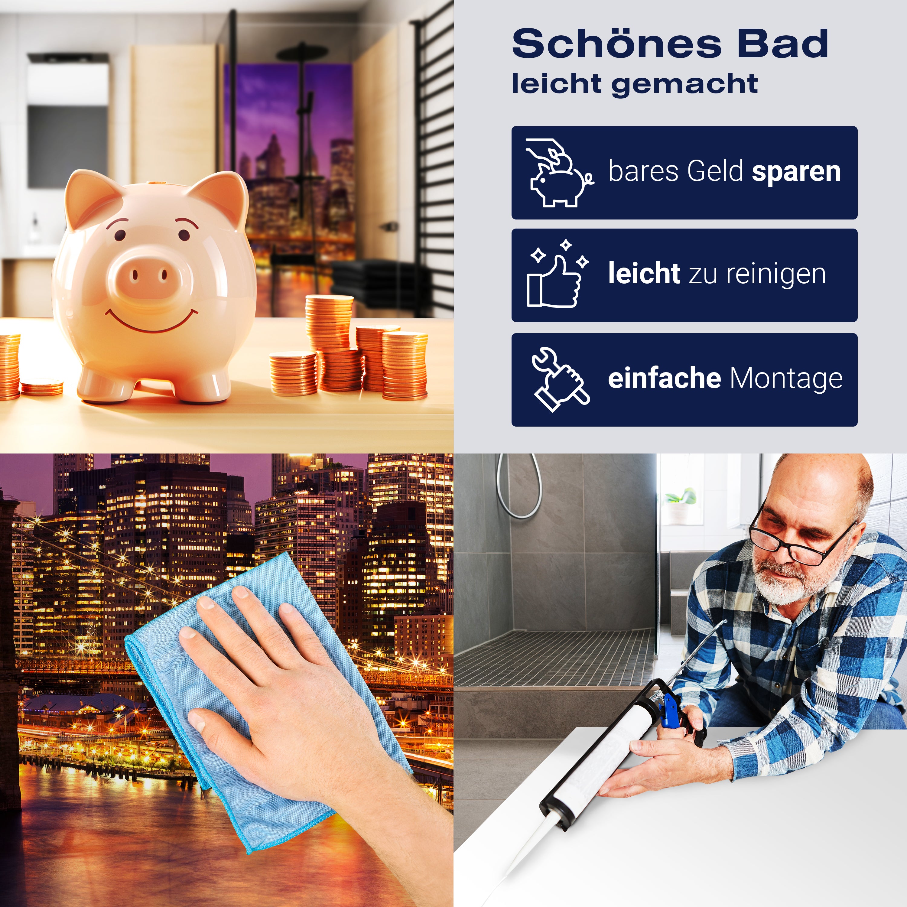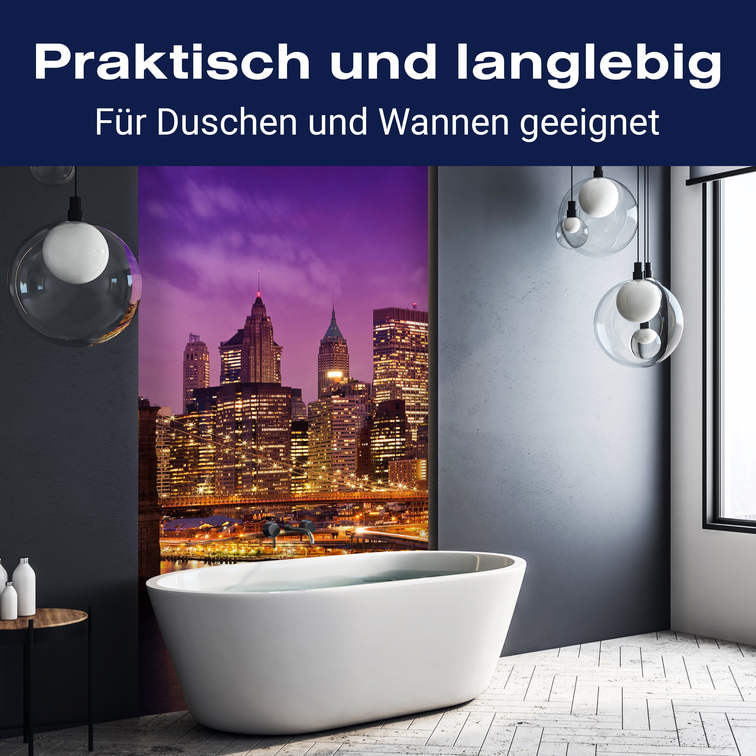 Bist du es leid, auf die langweiligen, schwer zu reinigende Fliesen in deiner Dusche zu schauen? Stell dir vor, wie dein Bad mit einer stilvollen, modernen Rückwand zum Leben erwacht! Unsere Duschwand 'New York bei Nacht' ist nicht nur ein optisches Highlight, sondern auch praktisch und pflegeleicht.