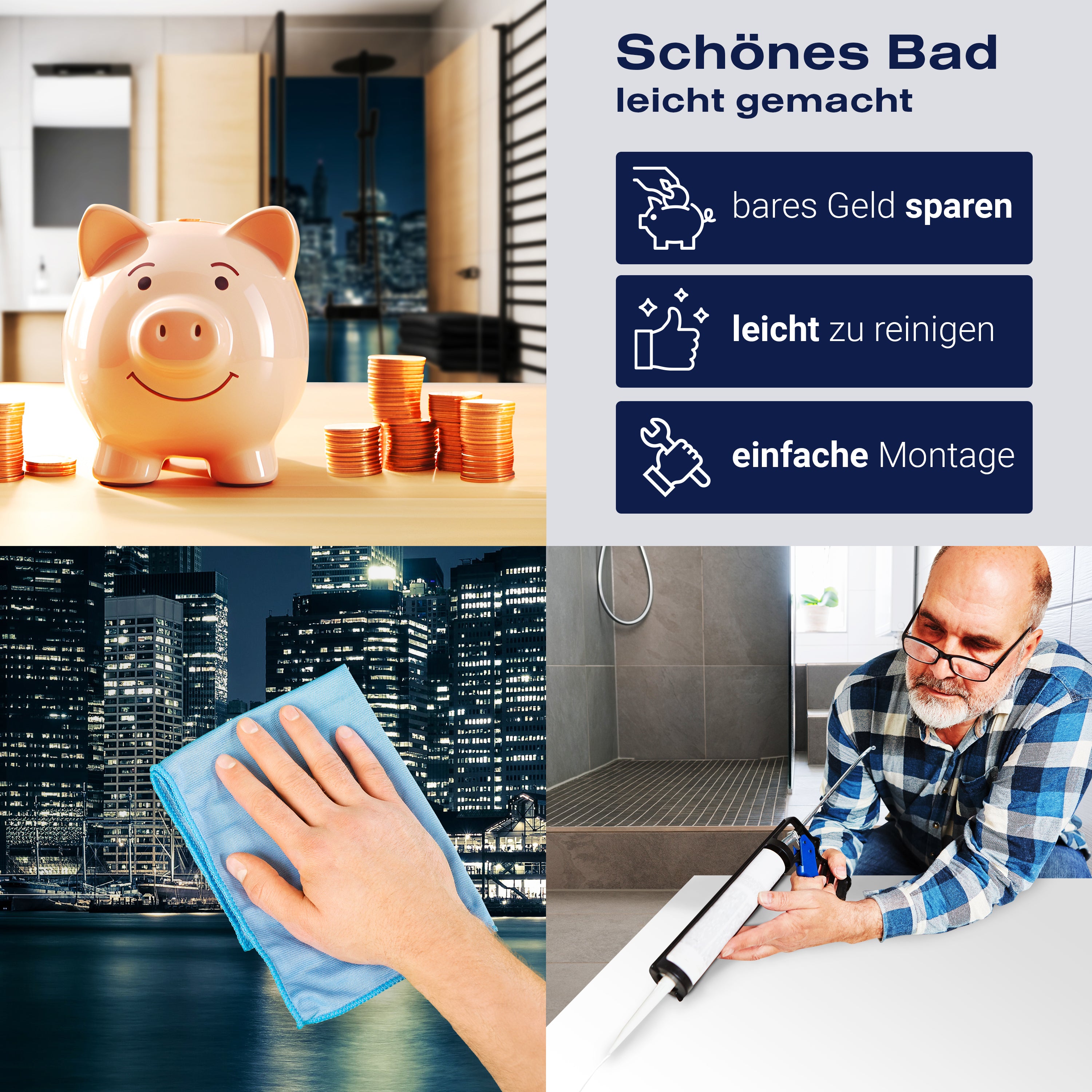Bist du es leid, auf die langweiligen, schwer zu reinigende Fliesen in deiner Dusche zu schauen? Stell dir vor, wie dein Bad mit einer stilvollen, modernen Rückwand zum Leben erwacht! Unsere Duschwand 'New York City' ist nicht nur ein optisches Highlight, sondern auch praktisch und pflegeleicht.