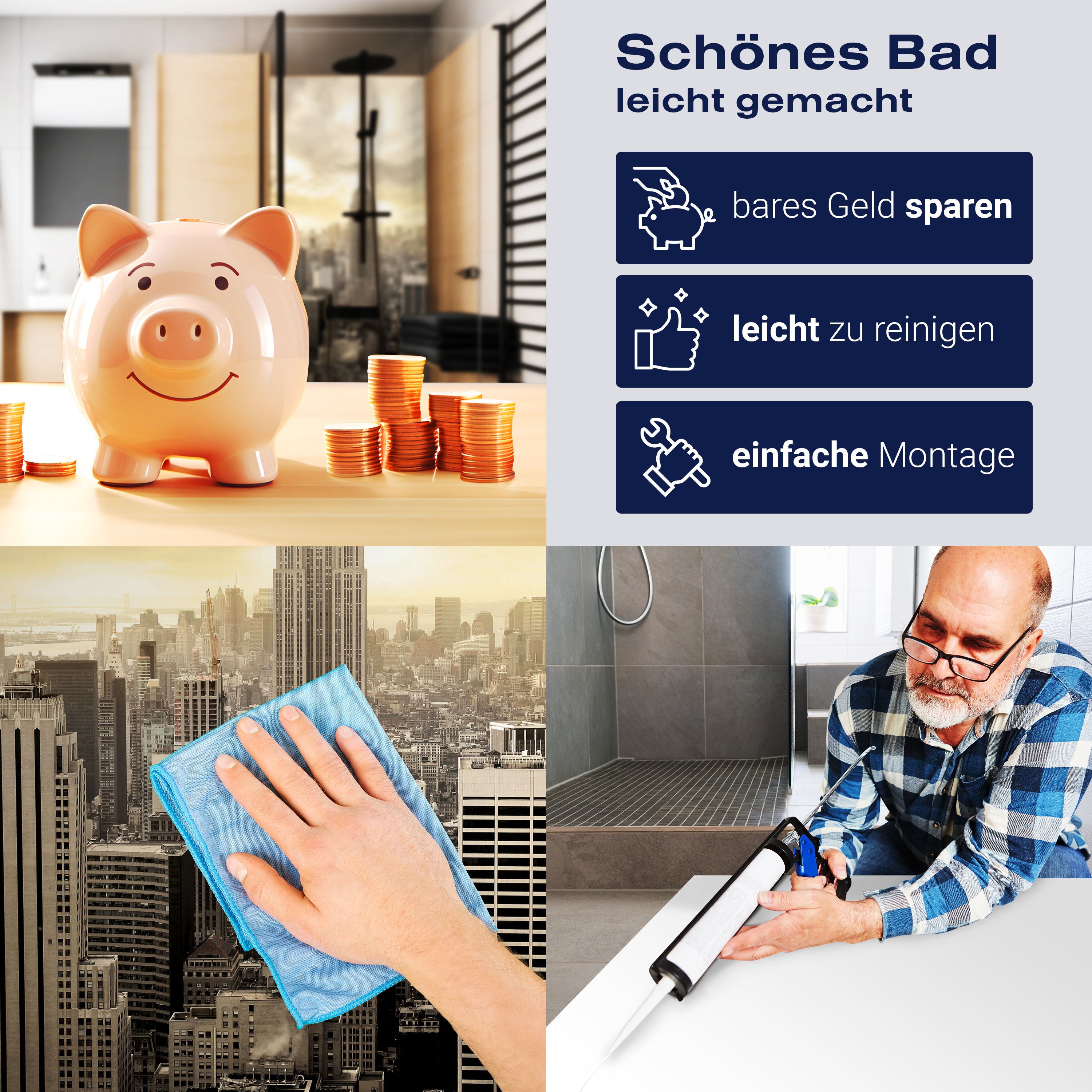 Die Reinigung Deiner Duschwand war noch nie so einfach. In einer Welt, in der Zeit ein kostbares Gut ist, verstehen wir, wie wichtig es ist, Reinigungsprozesse so effizient und mühelos wie möglich zu gestalten. Unsere Duschwände sind speziell dafür entworfen, Dein Leben leichter zu machen. Dank der glatten Oberfläche und der widerstandsfähigen Beschichtung lassen sich Spritzer und Flecken ohne großen Aufwand entfernen – ein schneller Wisch mit einem handelsüblichen Lappen, Spül- oder Wischtuch, und Deine Rückwand sieht aus wie neu.