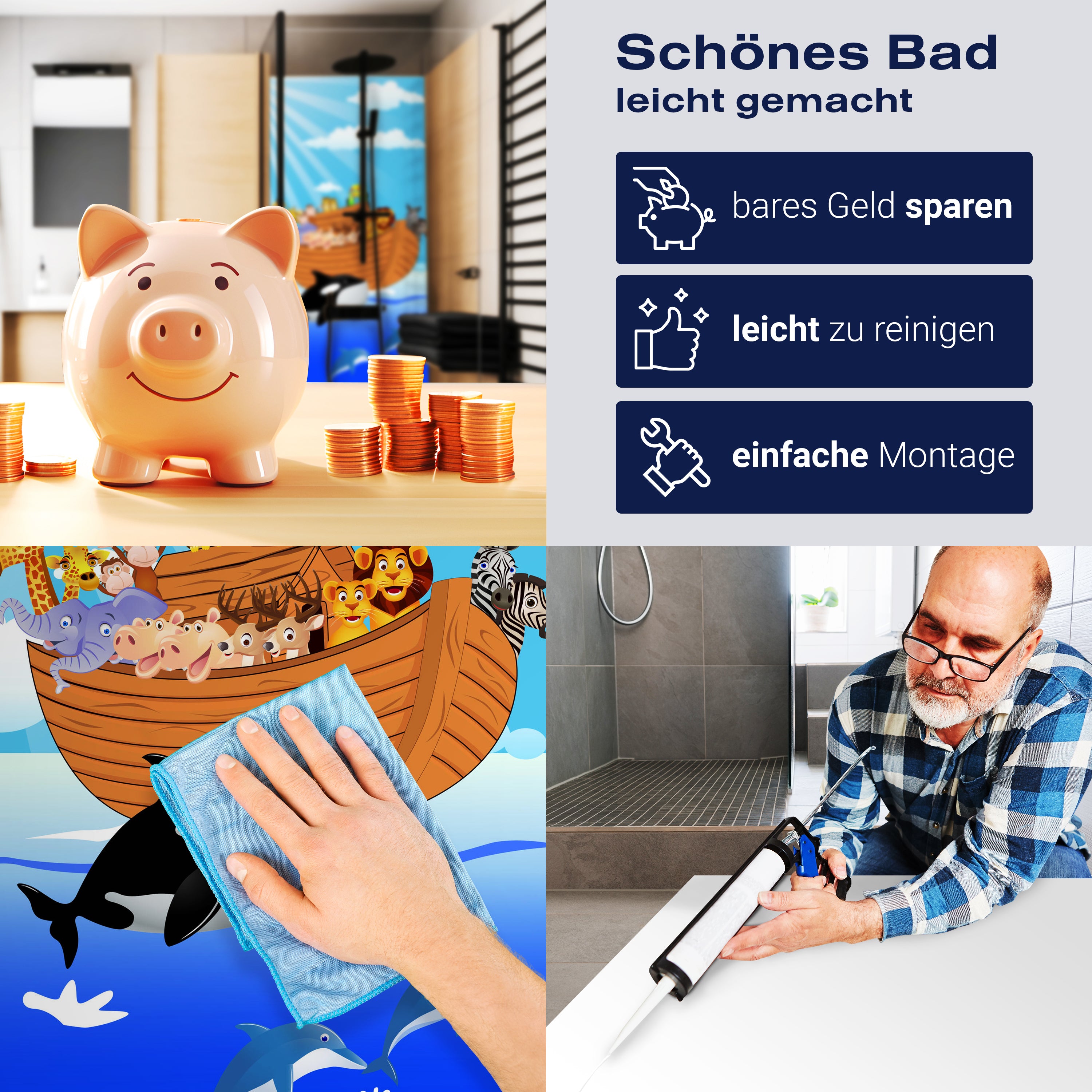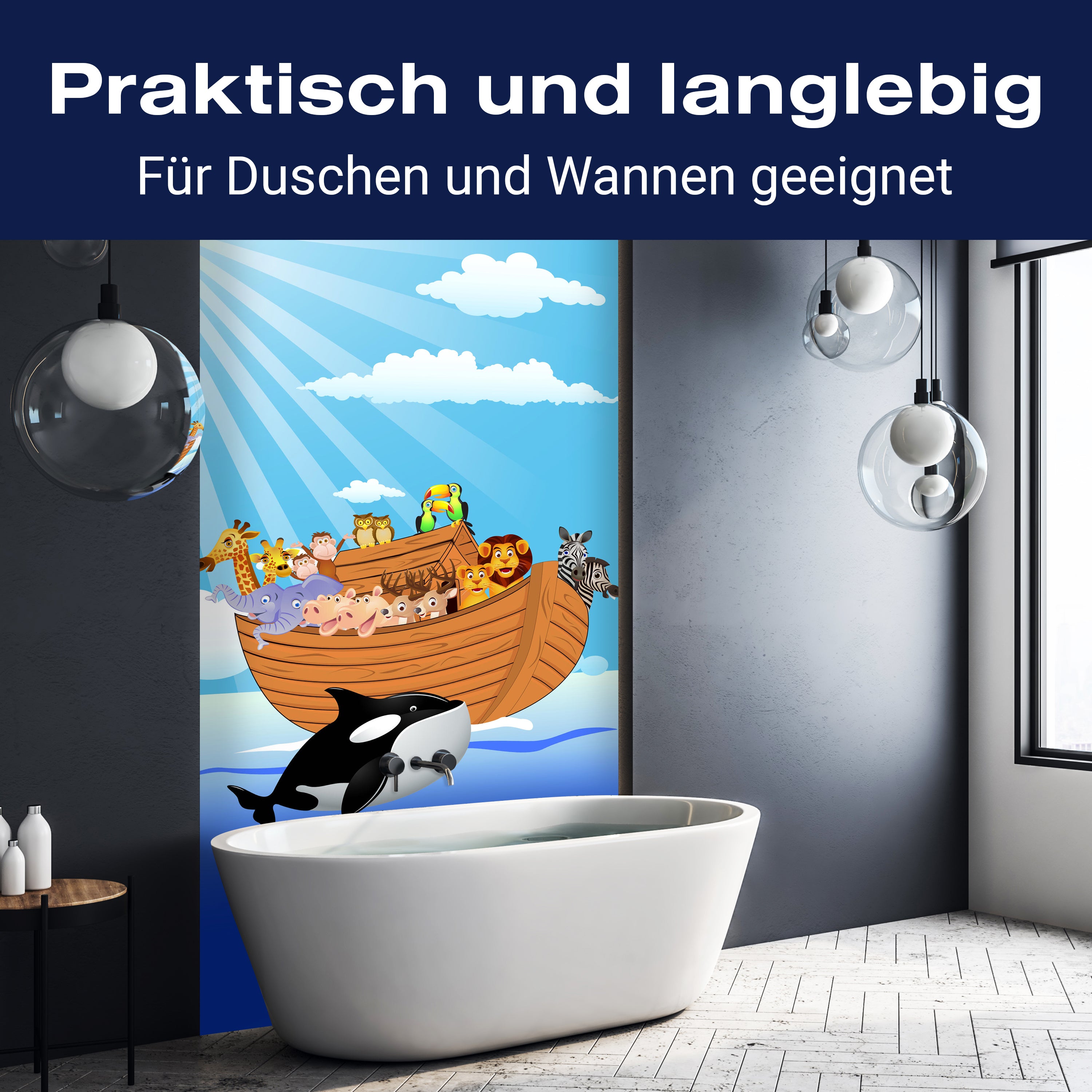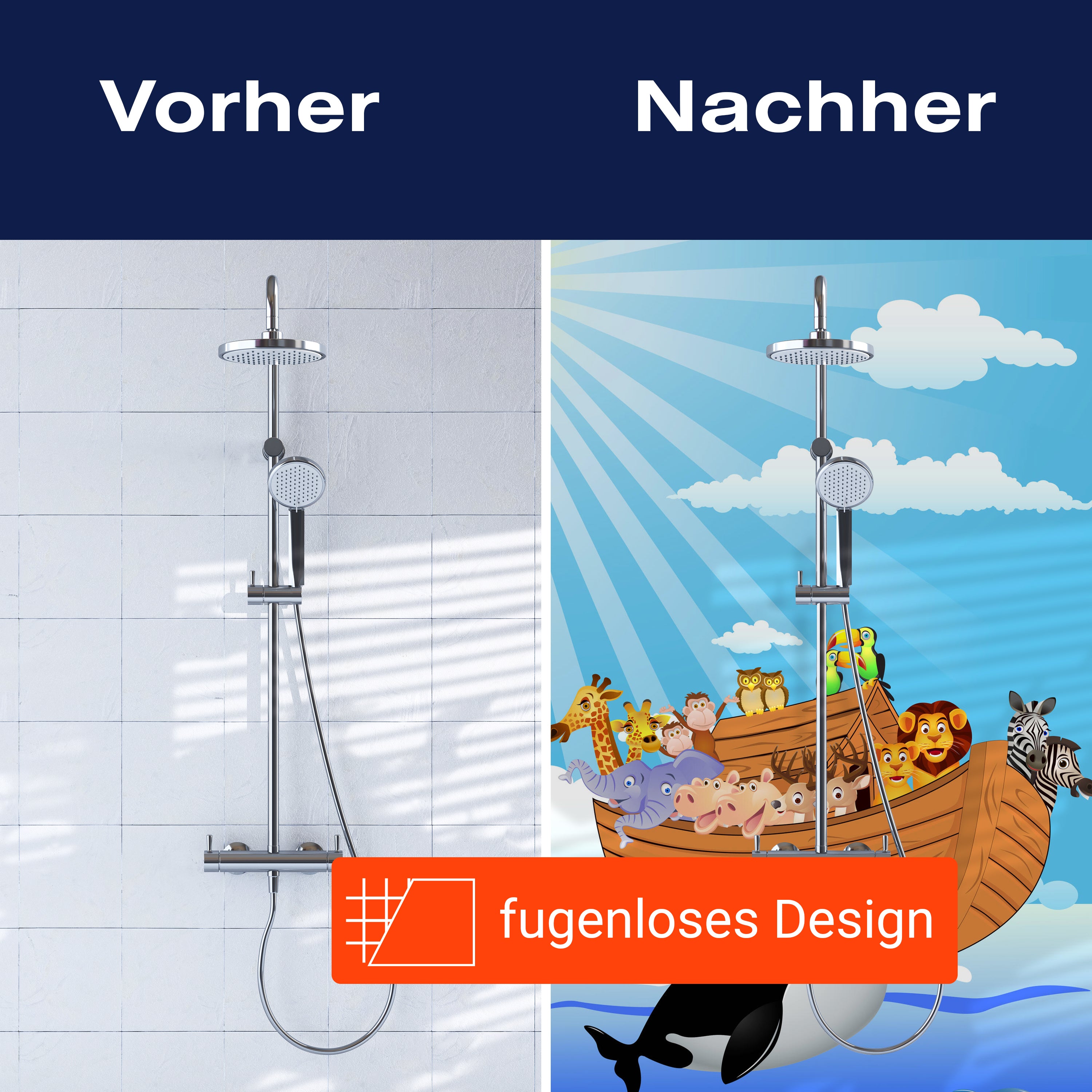 Bist du es leid, auf die langweiligen, schwer zu reinigende Fliesen in deiner Dusche zu schauen? Stell dir vor, wie dein Bad mit einer stilvollen, modernen Rückwand zum Leben erwacht! Unsere Duschwand 'Noahs Arche' ist nicht nur ein optisches Highlight, sondern auch praktisch und pflegeleicht.