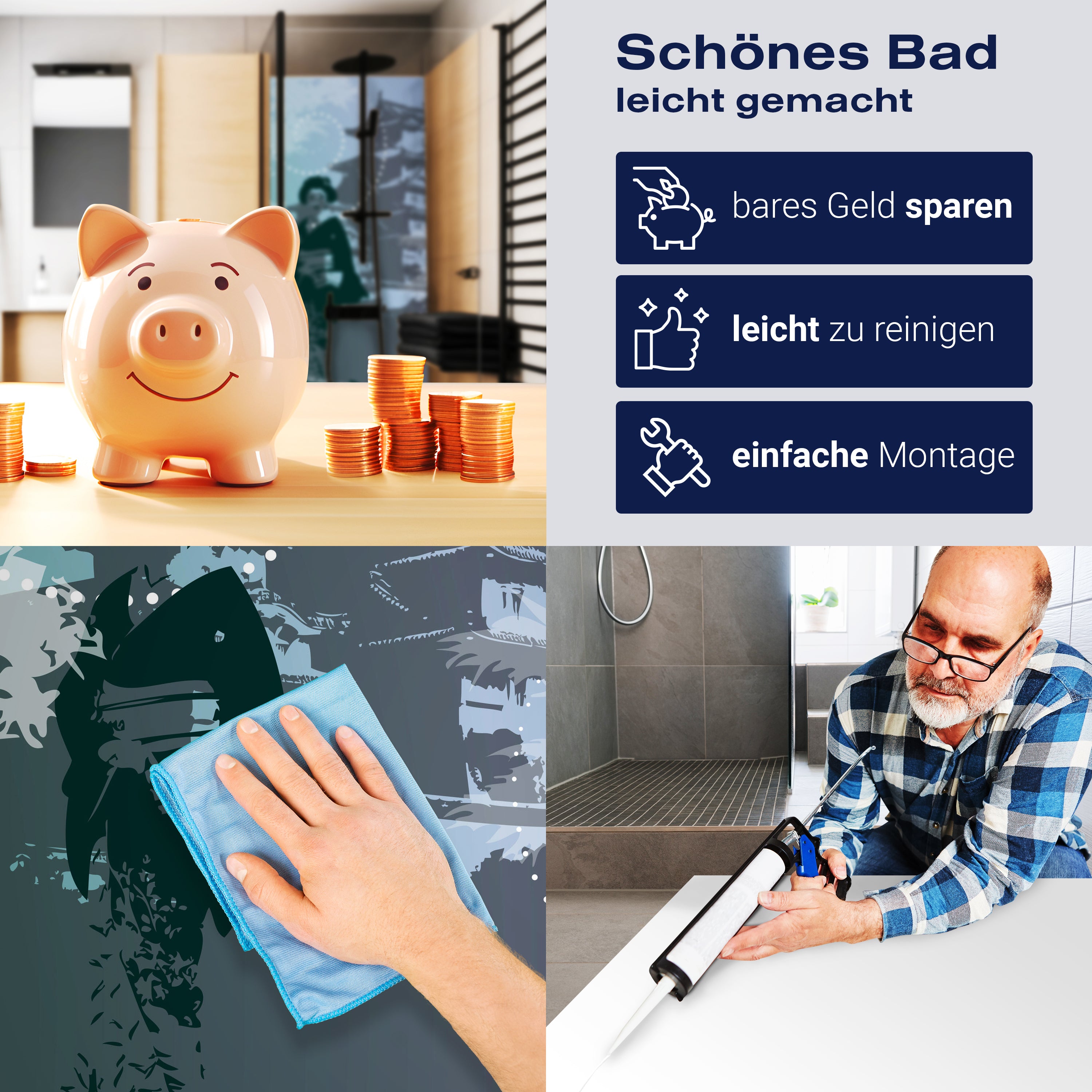 Die Reinigung Deiner Duschwand war noch nie so einfach. In einer Welt, in der Zeit ein kostbares Gut ist, verstehen wir, wie wichtig es ist, Reinigungsprozesse so effizient und mühelos wie möglich zu gestalten. Unsere Duschwände sind speziell dafür entworfen, Dein Leben leichter zu machen. Dank der glatten Oberfläche und der widerstandsfähigen Beschichtung lassen sich Spritzer und Flecken ohne großen Aufwand entfernen – ein schneller Wisch mit einem handelsüblichen Lappen, Spül- oder Wischtuch, und Deine Rückwand sieht aus wie neu.