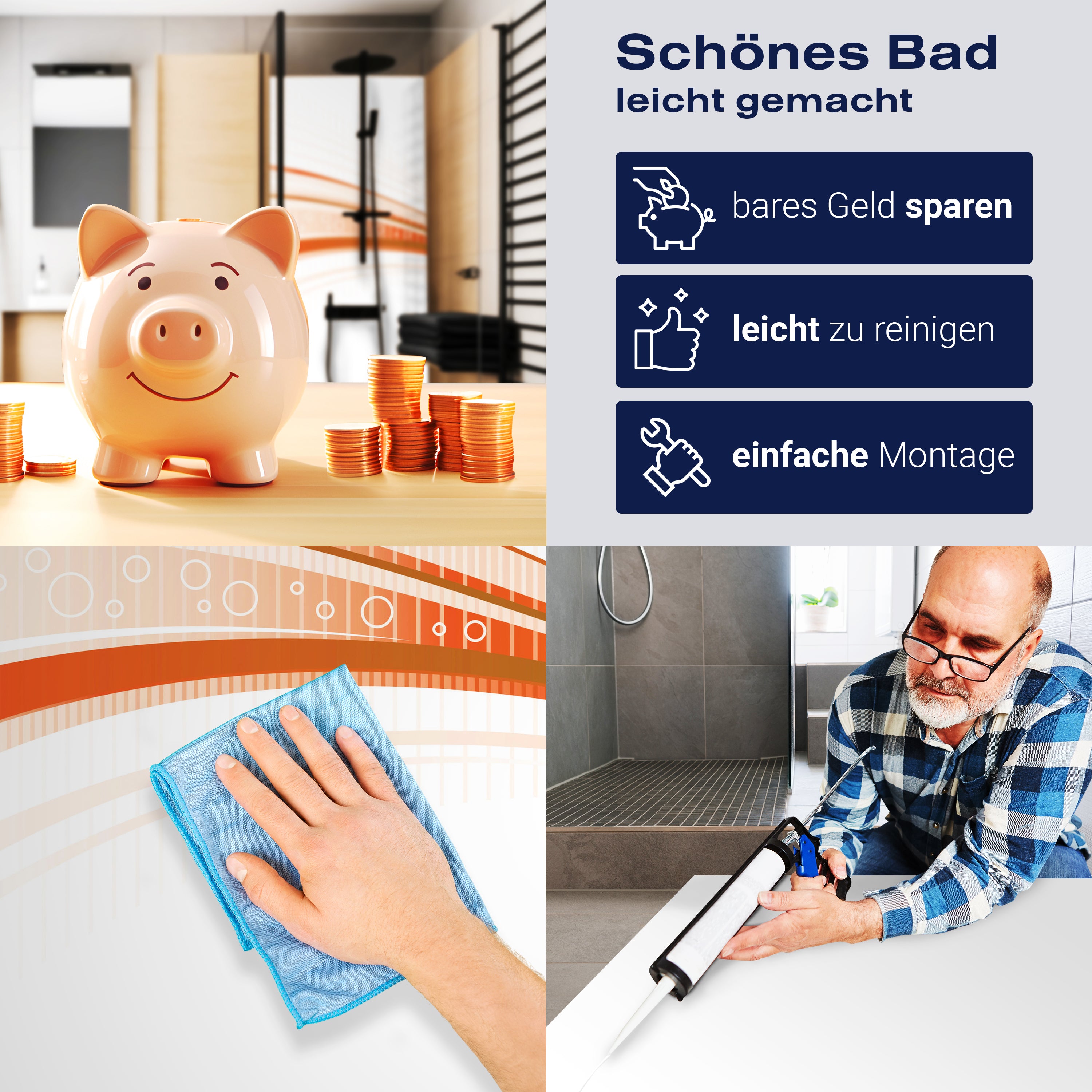 Die Reinigung Deiner Duschwand war noch nie so einfach. In einer Welt, in der Zeit ein kostbares Gut ist, verstehen wir, wie wichtig es ist, Reinigungsprozesse so effizient und mühelos wie möglich zu gestalten. Unsere Duschwände sind speziell dafür entworfen, Dein Leben leichter zu machen. Dank der glatten Oberfläche und der widerstandsfähigen Beschichtung lassen sich Spritzer und Flecken ohne großen Aufwand entfernen – ein schneller Wisch mit einem handelsüblichen Lappen, Spül- oder Wischtuch, und Deine Rückwand sieht aus wie neu.
