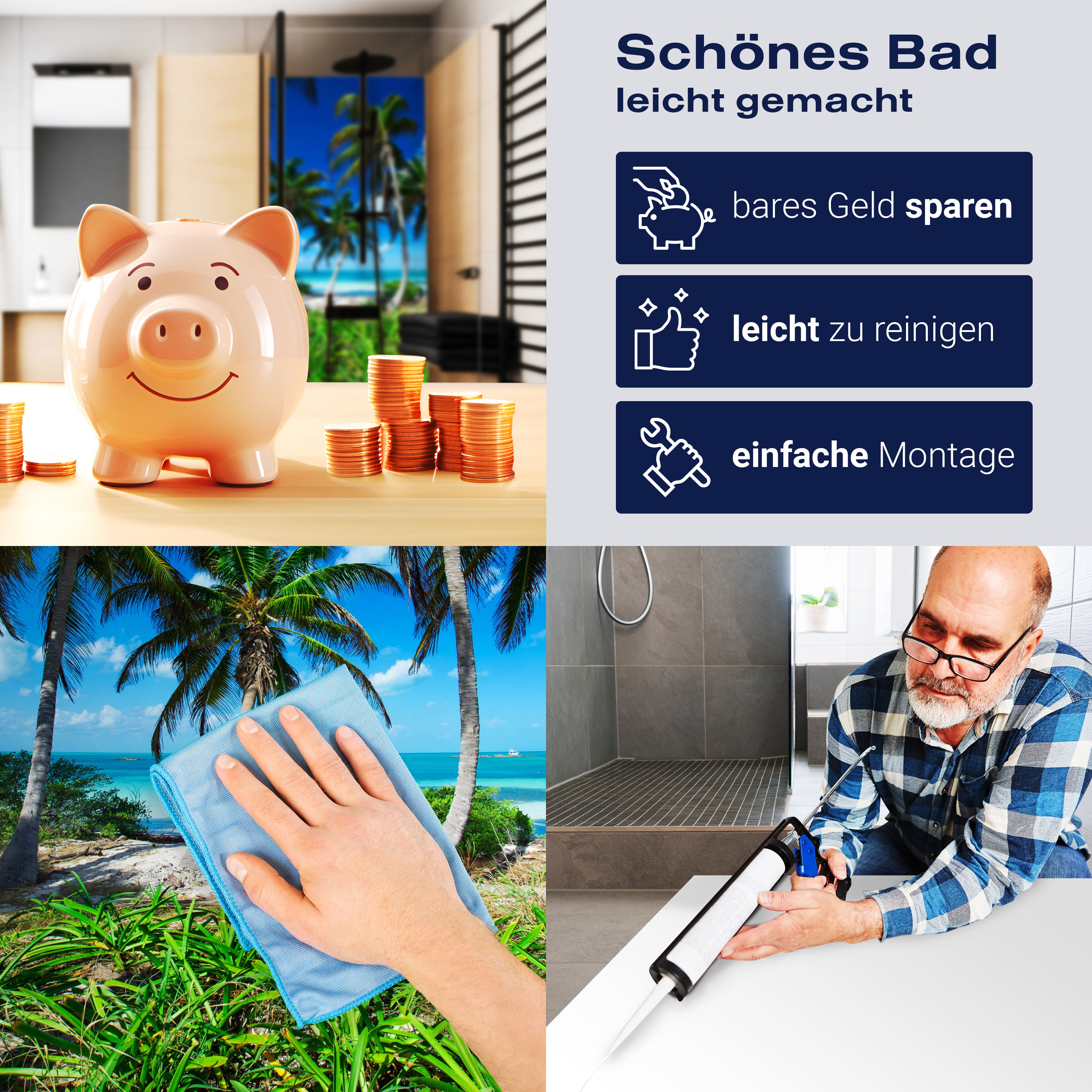 Bist du es leid, auf die langweiligen, schwer zu reinigende Fliesen in deiner Dusche zu schauen? Stell dir vor, wie dein Bad mit einer stilvollen, modernen Rückwand zum Leben erwacht! Unsere Duschwand 'Palmen an einem tropischen Strand' ist nicht nur ein optisches Highlight, sondern auch praktisch und pflegeleicht.