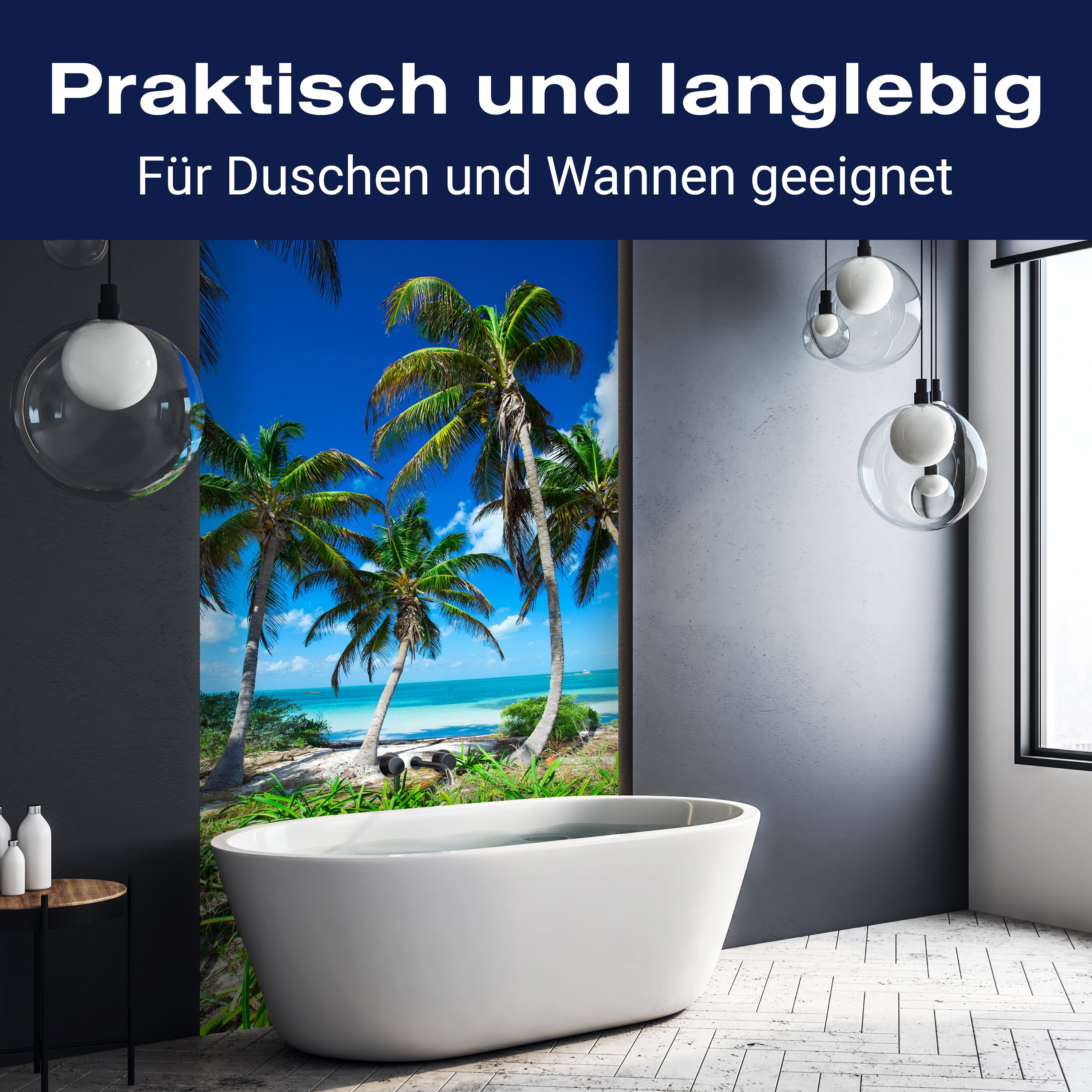 Vergiss die Tage, an denen Spritzer und Flecken deine Dusche ruiniert haben. Mit der Duschrückwand 'Palmen an einem tropischen Strand' gehören solche Sorgen der Vergangenheit an. Das hochwertige Material sorgt dafür, dass deine Dusche gegen Wasser und andere alltägliche Missgeschicke resistent ist. Ein einfacher Wisch, und sie sieht aus wie neu – ohne den Einsatz von aggressiven Reinigungsmitteln.