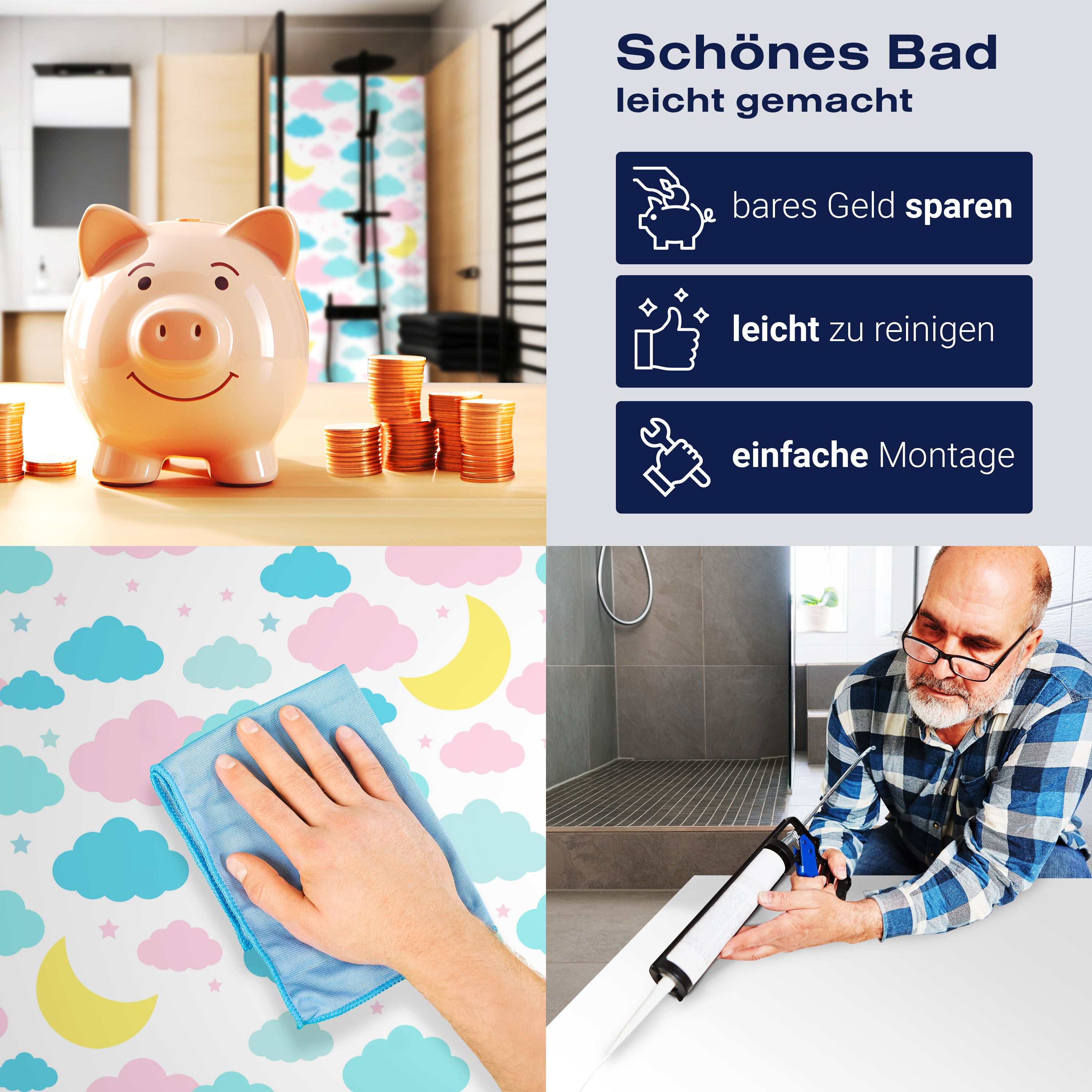 Vergiss die Tage, an denen Spritzer und Flecken deine Dusche ruiniert haben. Mit der Duschrückwand 'Pastellfarbene Nacht' gehören solche Sorgen der Vergangenheit an. Das hochwertige Material sorgt dafür, dass deine Dusche gegen Wasser und andere alltägliche Missgeschicke resistent ist. Ein einfacher Wisch, und sie sieht aus wie neu – ohne den Einsatz von aggressiven Reinigungsmitteln.