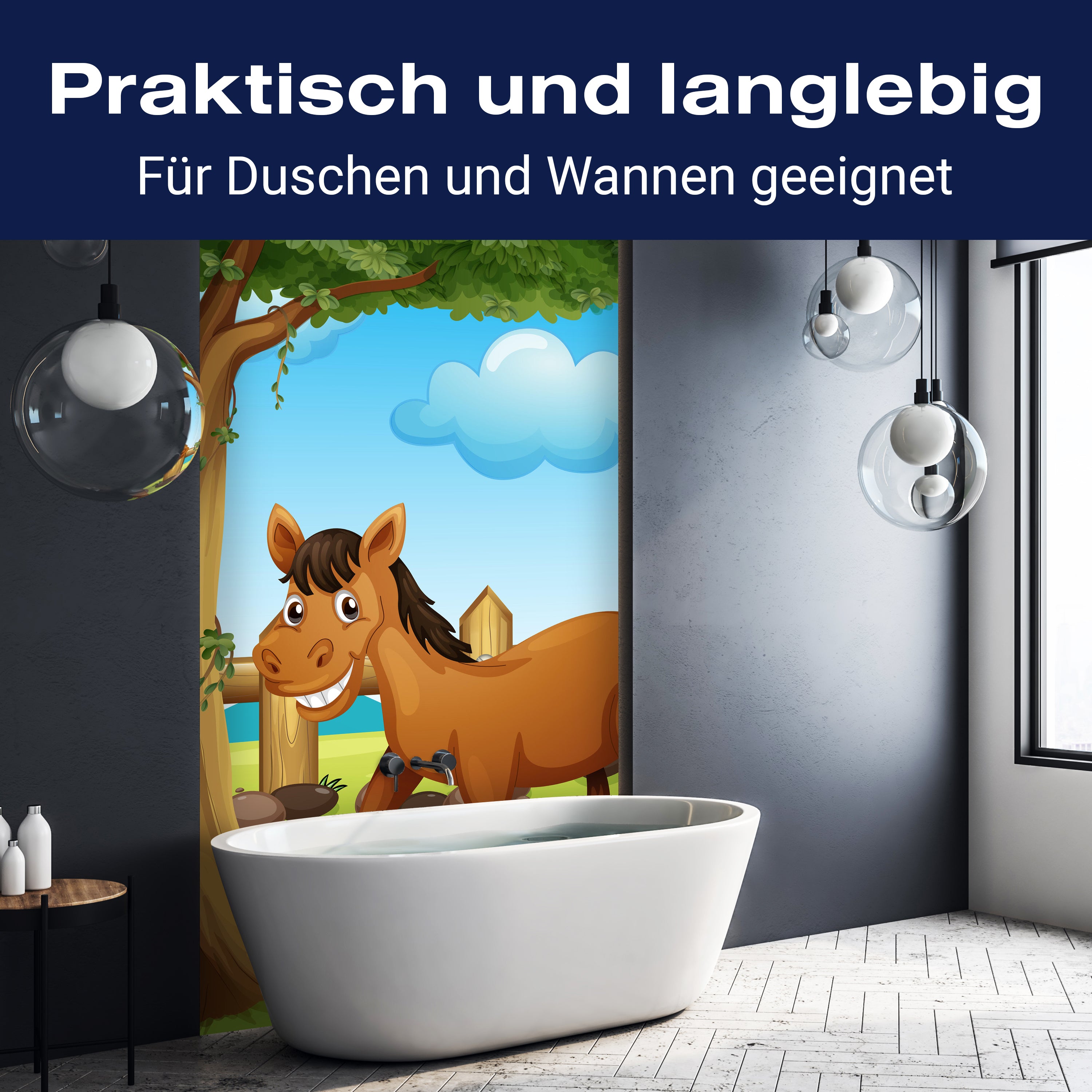 Bist du es leid, auf die langweiligen, schwer zu reinigende Fliesen in deiner Dusche zu schauen? Stell dir vor, wie dein Bad mit einer stilvollen, modernen Rückwand zum Leben erwacht! Unsere Duschwand 'Pferde auf der Wiese' ist nicht nur ein optisches Highlight, sondern auch praktisch und pflegeleicht.