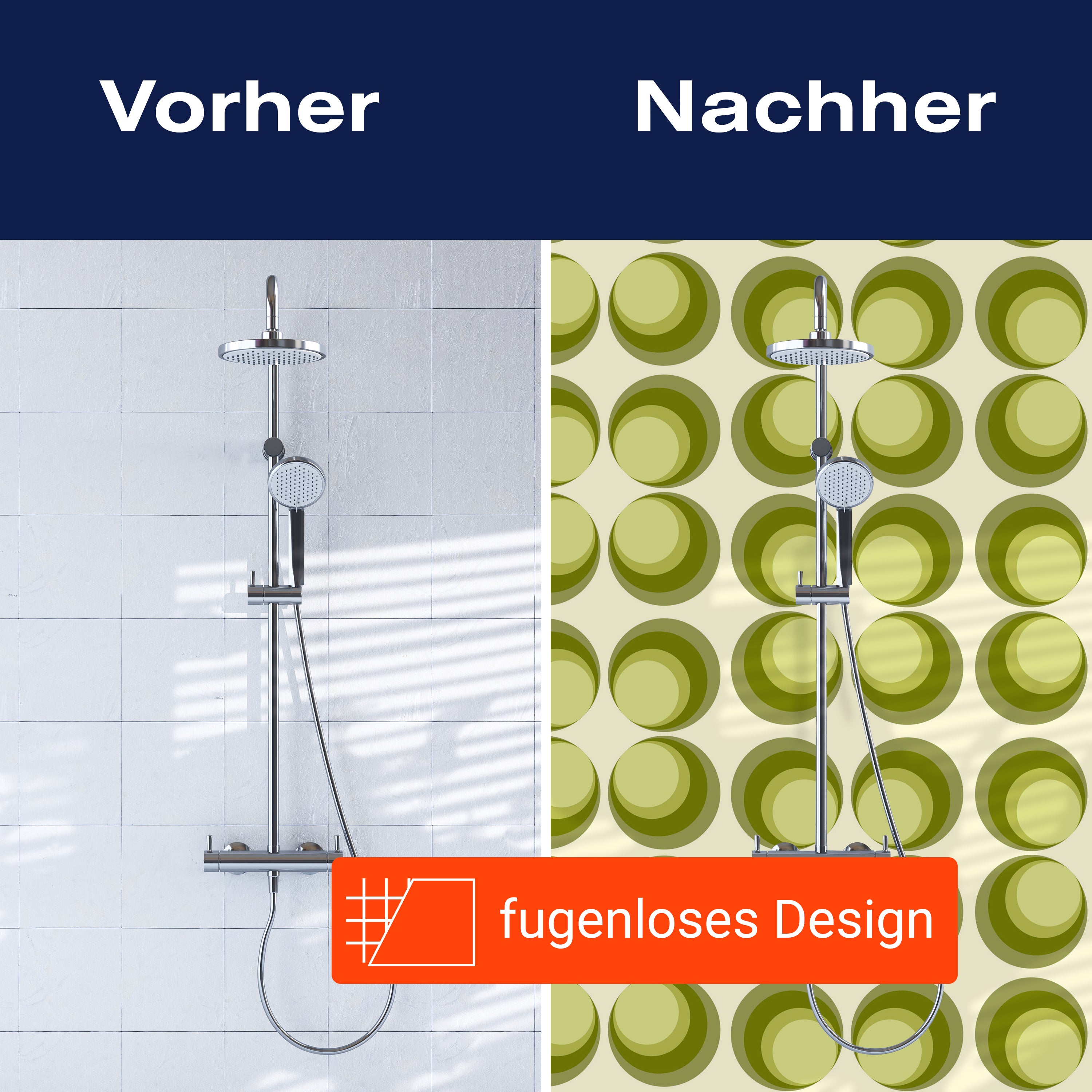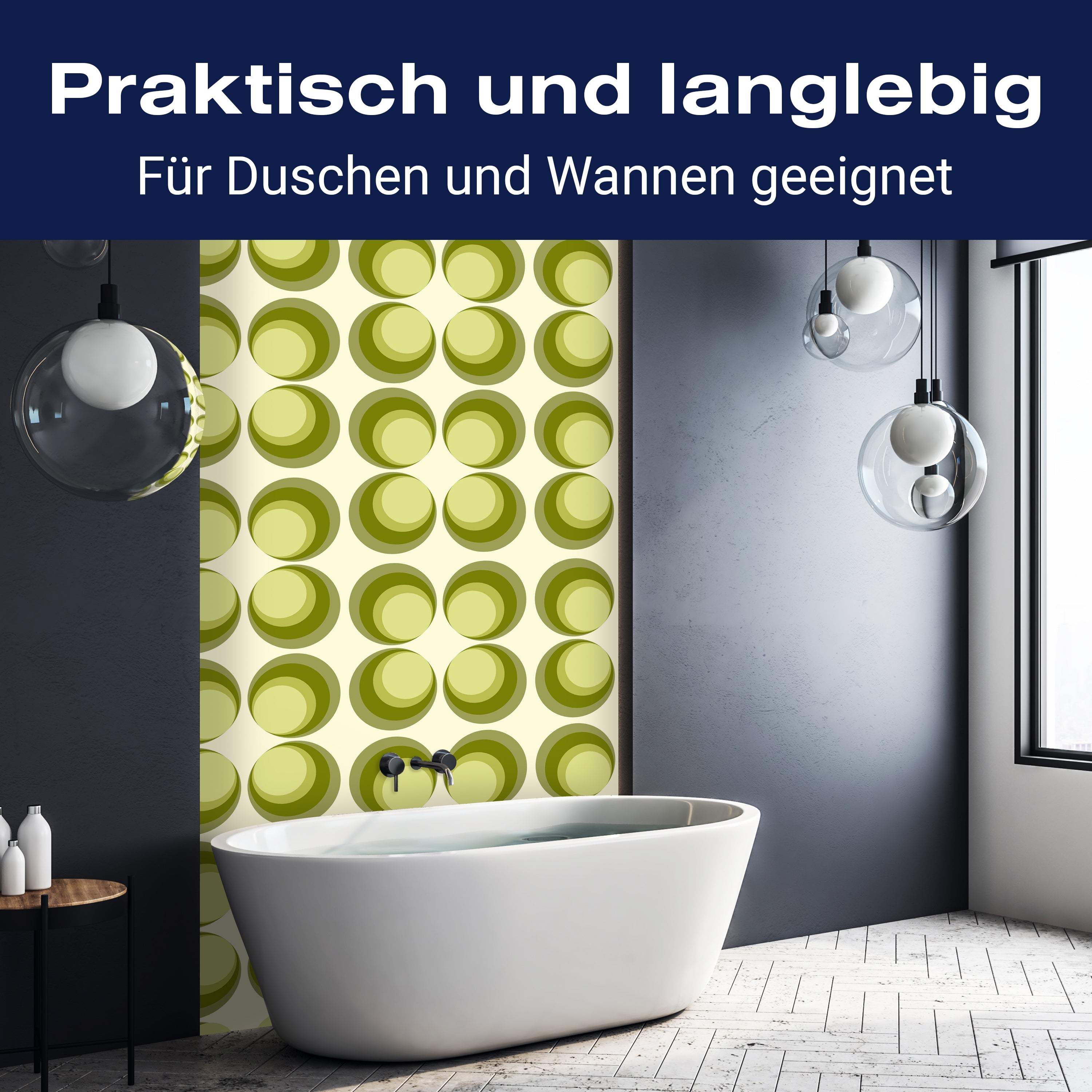 Bist du es leid, auf die langweiligen, schwer zu reinigende Fliesen in deiner Dusche zu schauen? Stell dir vor, wie dein Bad mit einer stilvollen, modernen Rückwand zum Leben erwacht! Unsere Duschwand 'Retrokreise Grün' ist nicht nur ein optisches Highlight, sondern auch praktisch und pflegeleicht.
