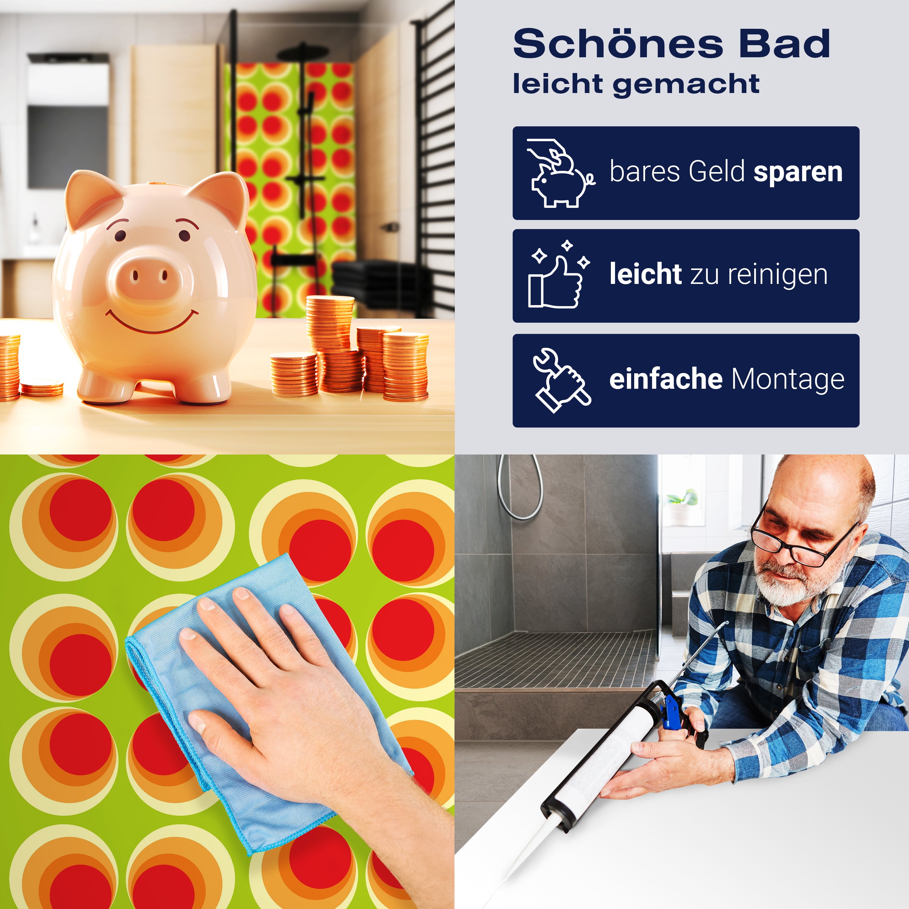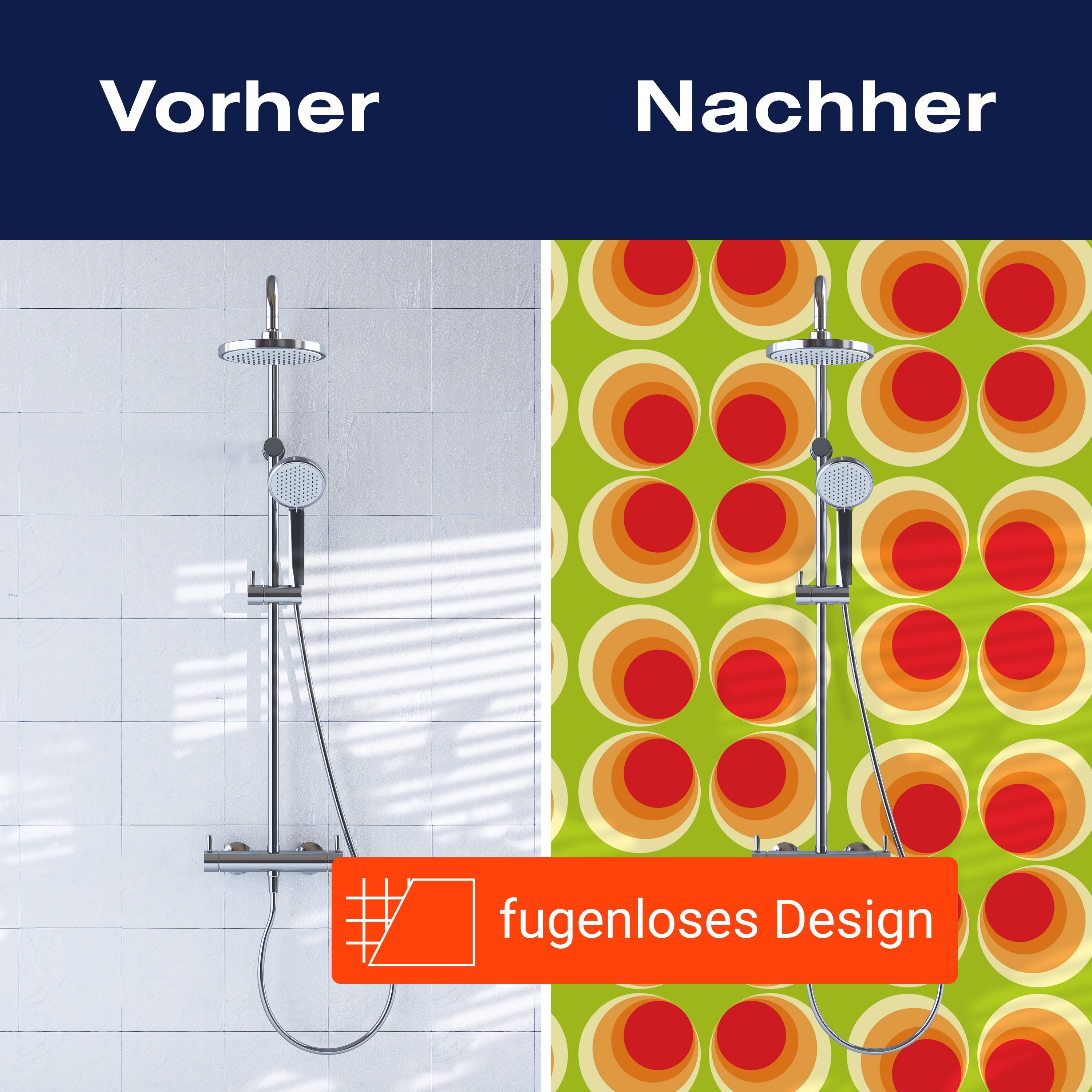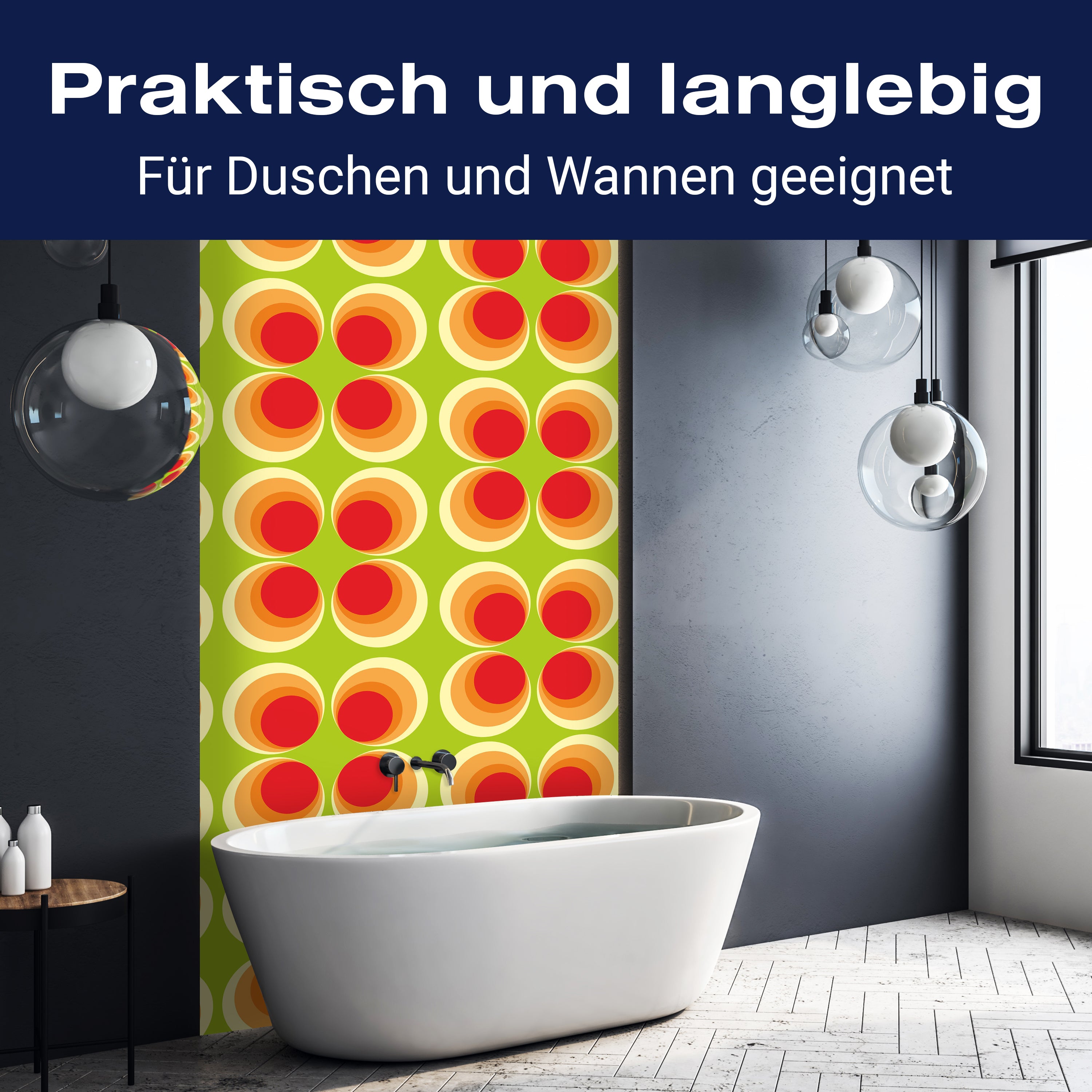 Bist du es leid, auf die langweiligen, schwer zu reinigende Fliesen in deiner Dusche zu schauen? Stell dir vor, wie dein Bad mit einer stilvollen, modernen Rückwand zum Leben erwacht! Unsere Duschwand 'Retrokreise Orange Muster' ist nicht nur ein optisches Highlight, sondern auch praktisch und pflegeleicht.