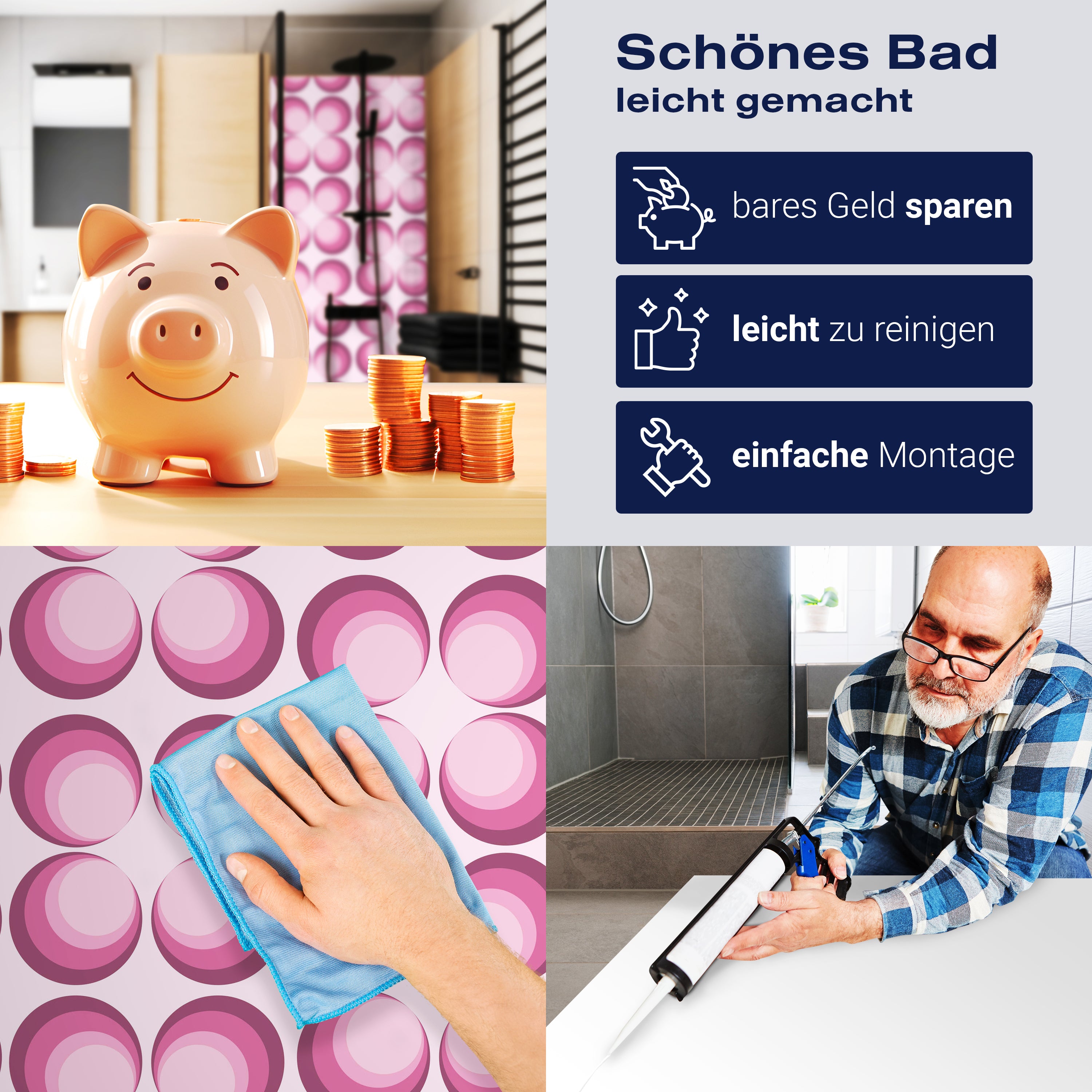 Vergiss die Tage, an denen Spritzer und Flecken deine Dusche ruiniert haben. Mit der Duschrückwand 'Retrokreise Rosa Muster' gehören solche Sorgen der Vergangenheit an. Das hochwertige Material sorgt dafür, dass deine Dusche gegen Wasser und andere alltägliche Missgeschicke resistent ist. Ein einfacher Wisch, und sie sieht aus wie neu – ohne den Einsatz von aggressiven Reinigungsmitteln.